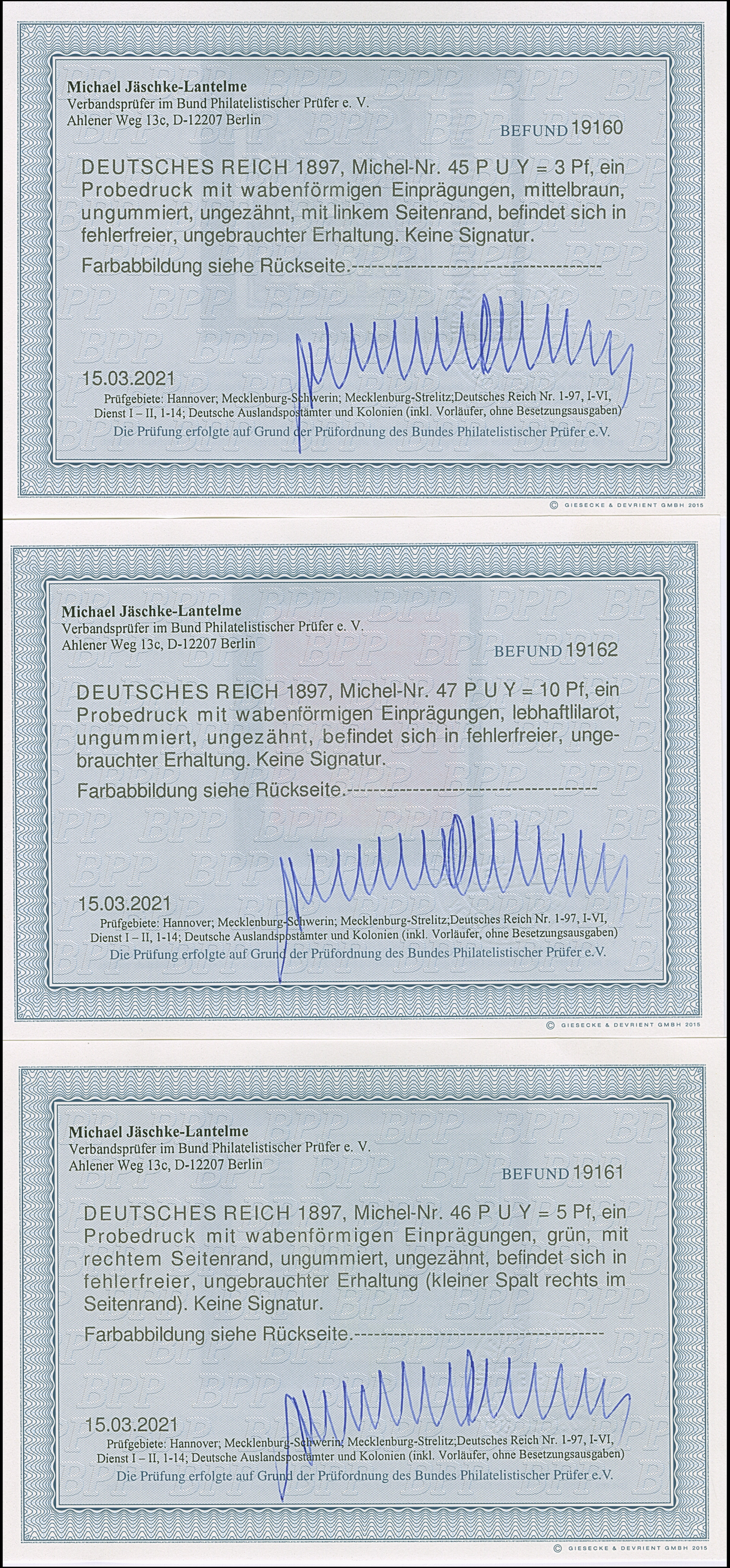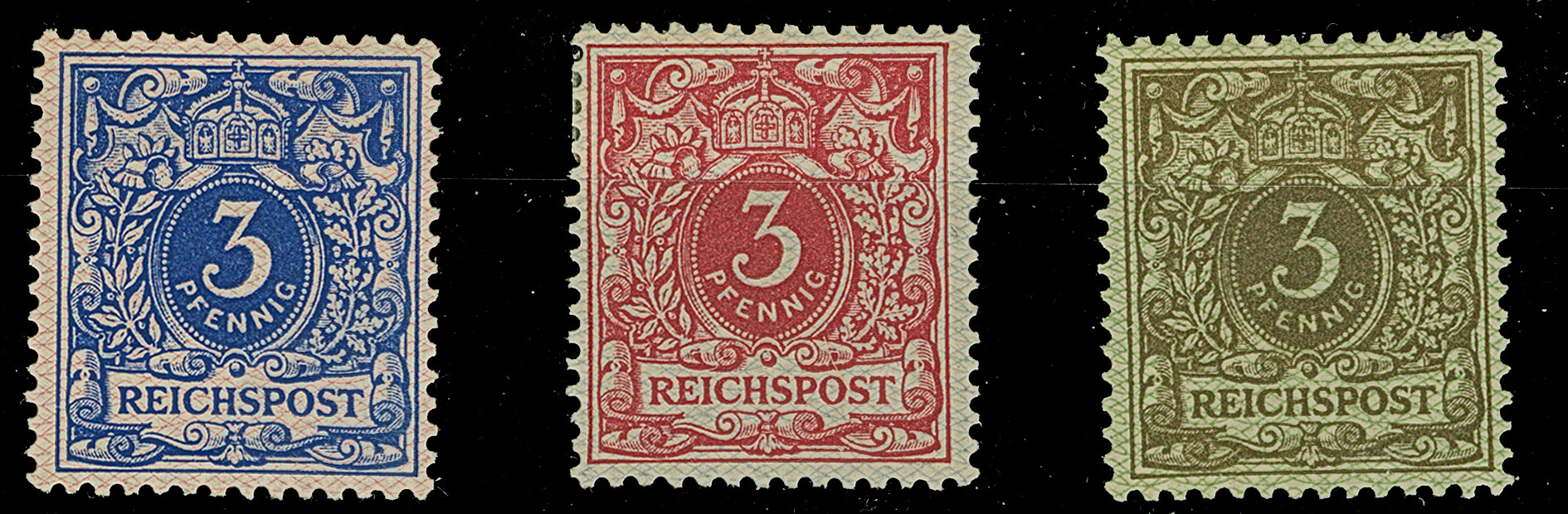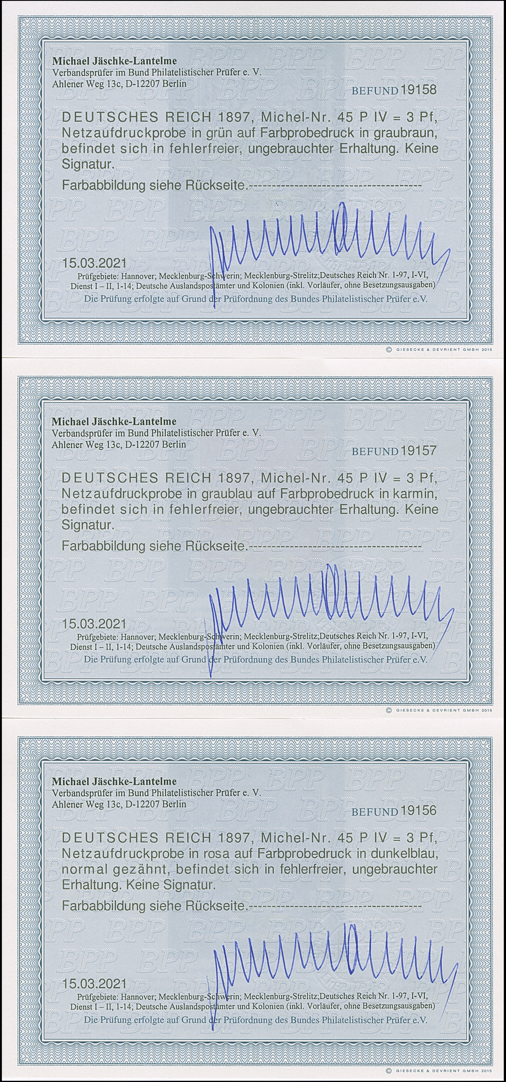 1890, Krone/Adler 3 Pfg. als Netzaufdruckprobe rosa auf dunkelblau, graublau auf karmin und grün auf graubraun, ungebraucht, in einwandfreier Erhaltung, jeweils mit Fotobefund Jäschke-L. BPP (2021)