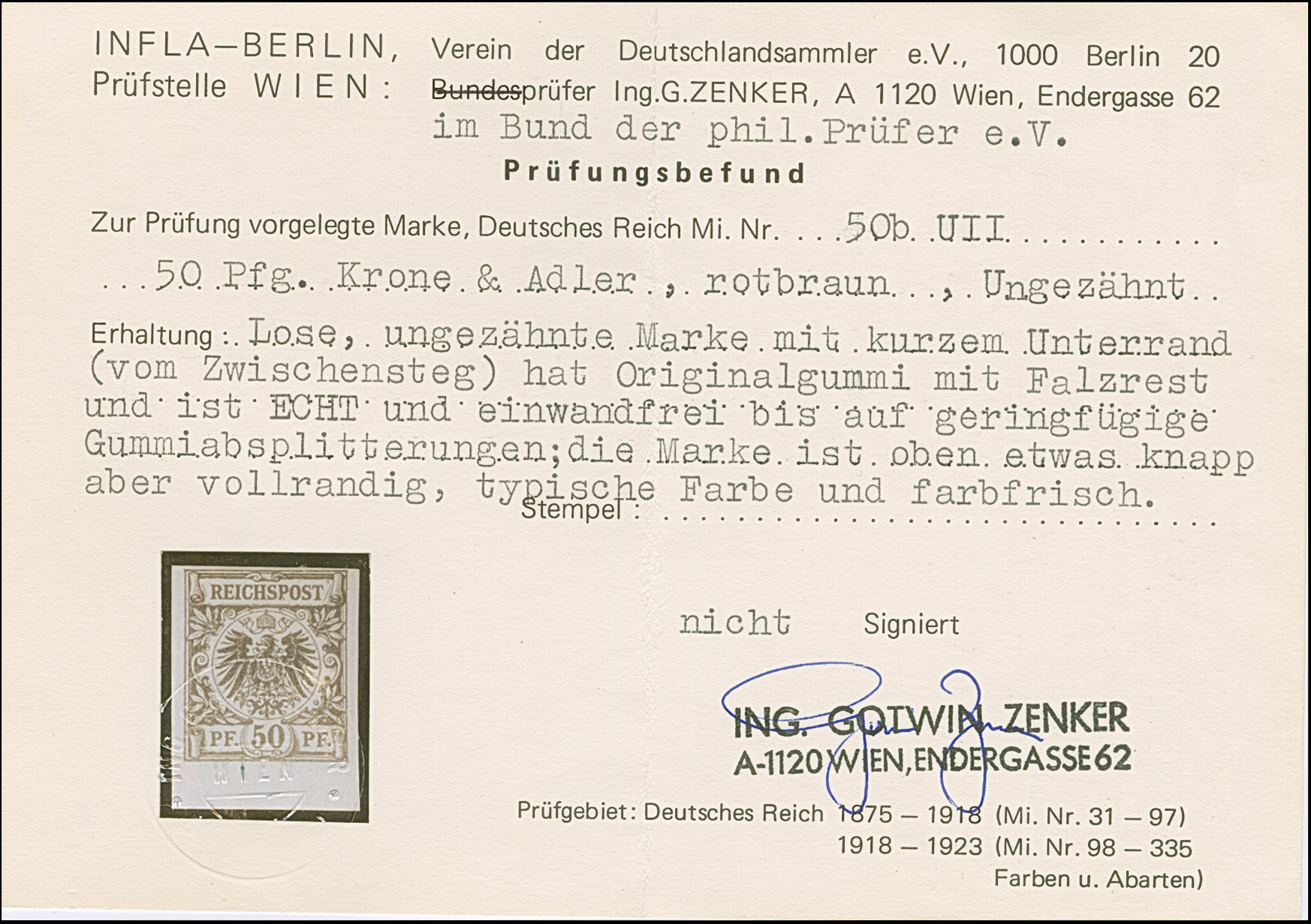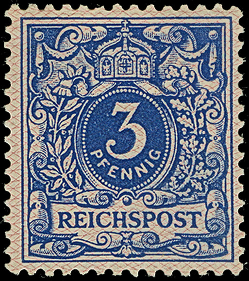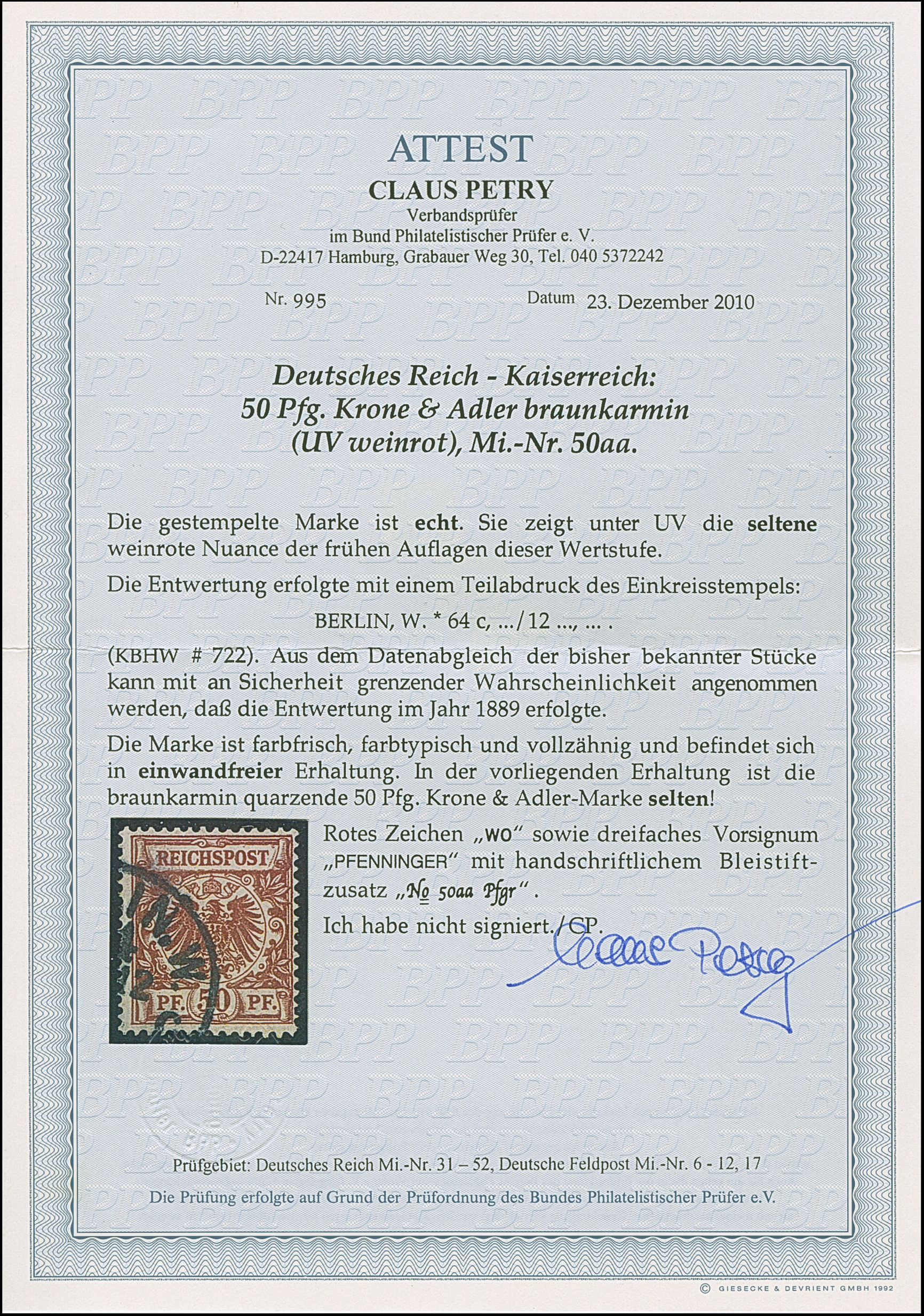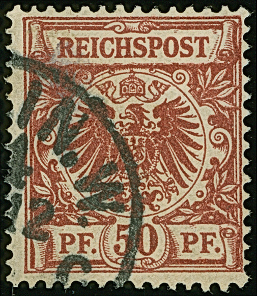 50 Pfg. bräunlichkarmin (weinrot quarzend), sauber gestempelt und in tadelloser Erhaltung. Der Stempel “BERLIN W64 *c…12…” stammt vermutlich aus 1899. Ein sehr schönes Exemplar dieser seltenen Farbe, u.a. sign. Pfenninger und Fotoattest Petry BPP (2010)