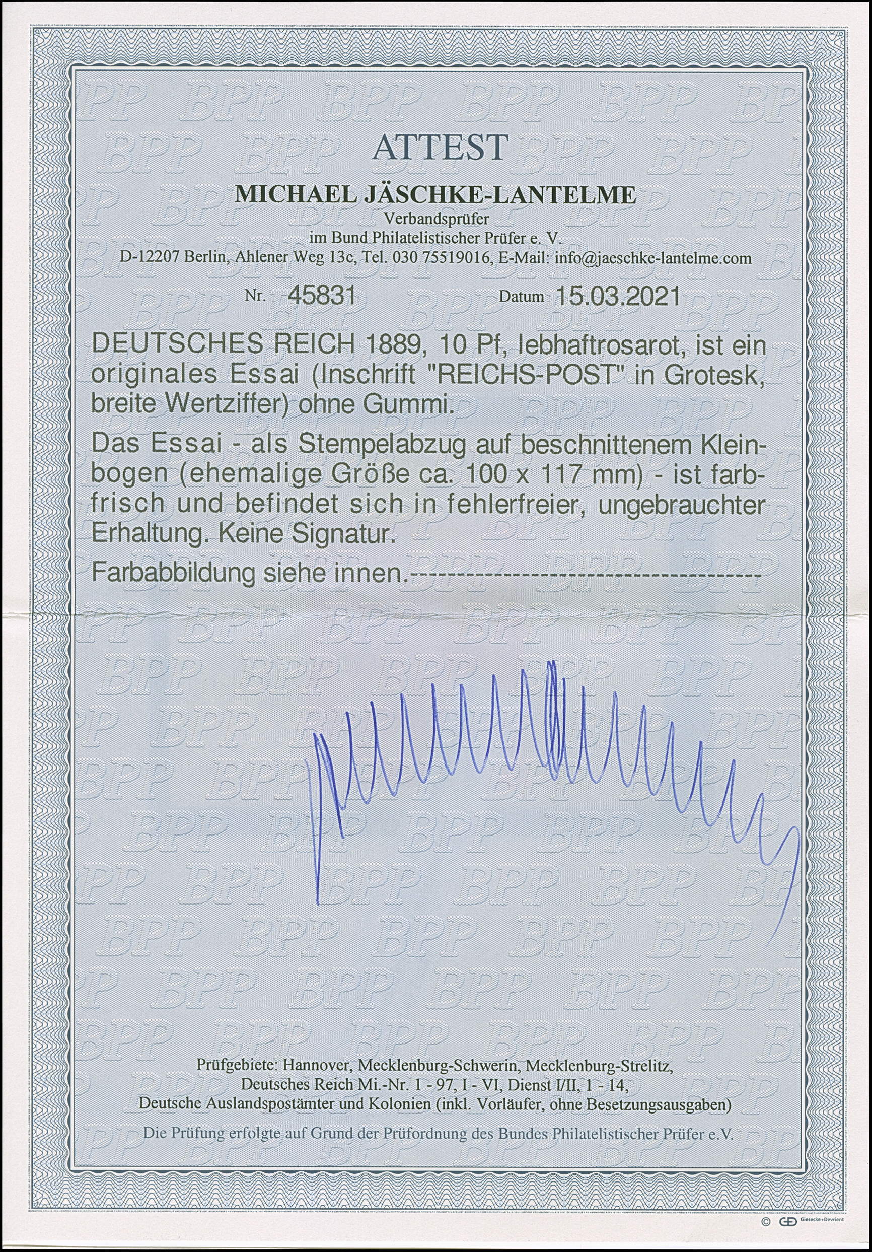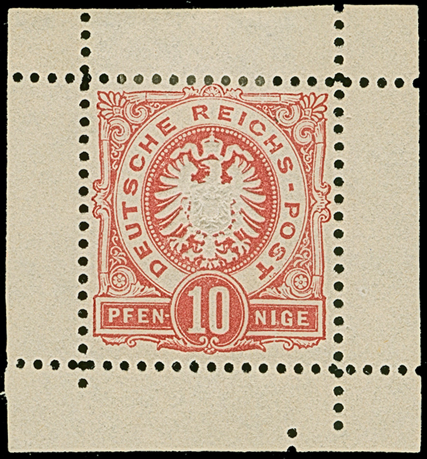 1890, Krone/Adler 10 Pfg. lebhaftrosarot als ungezähntes Essay mit Inschrift “REICHS-POST” in Grotesk als Einzelabzug im beschnittenen Kleinbogen, ungebraucht ohne Gummi, in einwandfreier Erhaltung, Fotoattest Jäschke BPP (2021)