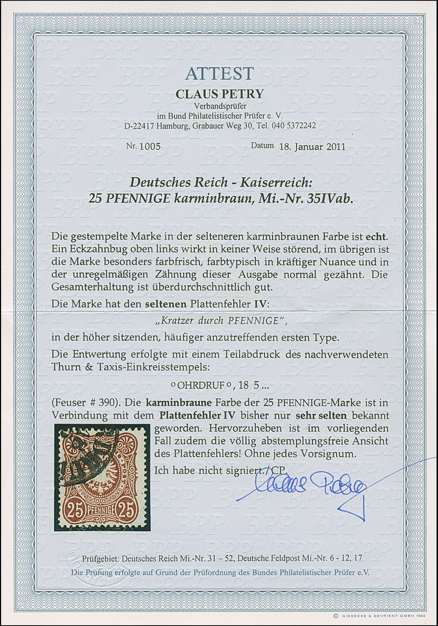 25 Pfge karminbraun mit Plattenfehler “Kratzer durch PFENNIGE”, besonders farbfrische Marke, sauber gestempelt und bis auf einen winzigem Eckzahnbug in einwandfreier Erhaltung. Ein besonders schönes Exemplar, in dieser Kombination sehr selten, Fotoattest Petry BPP (2011)