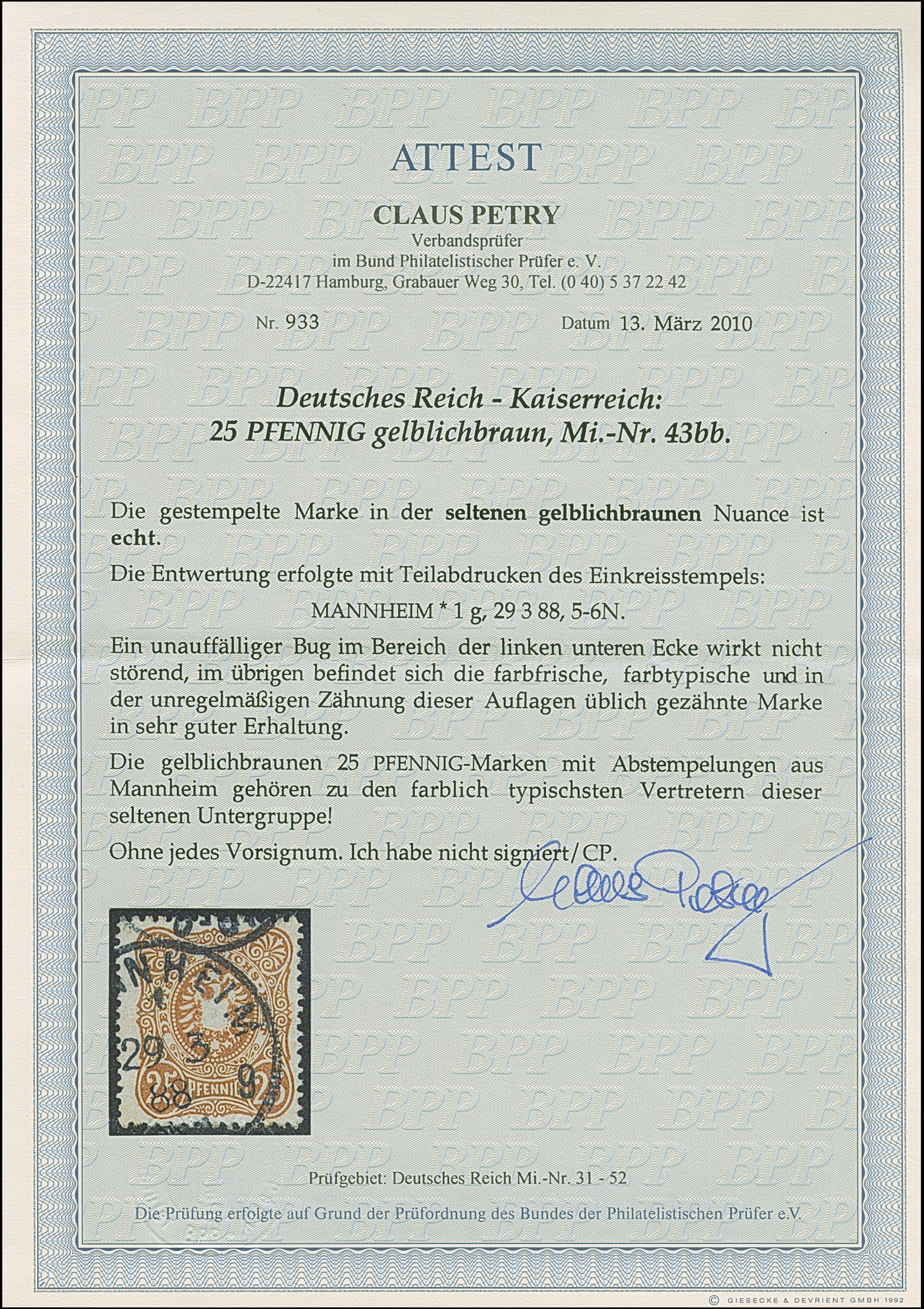 25 Pfg. gelblichbraun mit klarem EKr. “(MAN)NHEIM 1 *g 29.3.88”, die farbfrische Marke hat einen unauffälligen, bildseitig nicht sichtbaren Eckbug und ist üblich gezähnt, ansonsten in einwandfreier Erhaltung.. Ein optisch sehr ansprechendes Exemplar mit dieser sehr seltenen Farbe, Fotoattest Petry BPP (2010)