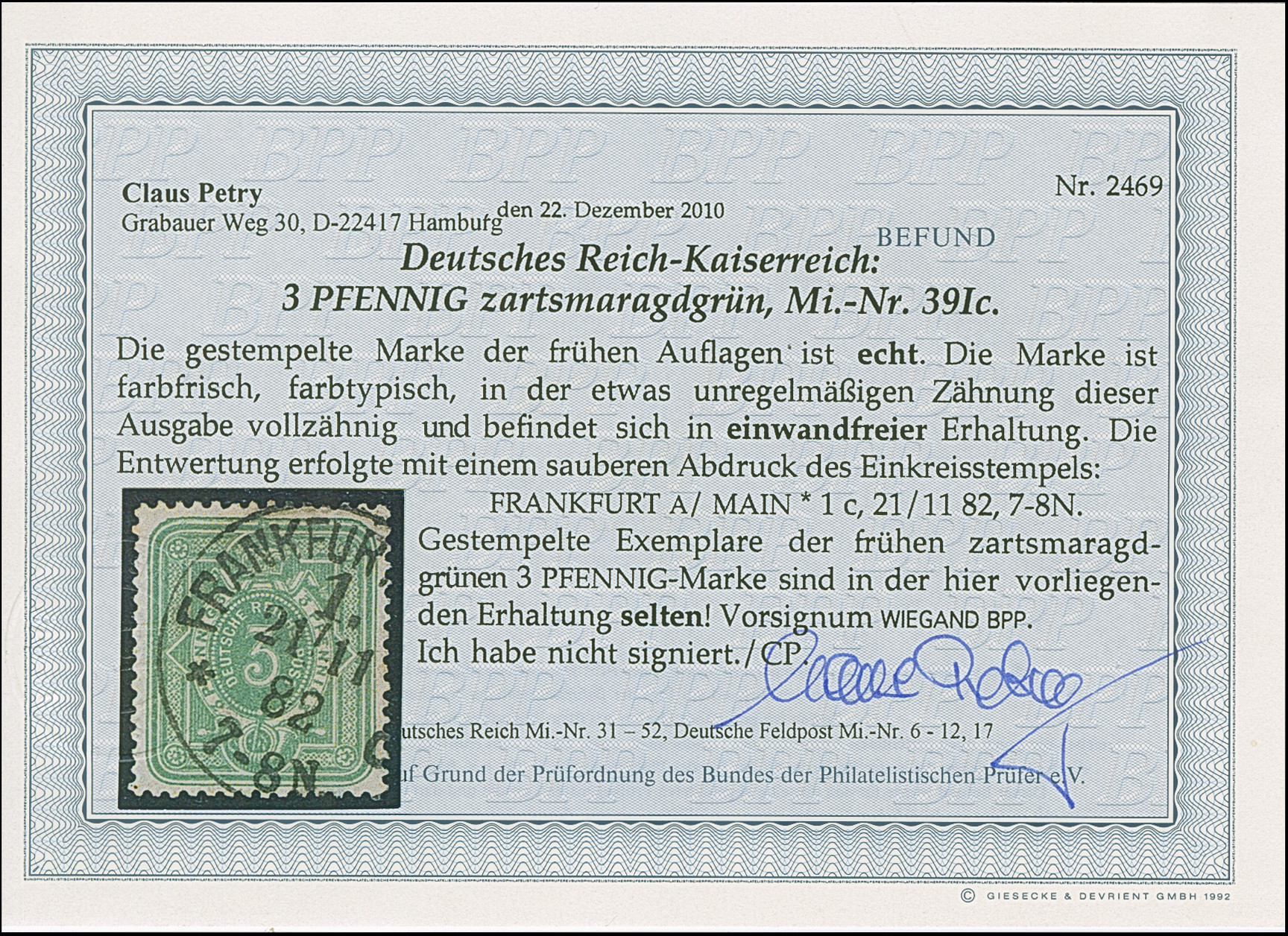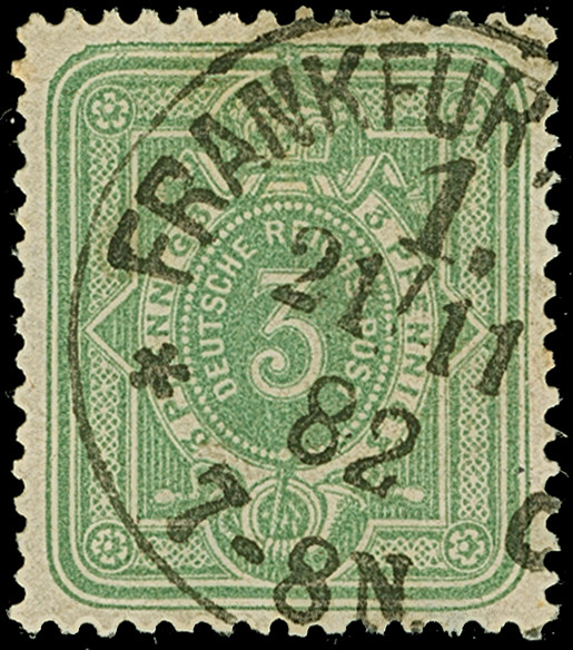 3 Pfg. zartsmaragdgrün, farbfrisch und typisch gezähnt mit klarem EKr. “FRANKFURT A/MAIN 1 *c 21.11.82” und in einwandfreier Erhaltung. Ein sehr schönes Exemplar der frühen Auflage, Fotobefund Petry BPP (2010)