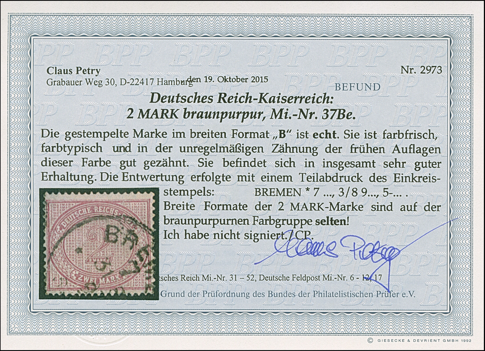 2 M. braunpurpur im breiten Format, farbfrisch und typisch gezähnt, gestempelt, in einwandfreier Erhaltung. Breite Formate der 2 M. braunpurpur sind selten, Fotobefund Petry BPP (2015)
