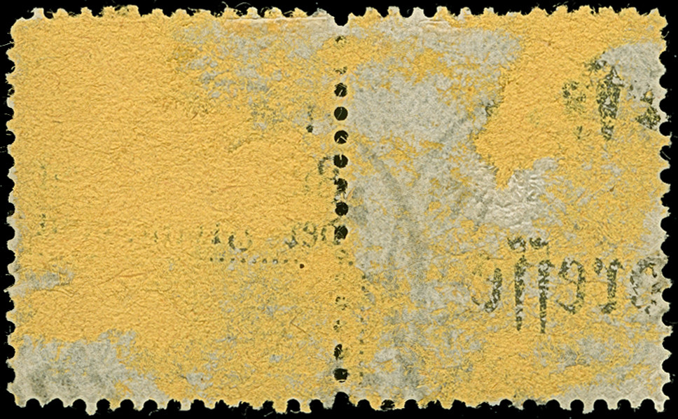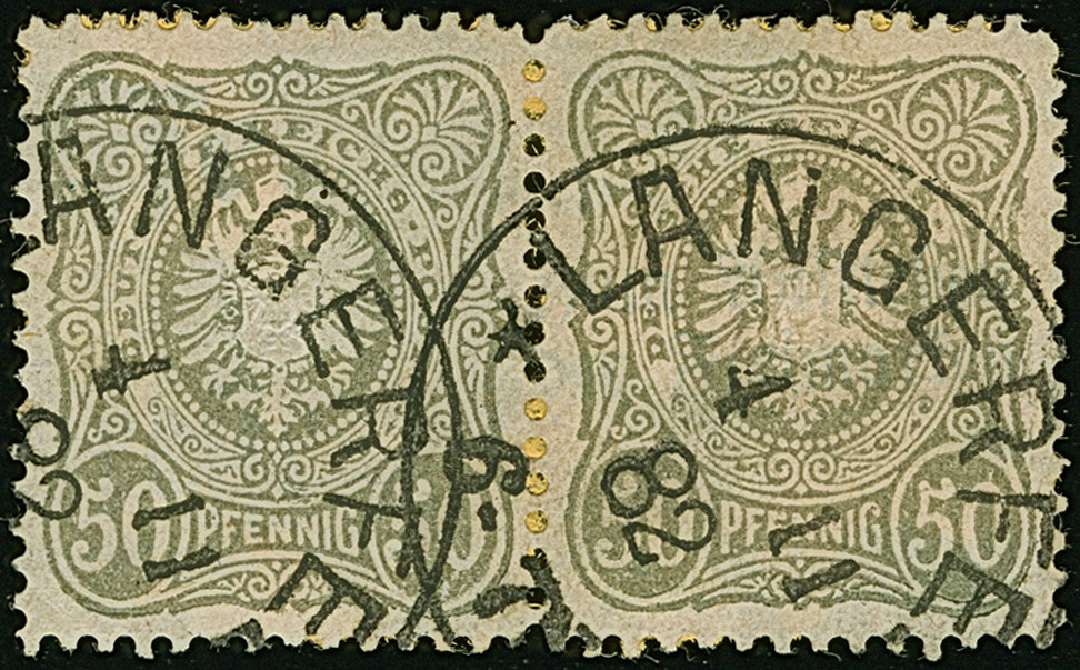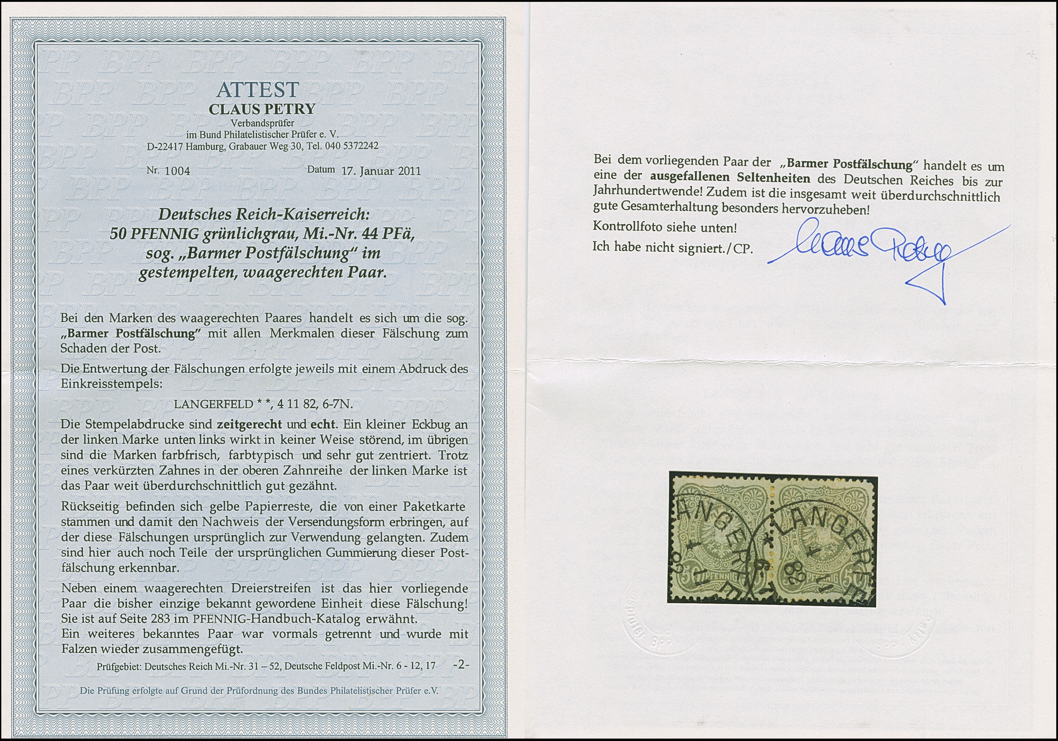 Barmer Postfälschung 50 Pfg. grünlichgrau im waagerechten Paar mit jeweils klarem EKr. “LANGERFELD ** 4.11.82” und rückseitig Papierreste einer Paketkarte. Die farbfrischen Marken sind sehr gut gezähnt, die linke Marke hat einen kleinen Eckbug und einen verkürzten Zahn, ansonsten in einwandfreier Erhaltung. Bis auf einen waagerechten Dreierstreifen ist bisher keine weitere Einheit bekannt und als Paar somit einmalig. Die Barmer Postfälschung ist als Paar eine der ganz großen Seltenheiten aus der Pfennig-Zeit, Fotoattest Petry BPP (2011)
