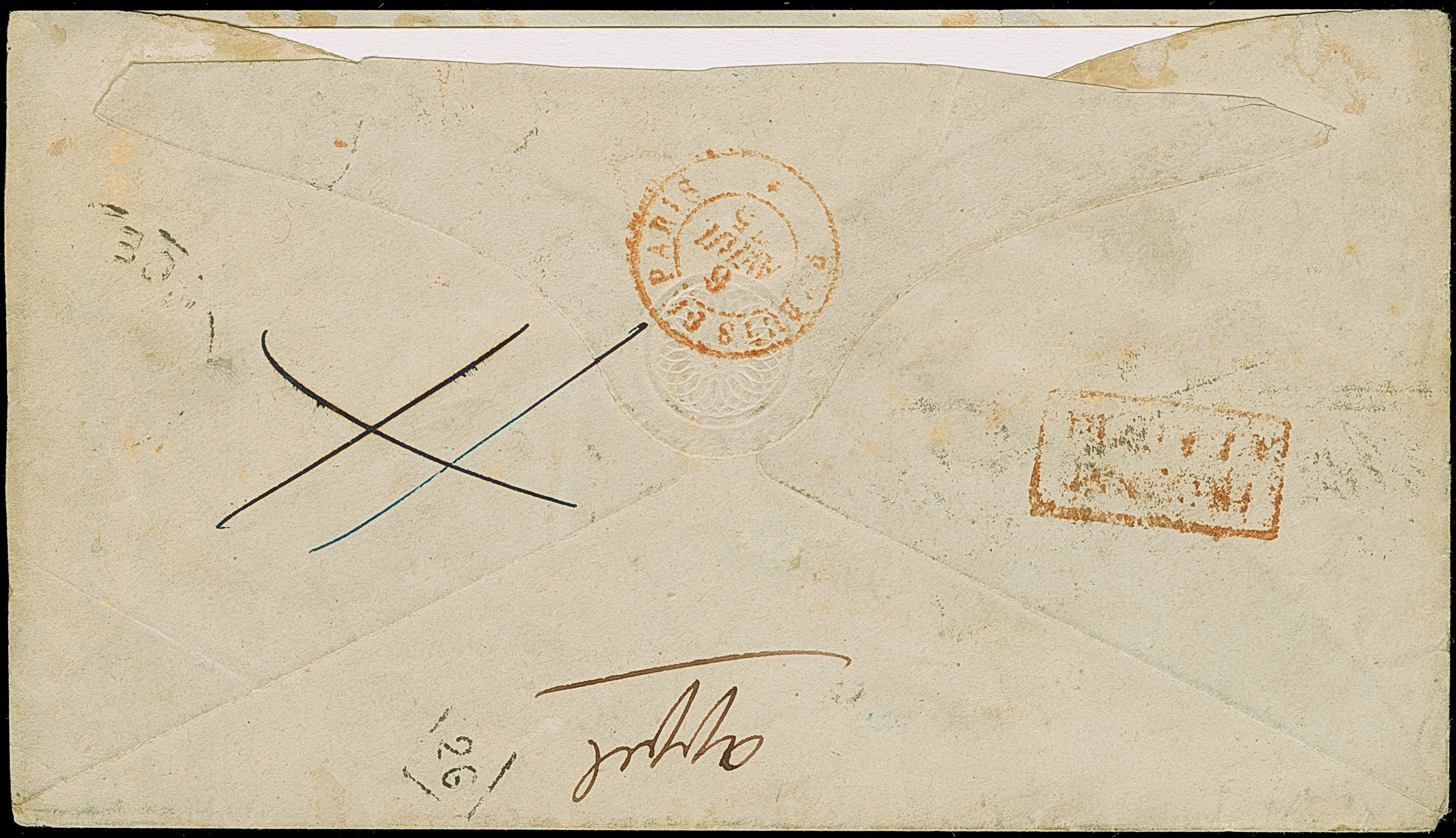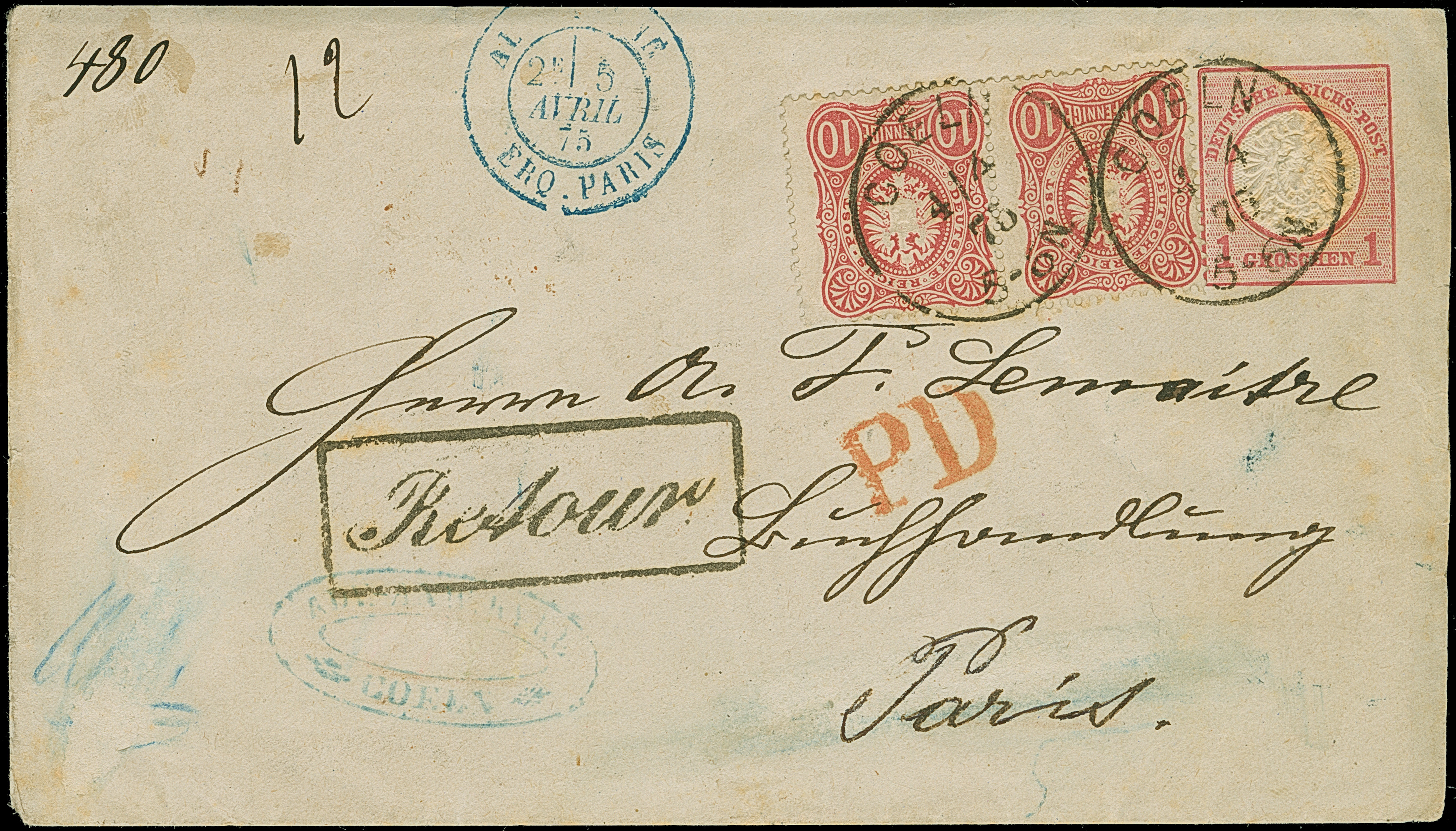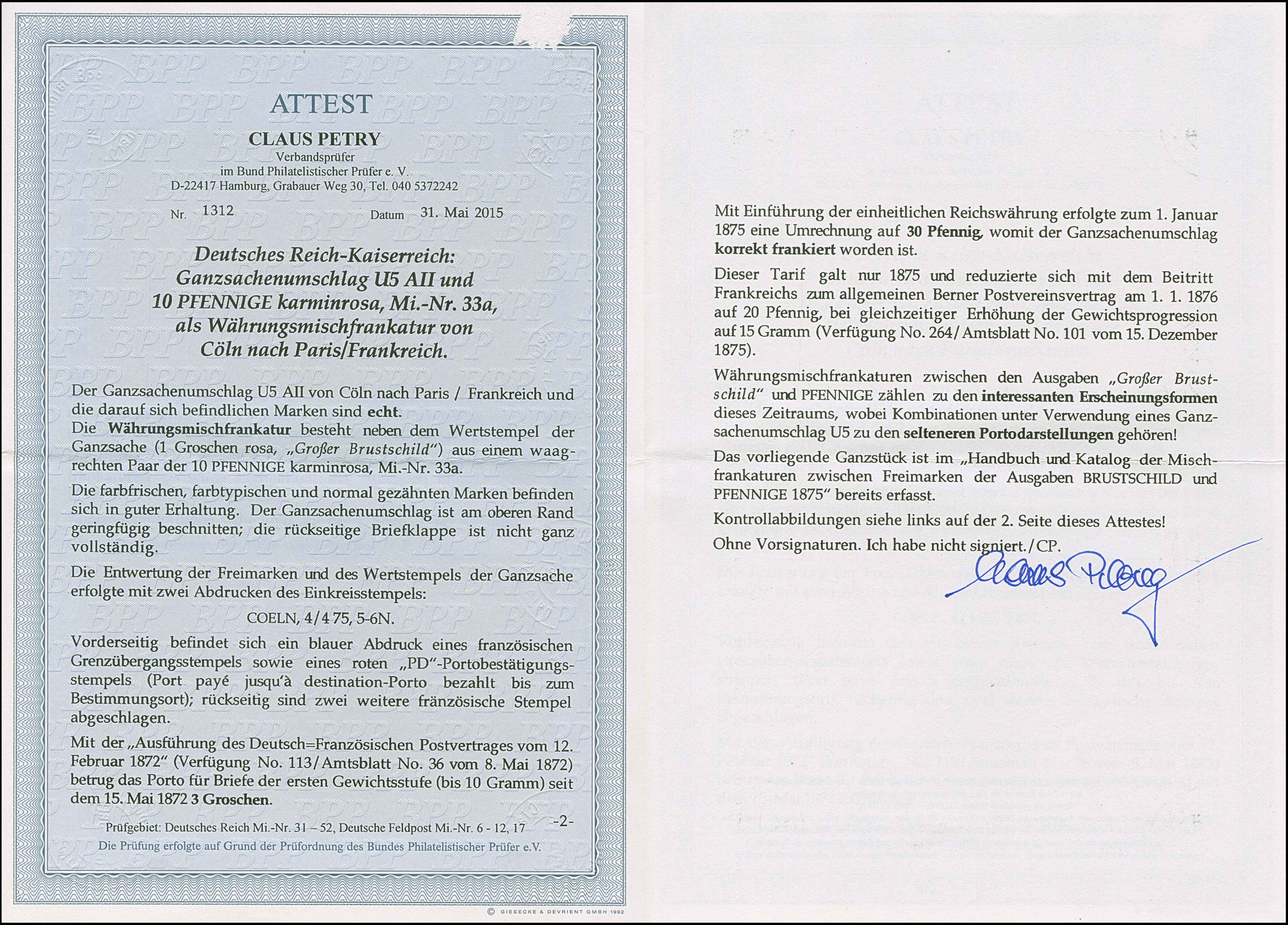 10 Pfge. karminrosa im waagerechten Paar mit EKr. “COLEN 4.4.75" als tarifgerechte Zufrankatur auf Brustschild Ganzsachenumschlag großer Schild 1 Gr. mit rotem L1 “P.D” und frz. Transitstempel nach Paris und mit Ra1 “Retour” zurück nach Köln. Der Umschlag ist oben minimal verkürzt mit rückseitig fehlendem Verschlußklappen-Teil durch Öffnungsschnitt, ansonsten in guter Gesamterhaltung. Eine interessante und in dieser Art nicht häufige wertstufengleiche Währungsmischfrankatur, Fotoattest Petry BPP (2015)