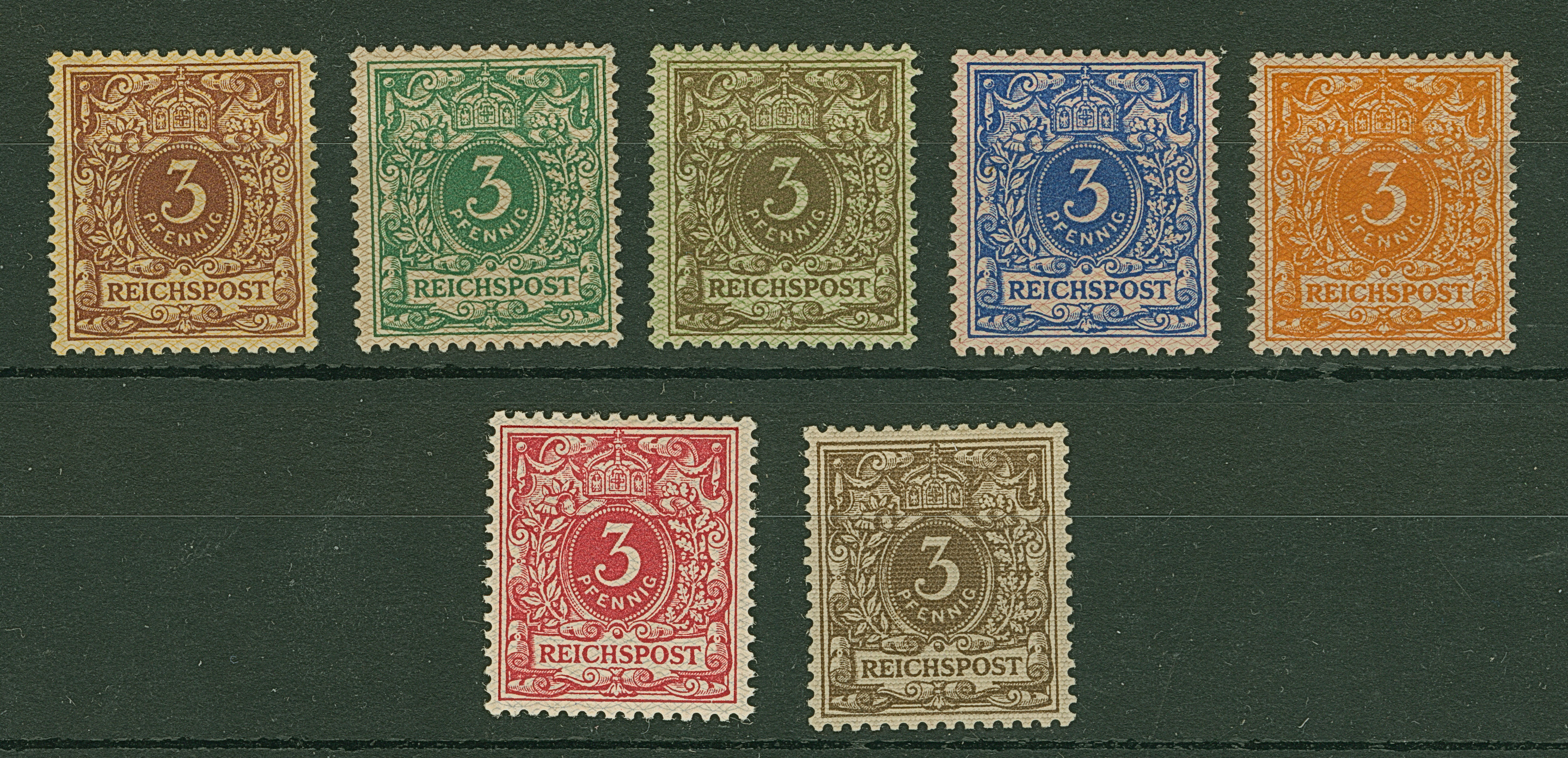 1890, Krone/Adler 3 Pfg. als Netzaufdruckprobe, alle sechs verschiedenen Farben, dazu 3 Pfg. graubraun mit Prägeunterdruck im Punktmuster, jeweils ungebraucht und in einwandfreier Erhaltung, selten, sign. Kosack