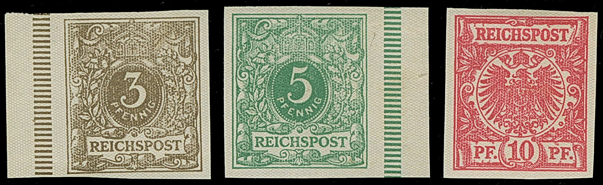 1890, Krone/Adler 3-10 Pfg. als ungezähnte Probedrucke mit wabenförmigen Einprägungen kpl., ungummiert wie verausgabt, in einwandfreier Erhaltung, jeweils mit Fotobefund Jäschke-L. BPP (2021)