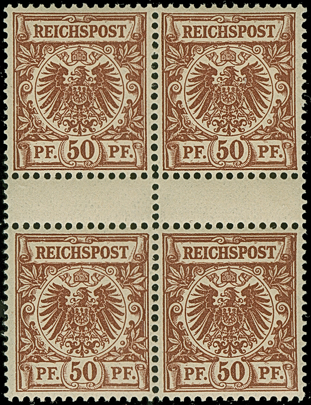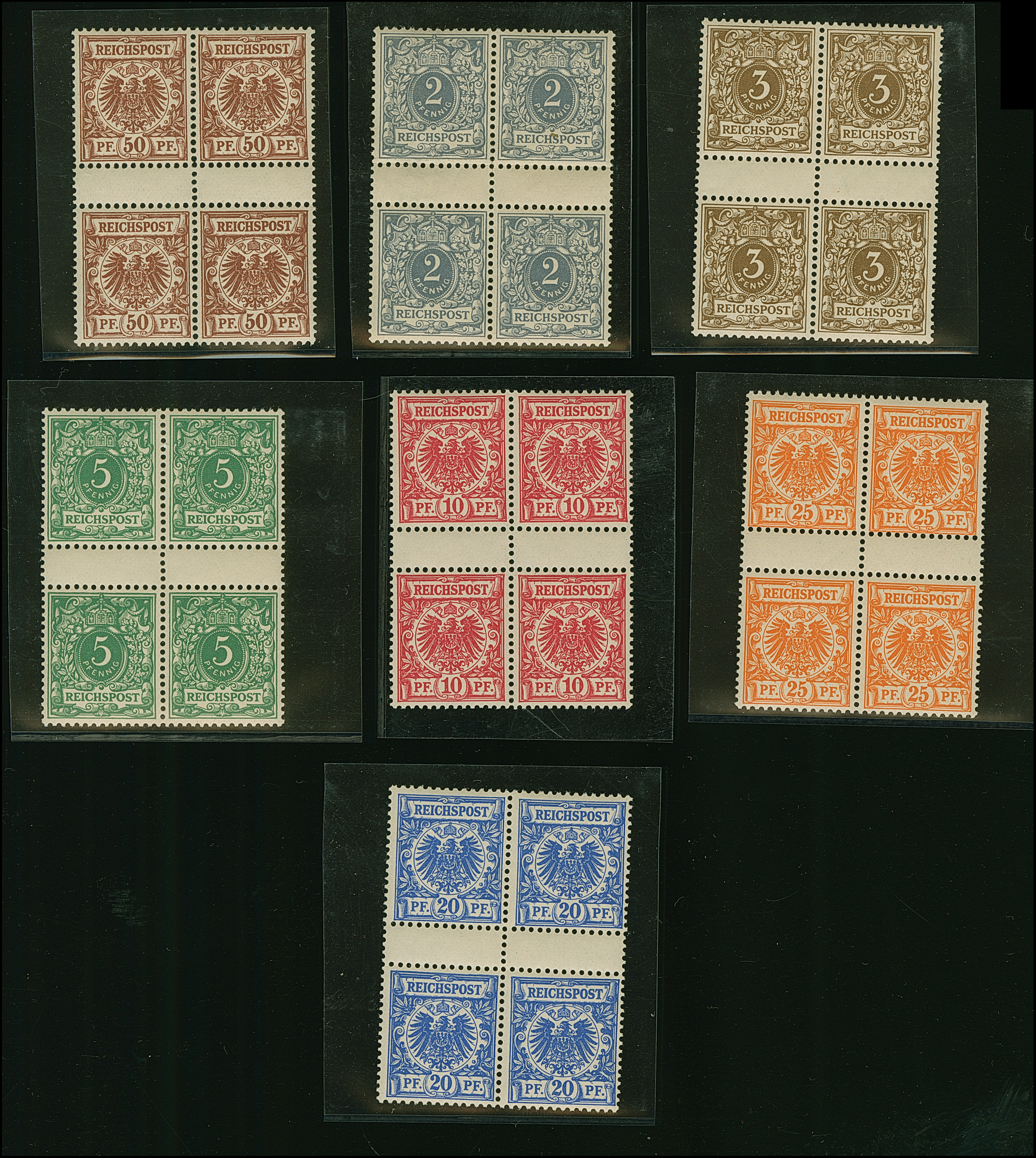 1889/1900, Krone/Adler, 3 - 50 Pfg. und 2 Pfg., je im Viererblock mit zwei senkrechten Zwischenstegpaaren, farbfrisch und gut gezähnt, die unteren Werte sind postfrisch, die oberen ungebraucht, einwandfrei. 25 Pfg. in der besseren Farbe dunkelorange (=ba), sowie MiNr. 50 in der besseren Farbe lebhaftrotbraun (=da), 10 Pfg. sign. Gotw. Zenker BPP sowie Fotoattest Jäschke-L. (2025)
