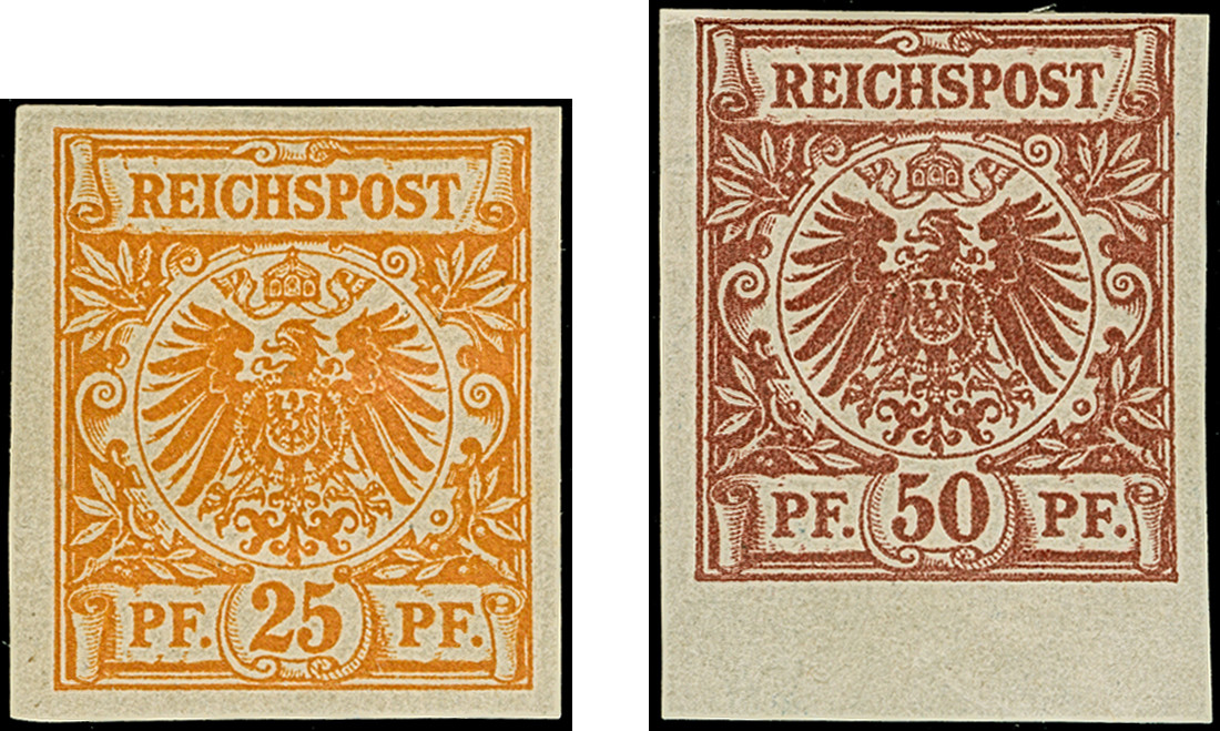 1890, Krone/Adler 25 Pfg. gelborange und 50 Pfg. lebhaftbraunrot als ungezähnte Farbproben, ungebraucht, in einwandfreier Erhaltung, Kurzbefund Wiegand BPP (2008) bzw. Fotobefund Zenker