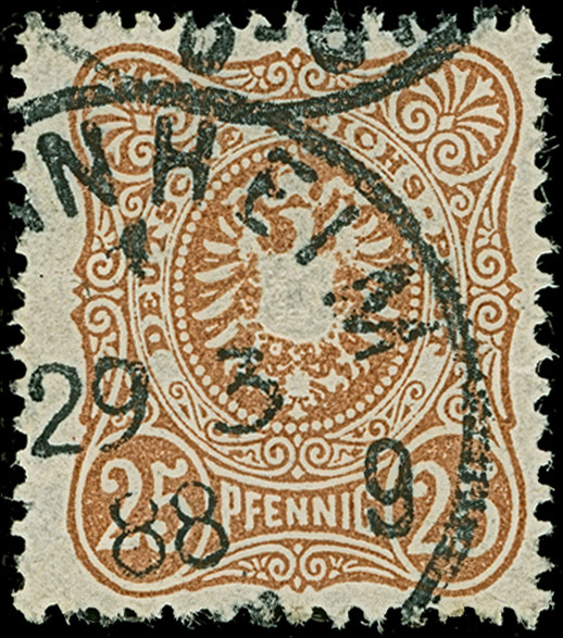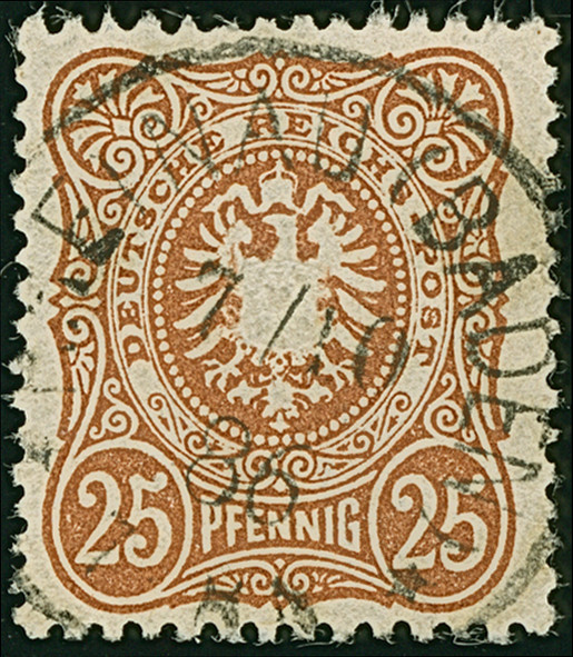 25 Pfg. braunocker, farbfrisch und gut gezähnt, sauber gestempelt, links kleine Zahnstauchung geglättet, sonst einwandfrei. Eine sehr seltene Marke. Signiert Wiegand BPP