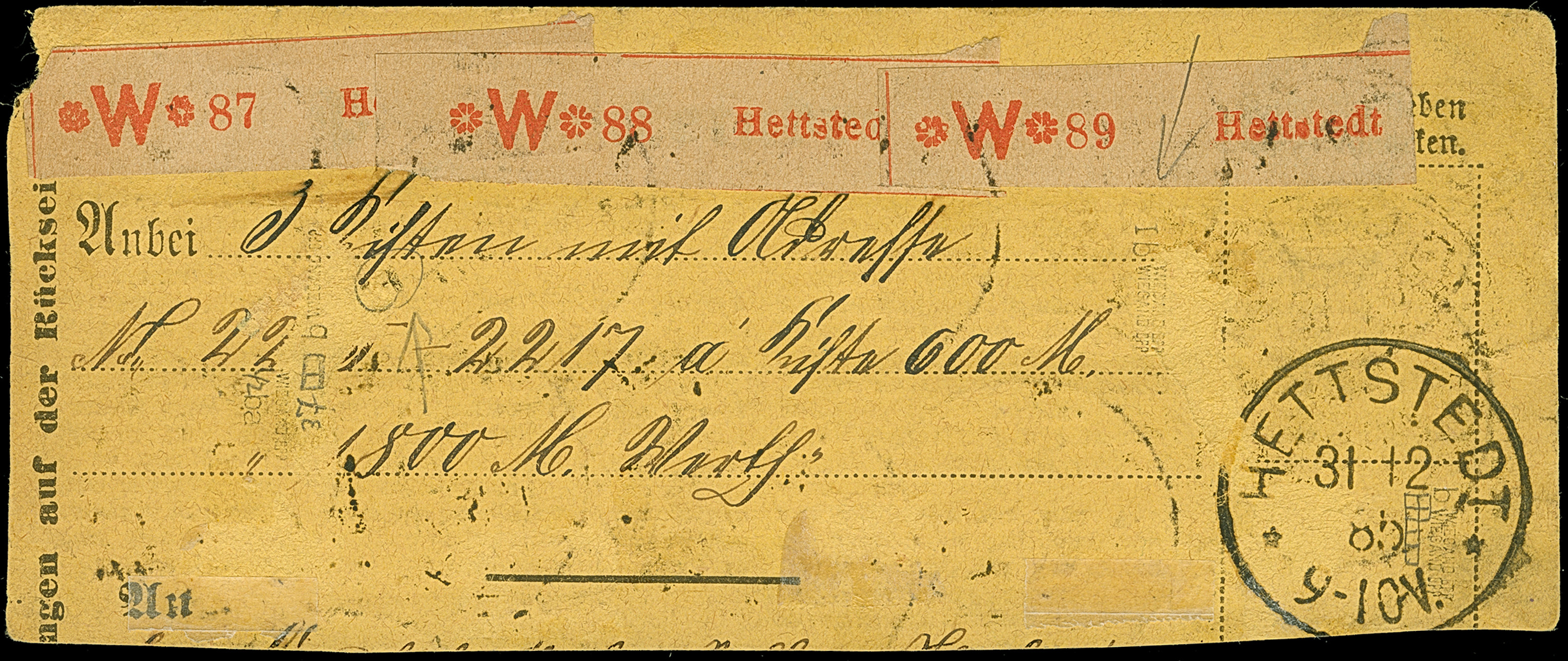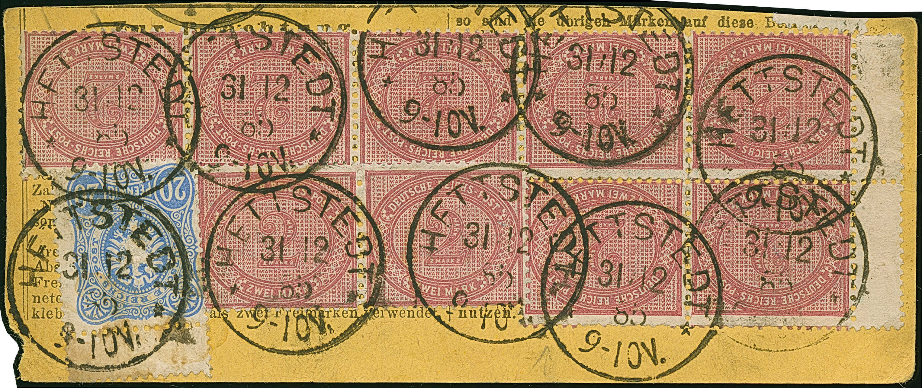 2 M. lebhaftrosalila mit Plattenfehler “dicker weißer Strich über O in POST” im Viererblock mit Normalmarken, im waagerechten Paar und Dreierstreifen sowie 20 Pfg. blau je mit EKr. “HETTSTEDT 31.12.85” auf Paketkarten-Briefstück. Die farbfrischen Marken sind üblich gezähnt und bis auf einen Eckzahnbug in einwandfreier Erhaltung, doppelt sign. Wiegand BPP