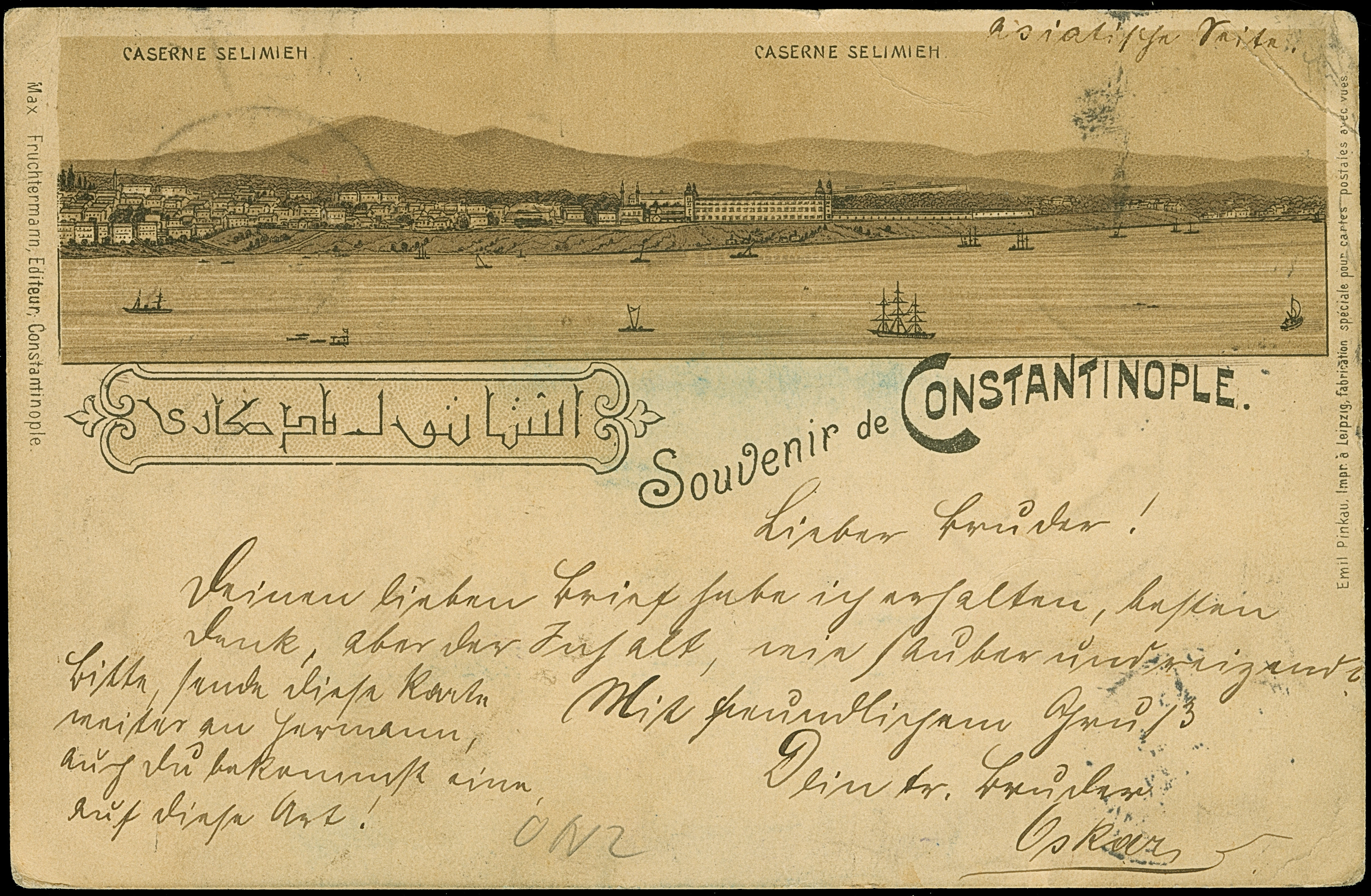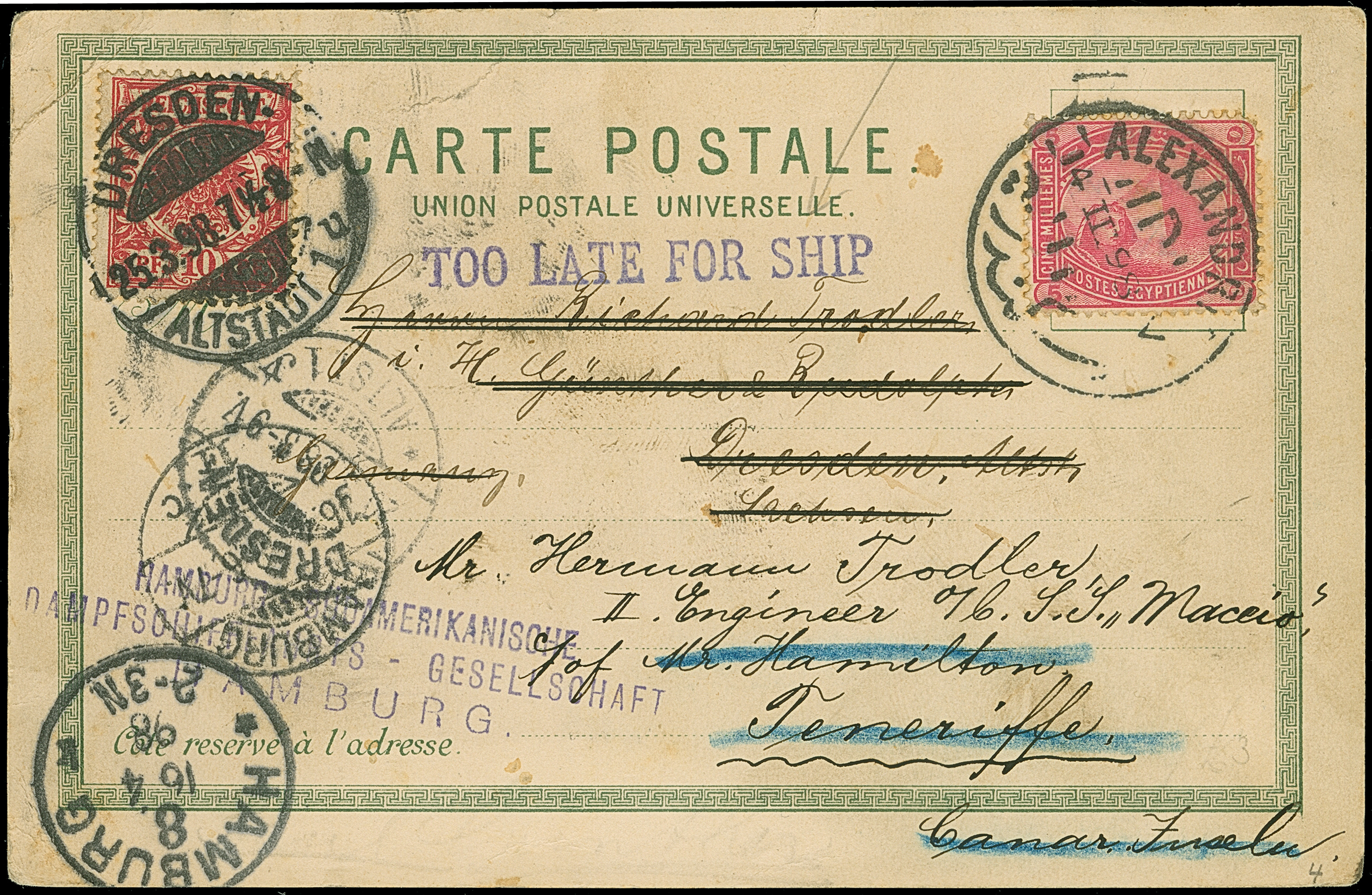 Krone/Adler 10 Pfg. mit Stempel “DRESDEN 25.3.98” auf Nachsende-Frankatur auf Ansichtskarte “Gruss aus Constantinopel” mit Ägypten 5 Pa. karmin mit Stempel “ALEXANDRIA 14.II.98” an das Schiff SS Maceio in Teneriffa mit Nachsendung nach Dresden und Hamburg mit L3 “HAMBURG-AMERIKANISCHE DAMPFSCHIFFAHRTS-GESELLSCHAFT HAMBURG”. Die Karte mit kleinen Randbügen, eine interessante Nachsende-Karte