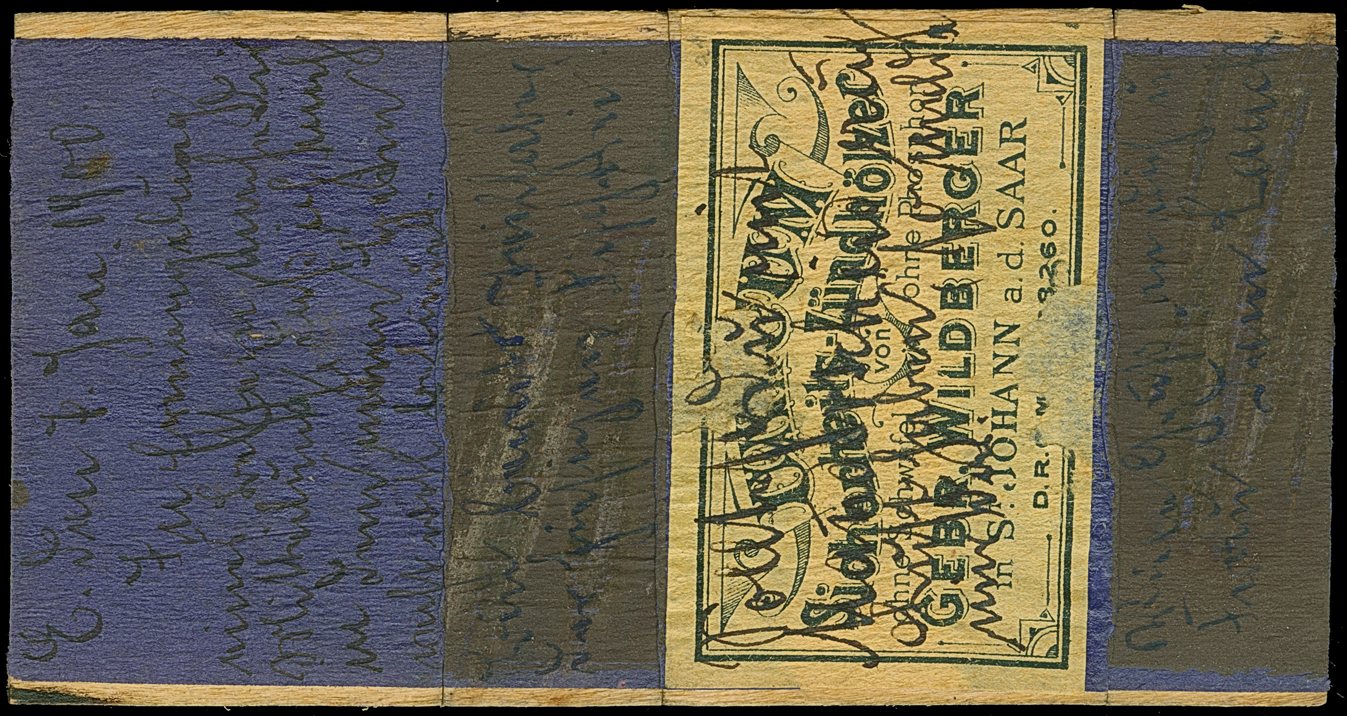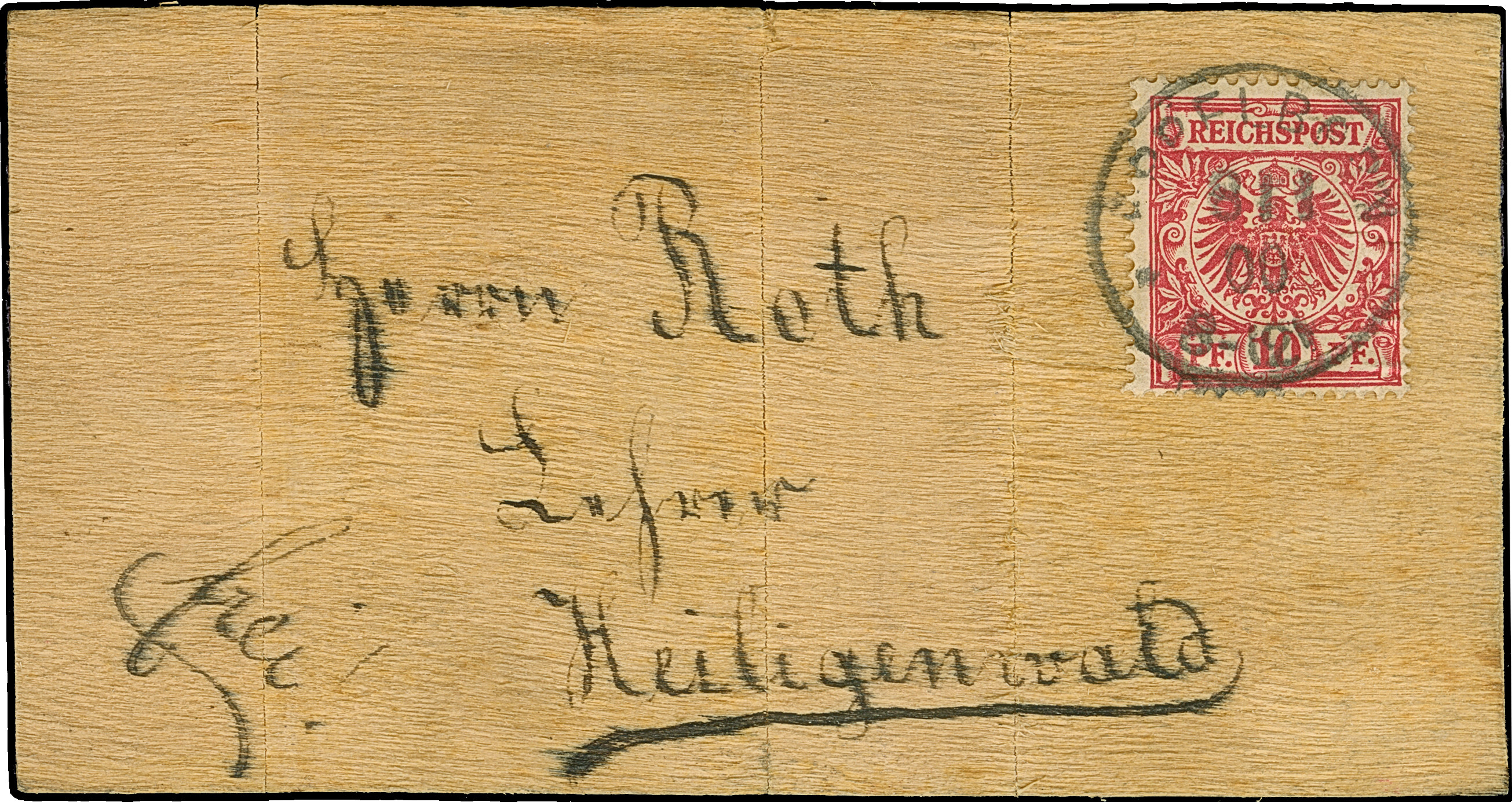 1890, Krone/Adler 10 Pfg. lebhaftlilarot mit Stempel “….8.1.00” auf Holz-Postkarte mit rückseitig aufgeklebtem Zündholz-Werbung und viel Text nach Heiligenwald. Das Holz ist mehrfach senkrechte gebrochen, aber fest auf Papier verklebt. Eine ungewöhnliche Verwendung