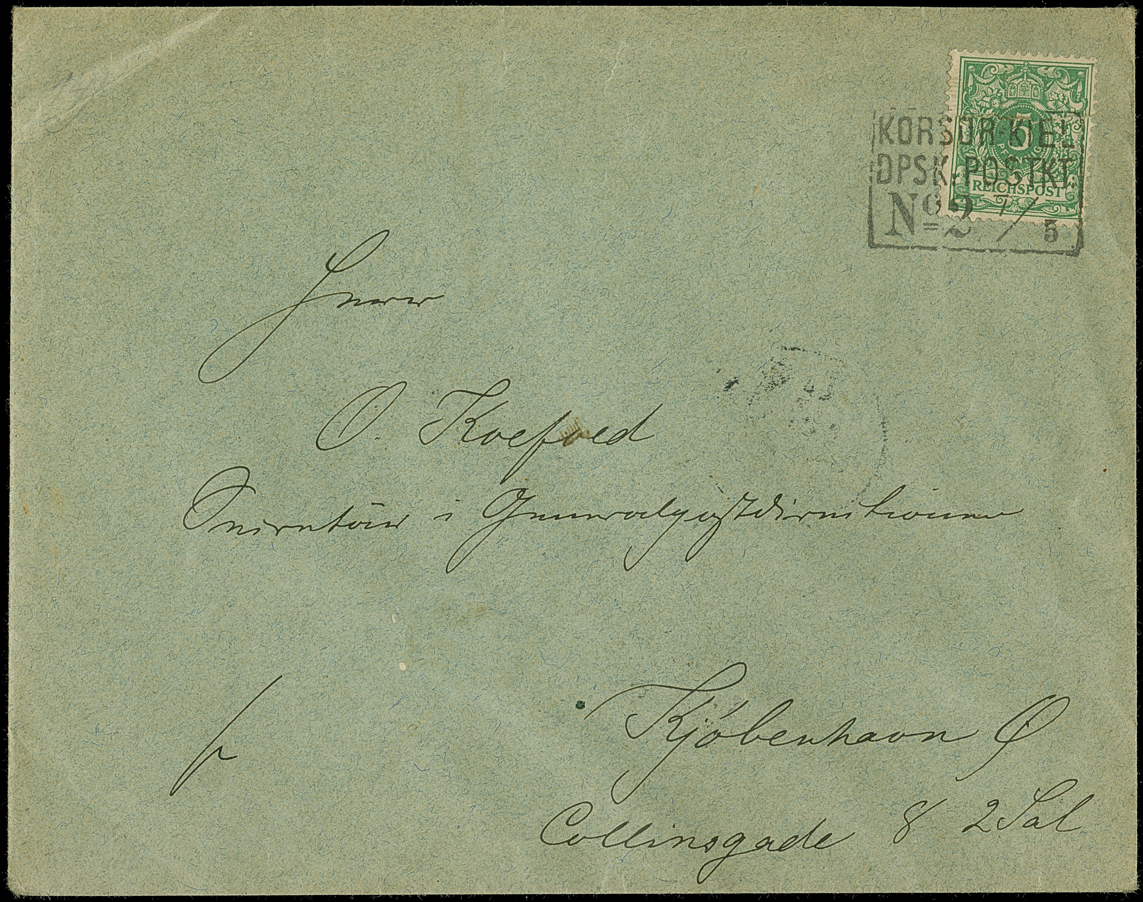 1890, Krone/Adler 5 Pfg. opalgrün mit dänischem Schiffspost-Stempel “KORSOR-KIEL DPSK-POSTKT. No.2 7/5 (97)” nach Kopenhagen mit Ankunftsstempel. Der Umschlag mit kleinen Randspuren bzw. Eckbug, ansonsten in guter Erhaltung