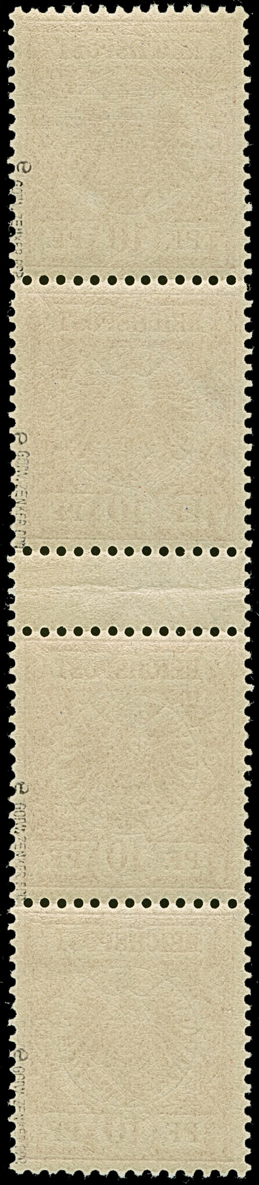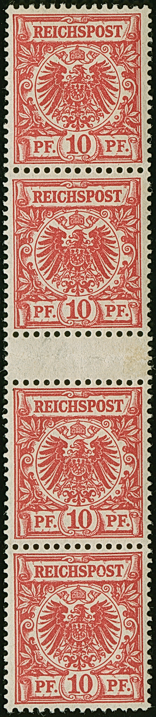 1899, Krone/Adler, 10 Pfg. dunkelrosa(rot) (lebhaftocker quarzend), senkrechtes Zwischenstegpaar mit oben und unten je einer weiteren Marke, farbfrisch und gut gezähnt, postfrisch, bis auf einen Querbug im Zwischensteg einwandfrei, sign. Gotw. Zenker BPP sowie Fotoattest Jäschke-L. BPP (2025)