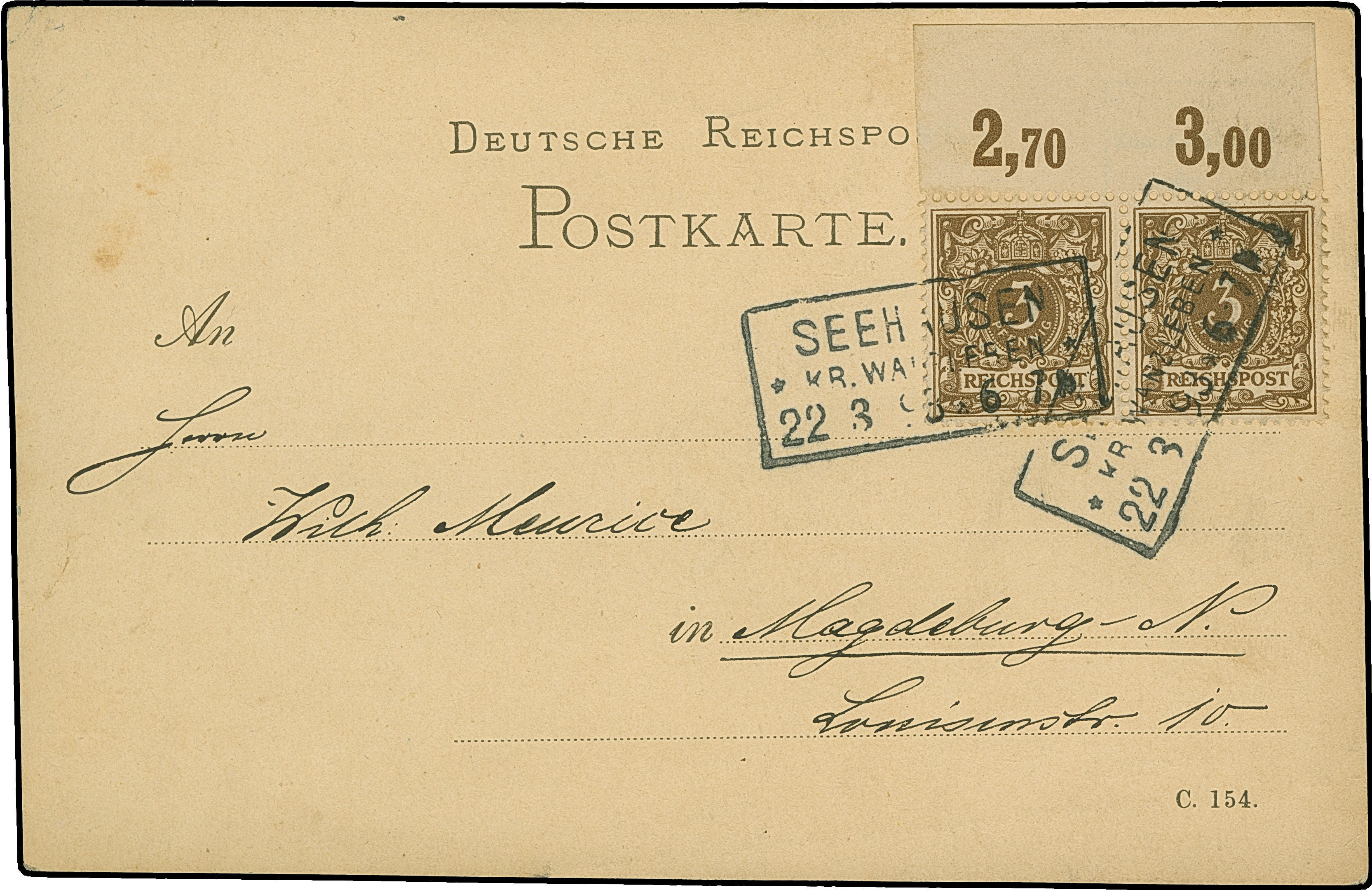 1890, Krone/Adler 3 Pfg. im waagerechten Oberrand-Paar mit klarem Rahmenstempel “SEEHAUSEN KR. WANZLEBEN 22.3.93” auf Postkarte mit viel Text nach Magdeburg, in einwandfreier Erhaltung