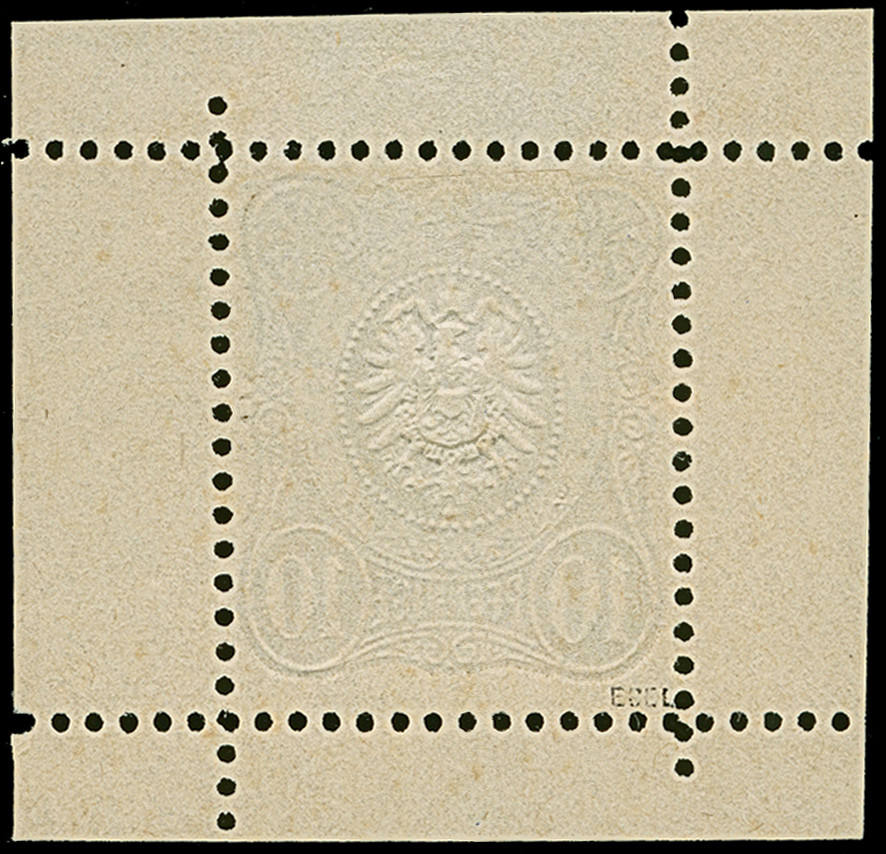 1875, 10 Pfge. als Essay im Adlermuster (nahe am endgültigen Muster) in Gelblichbraun auf weißem Papier ohne Gummierung mit Kleinbogenrand, in einwandfreier Erhaltung, selten, signiert Ebel und Fotoattest Petry BPP (2024) (Theuss E5)