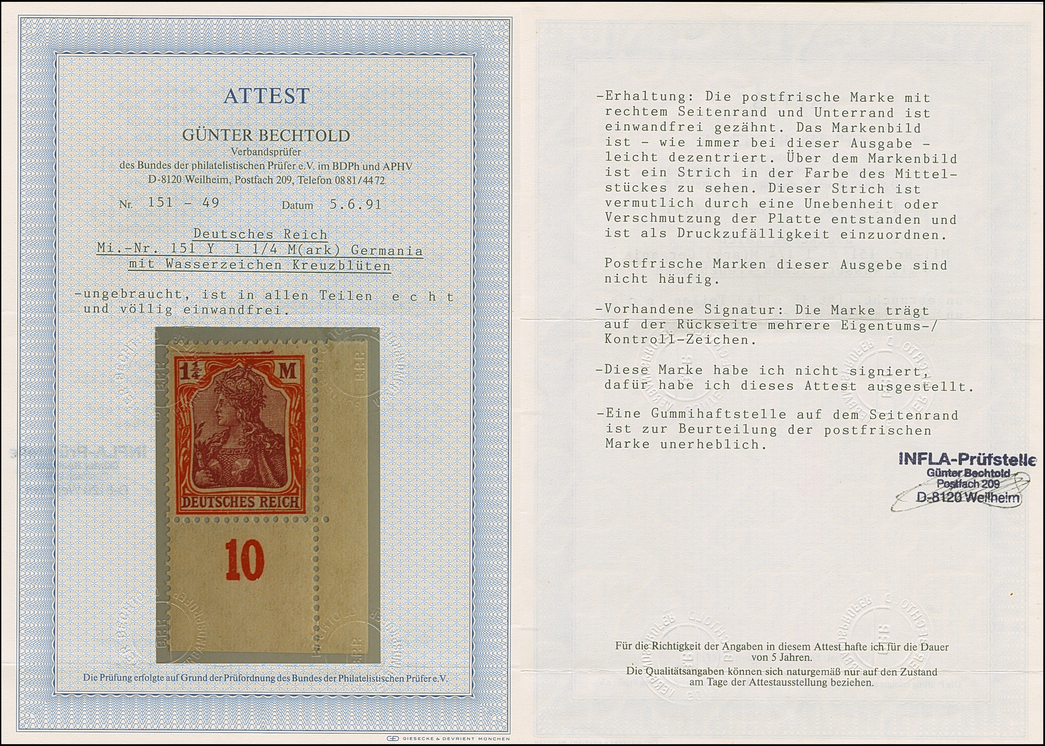 1920, Germania 1¼ M. mit Vierpass-Wasserzeichen aus der rechten unteren Bogenecke, postfrisch, in tadelloser Erhaltung, u.a. sign. Sellschopp und Fotoattest Bechtold BPP (1991)