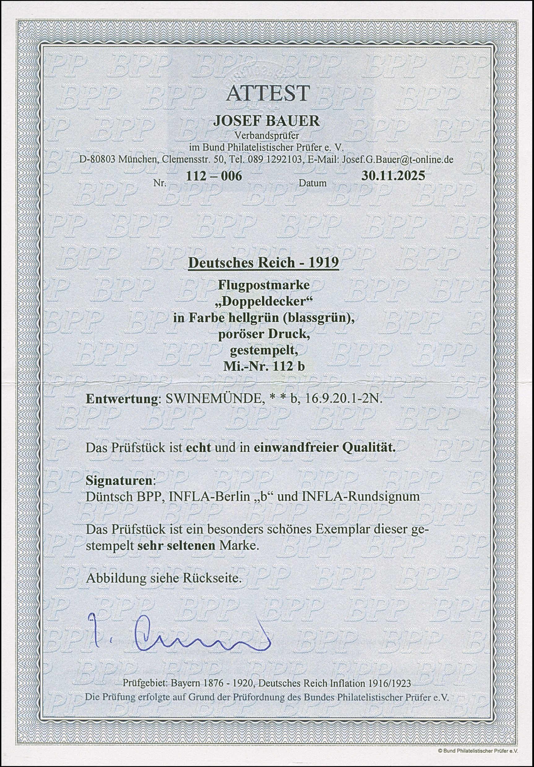 1919, Flugpost 40 Pfg. blaßgrün, in typisch porösem Druckbild, farbfrisch und einwandfrei gezähnt, sauber und zentrisch entwertet "SWINEMÜNDE 16.09.20", tadellos. Ein besonders schönes Exemplar dieser seltenen Marke. Signiert Düntsch und Infla, Fotoattest Bauer BPP (2025)