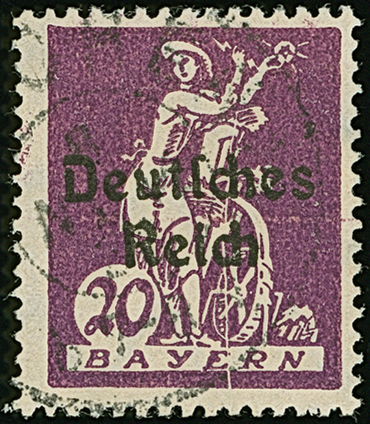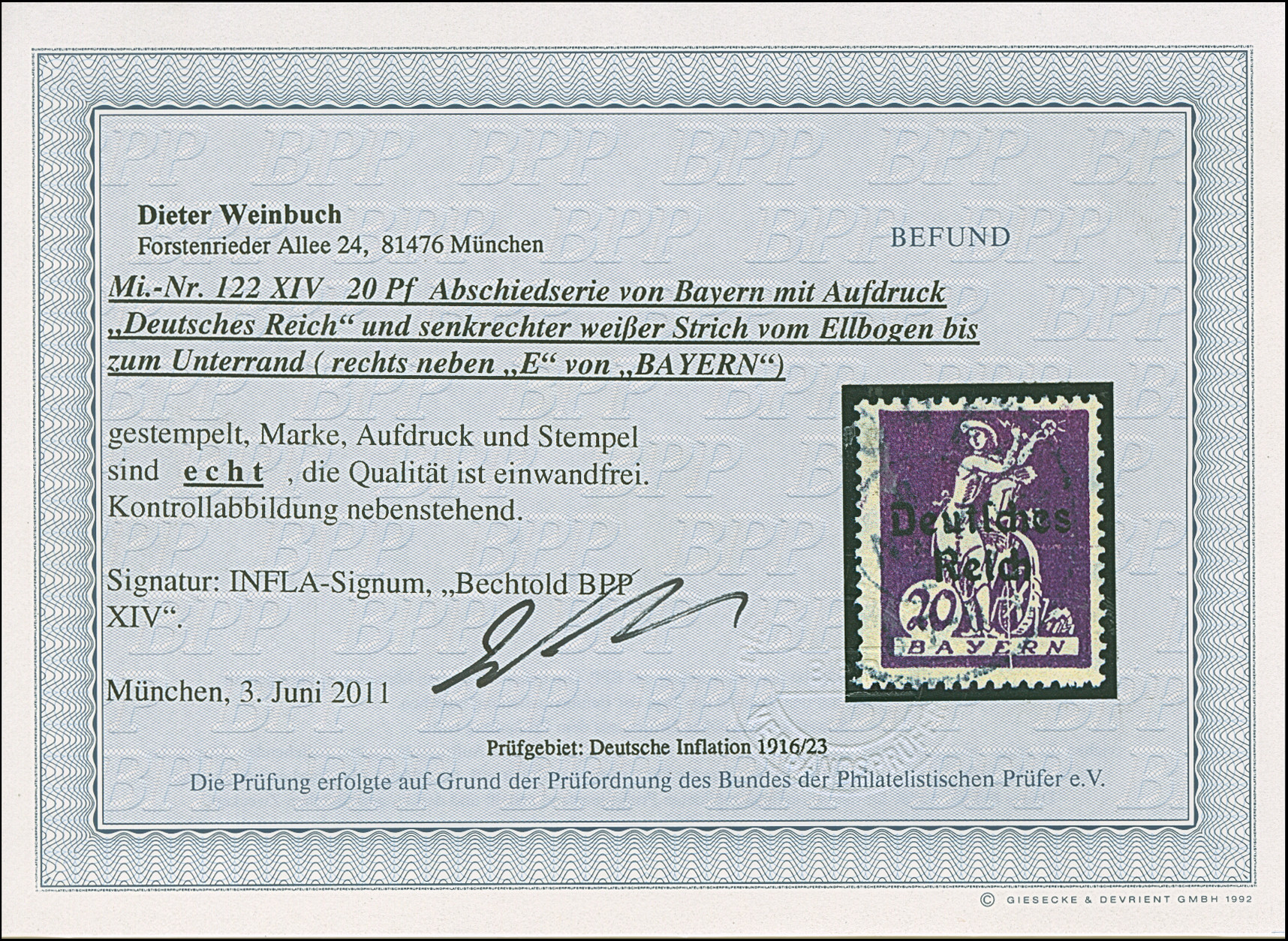 1920, Bayern Abschied 20 Pfg. mit Plattenfehler “senkrechter weißer Strich vom Ellbogen bis zum Unterrand”, gestempelt, in einwandfreier Erhaltung, sign. Infla Berlin und Bechtold BPP sowie Fotobefund Weinbuch BPP (2011)