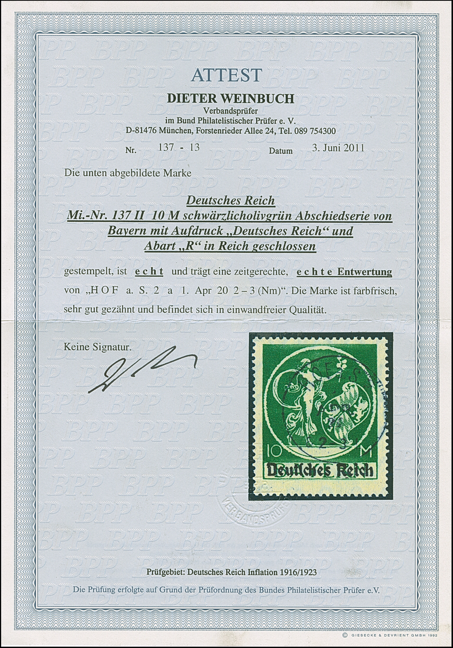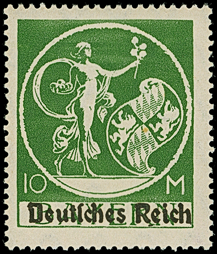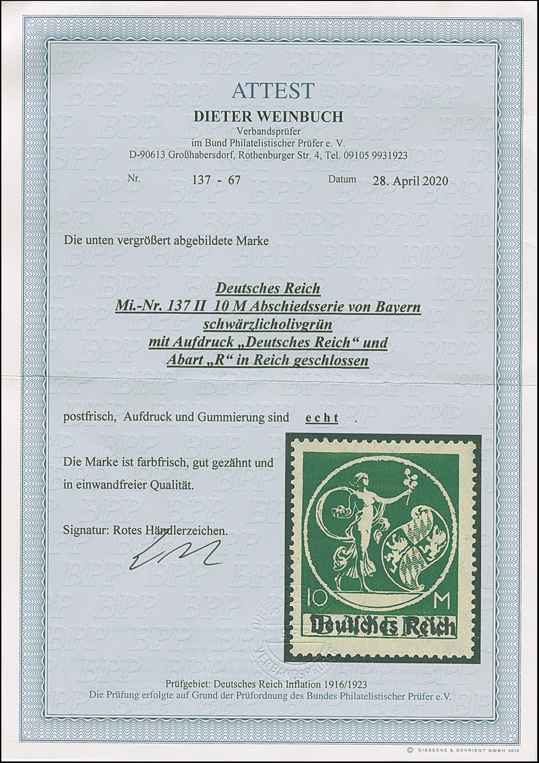 1920, Bayern-Abschied, 10 M. grün, Aufdrucktype II, postfrisch, tadellos, sign. Drahn sowie Fotoattest Weinbuch BPP (2020)