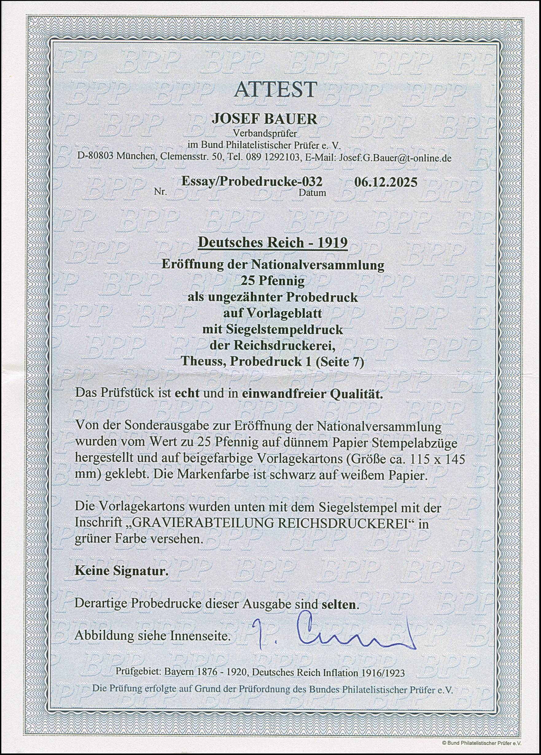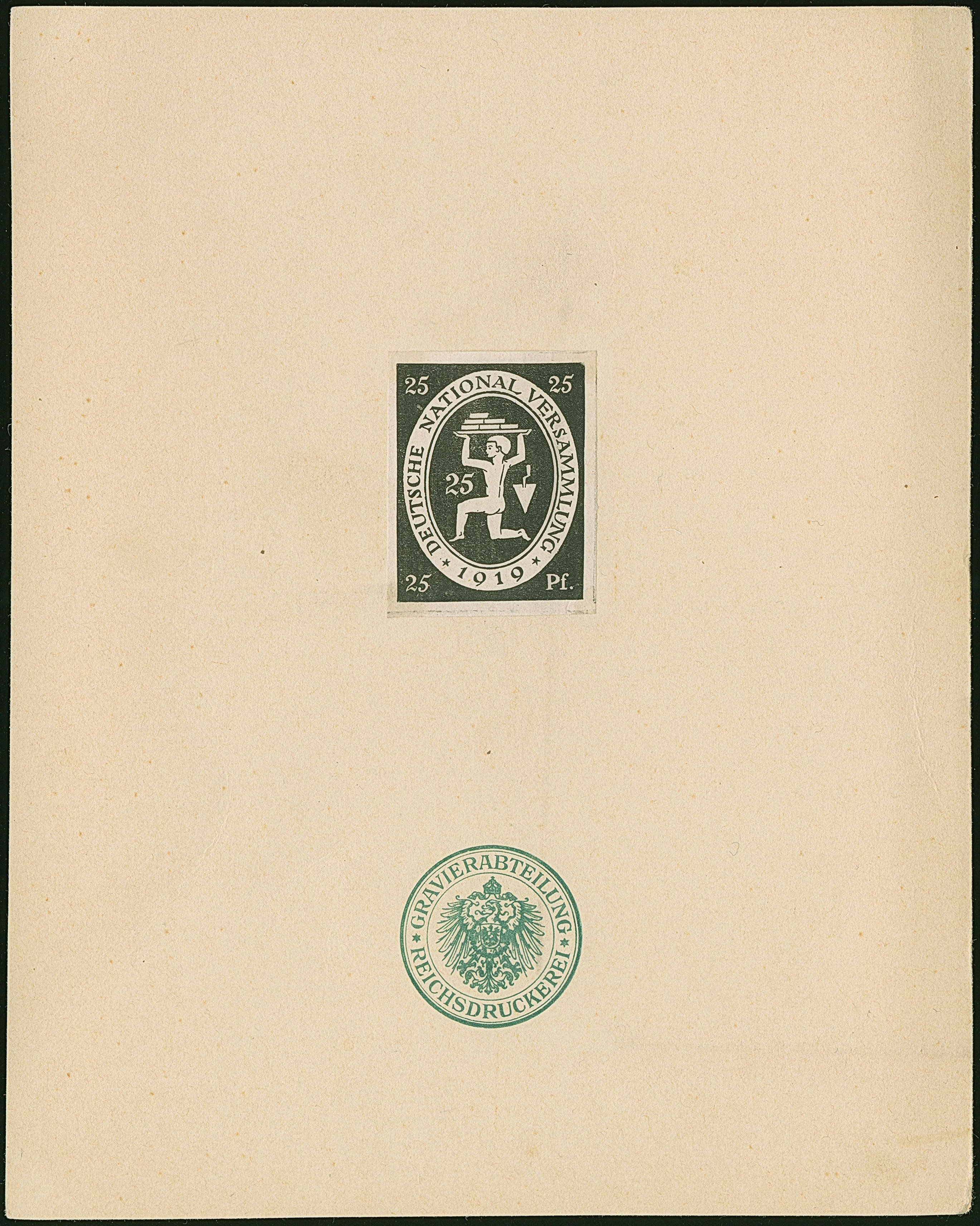 1919, Nationalversammlung 25 Pfg., ungezähnter Probedruck (Reinzeichnung) in Schwarz auf dünnem Papier auf Vorlagekarton mit Siegelstempeldruck der Reichsdruckerei, in einwandfreier Erhaltung, in dieser Form sehr selten, Fotoattest Bauer BPP (2025) (Theuss E.1)