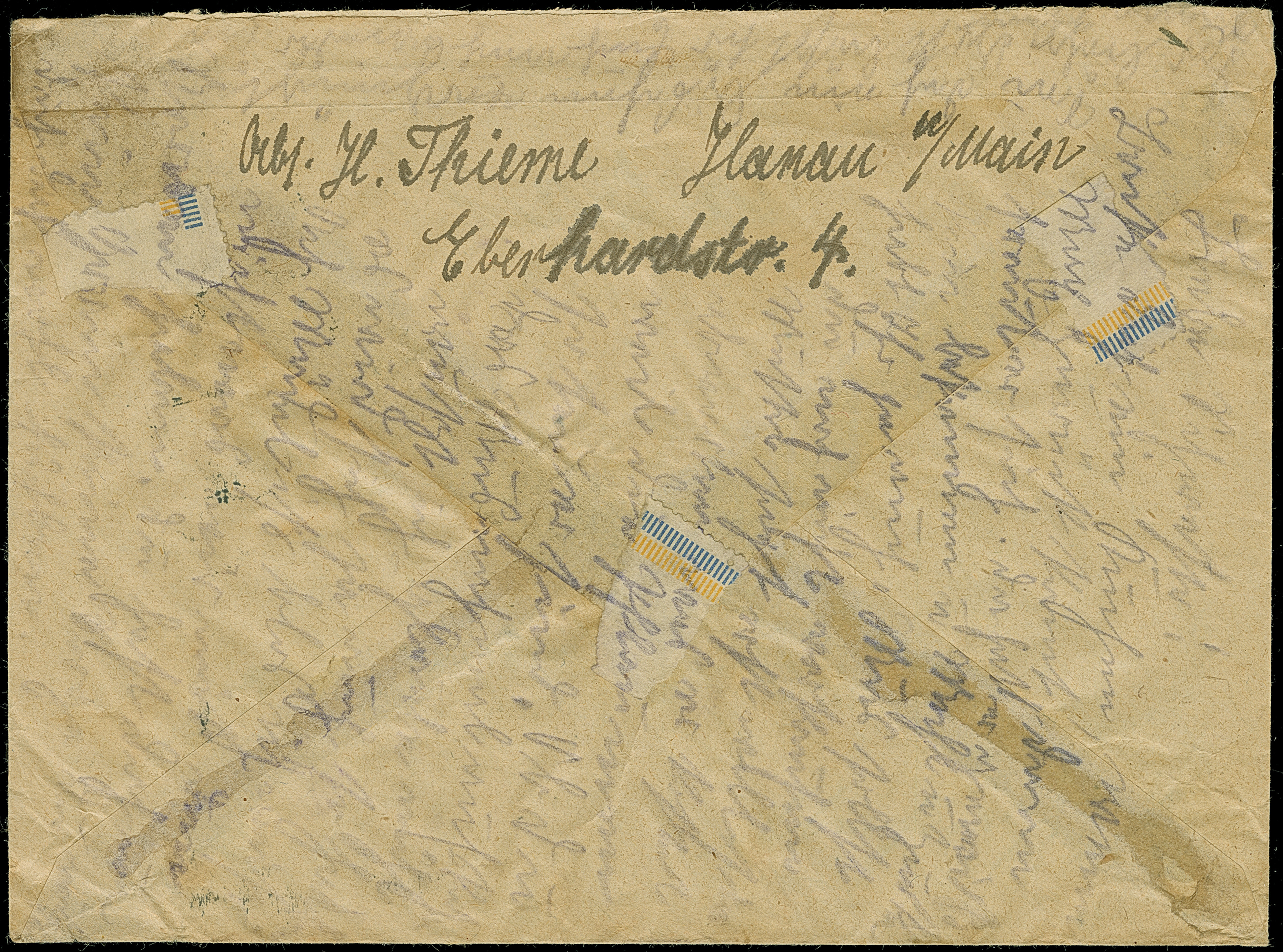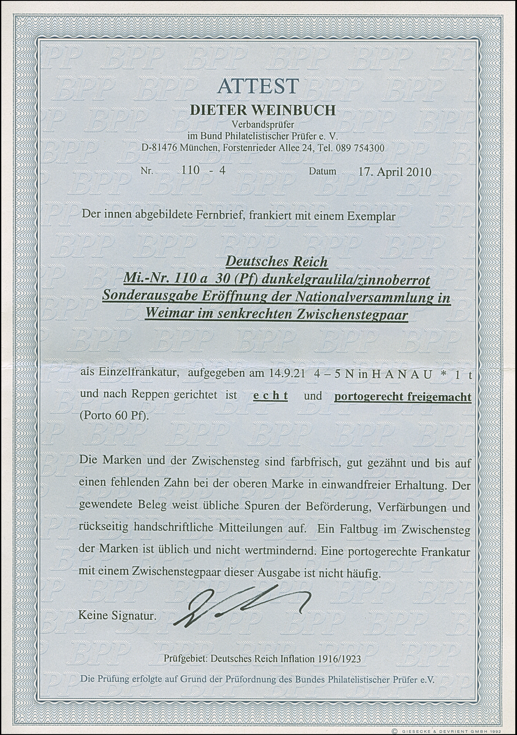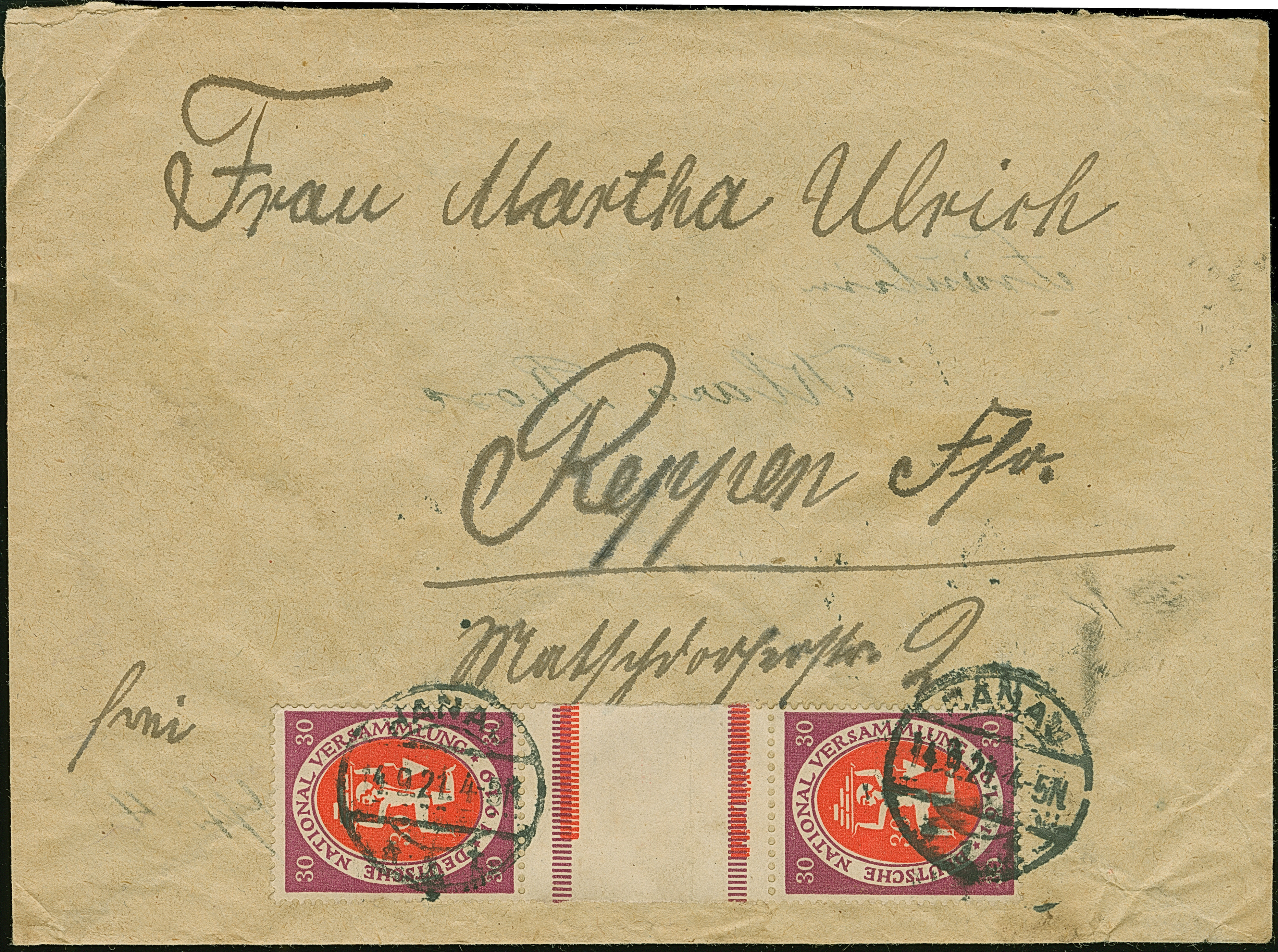 1919, Nationalversammlung 30 Pfg., Zwischenstegpaare mit Stempel “HANAU 14.9.21" auf portogerechtem Fernbrief, übliche Beförderungsspuren, die obere Marke ein fehlender Zahn, sonst gute Erhaltung, Fotoattest Weinbuch BPP (2010)