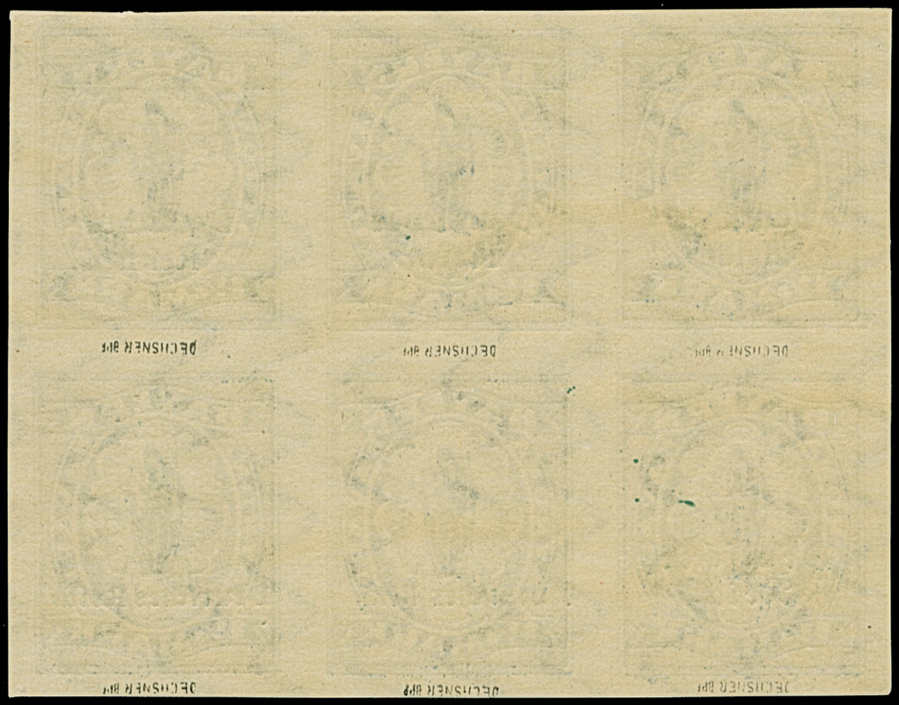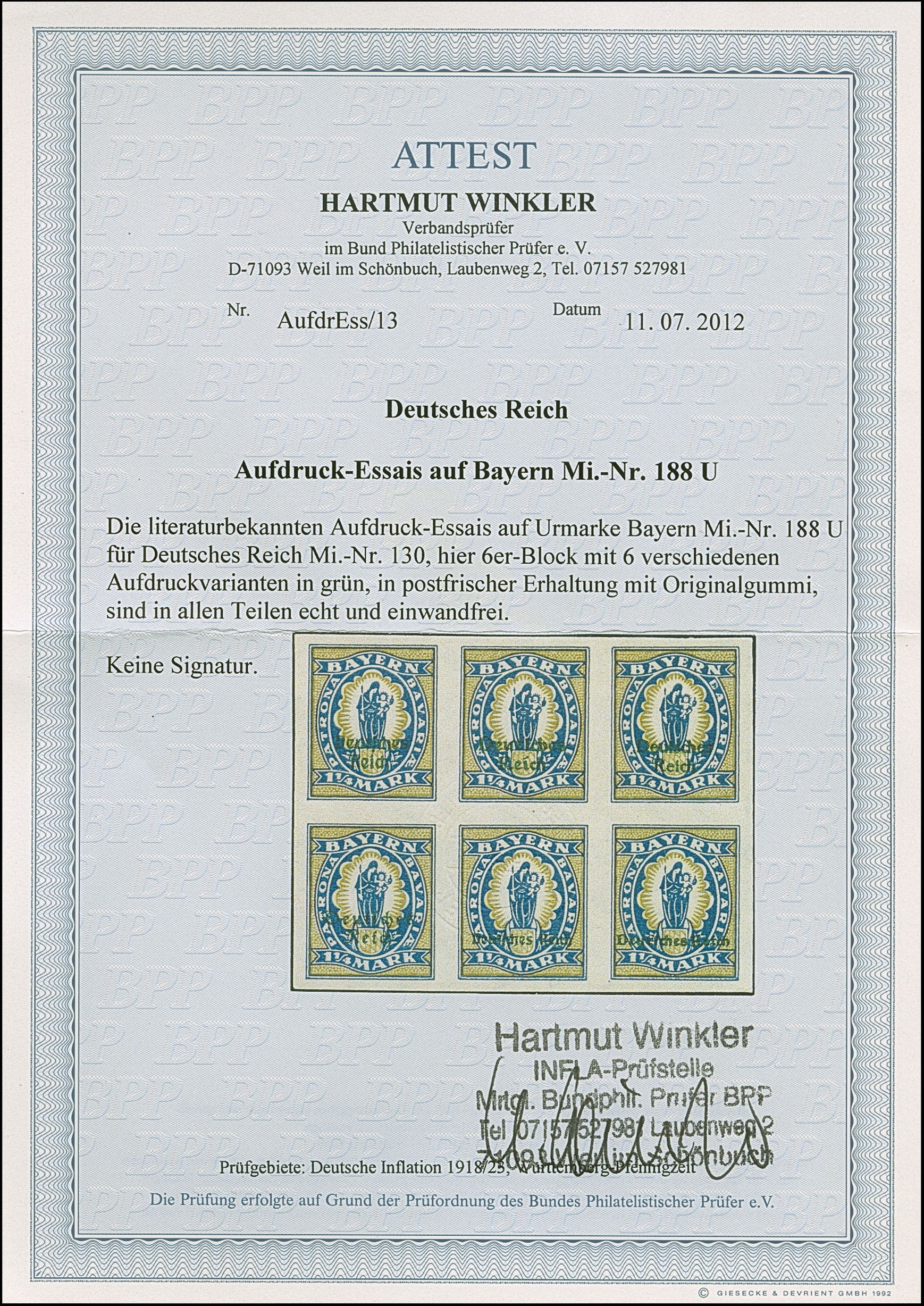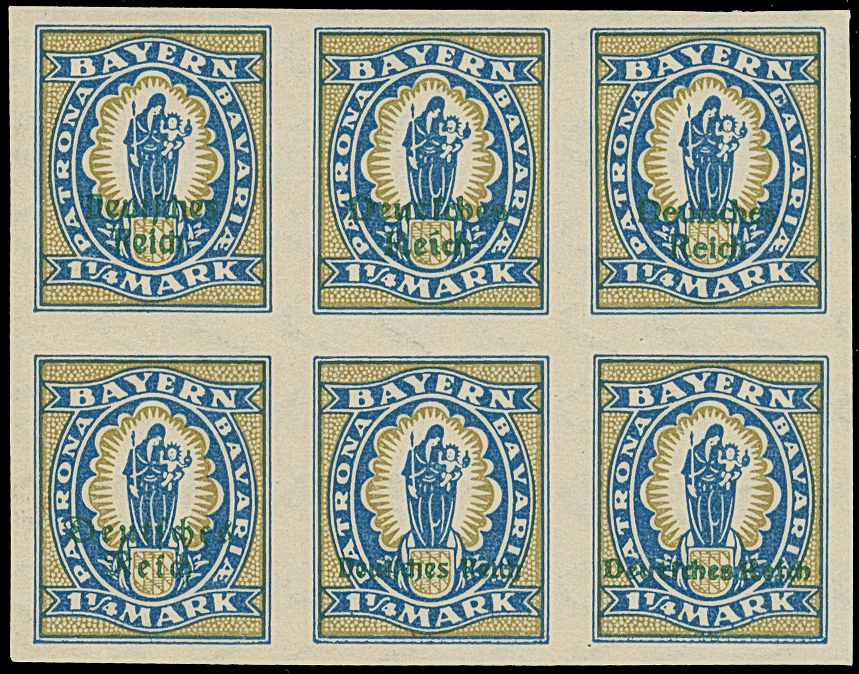 1920, Bayern-Abschied, 1¼ M. kobalt/mittelolivbraun, Aufdruckessay “Deutsches Reich” in grüner Schrift in verschiedenen Varianten im ungezähnten 6er-Block, postfrisch, tadellos, selten und attraktiv, Fotoattest Winkler BPP (2012)