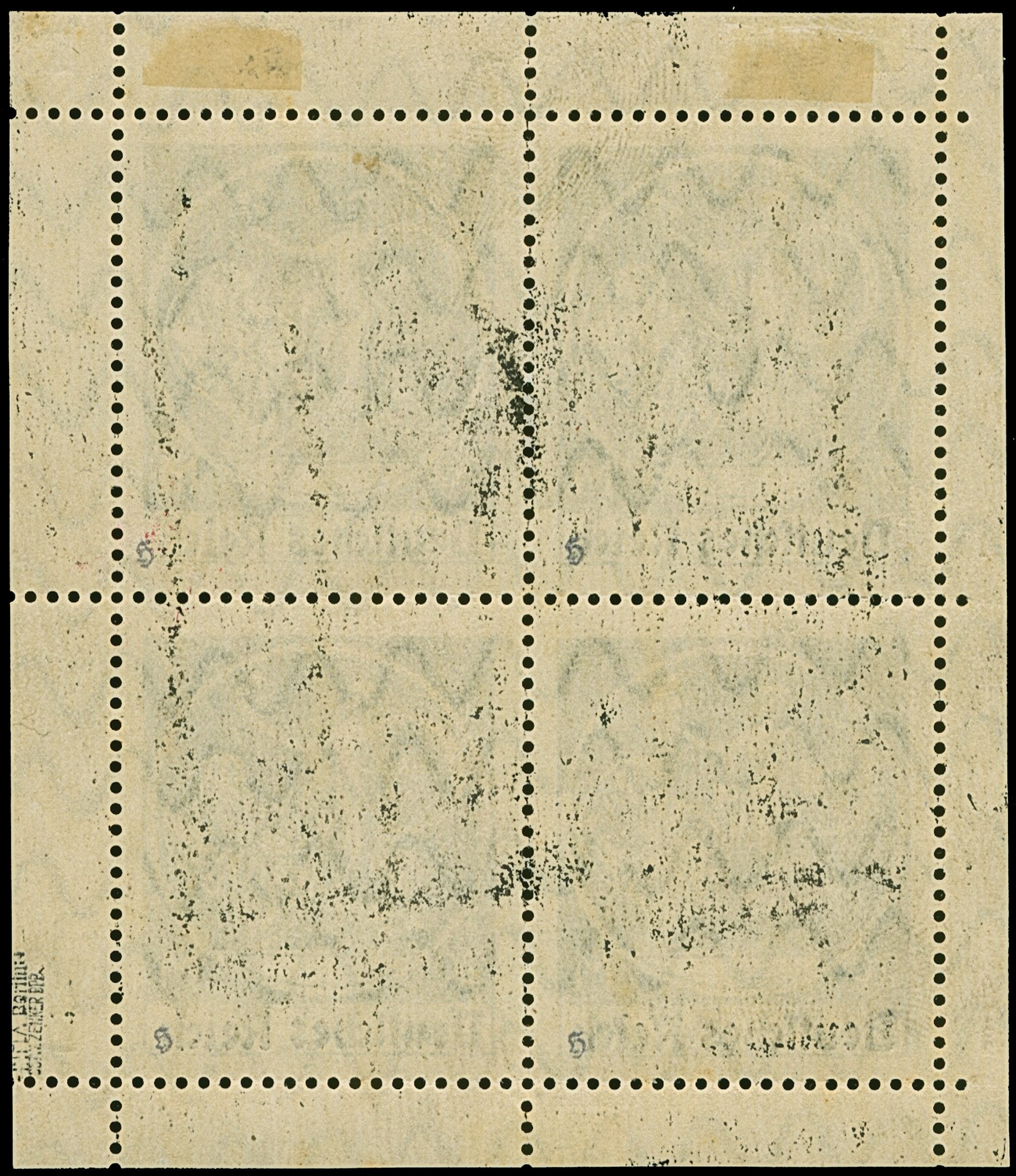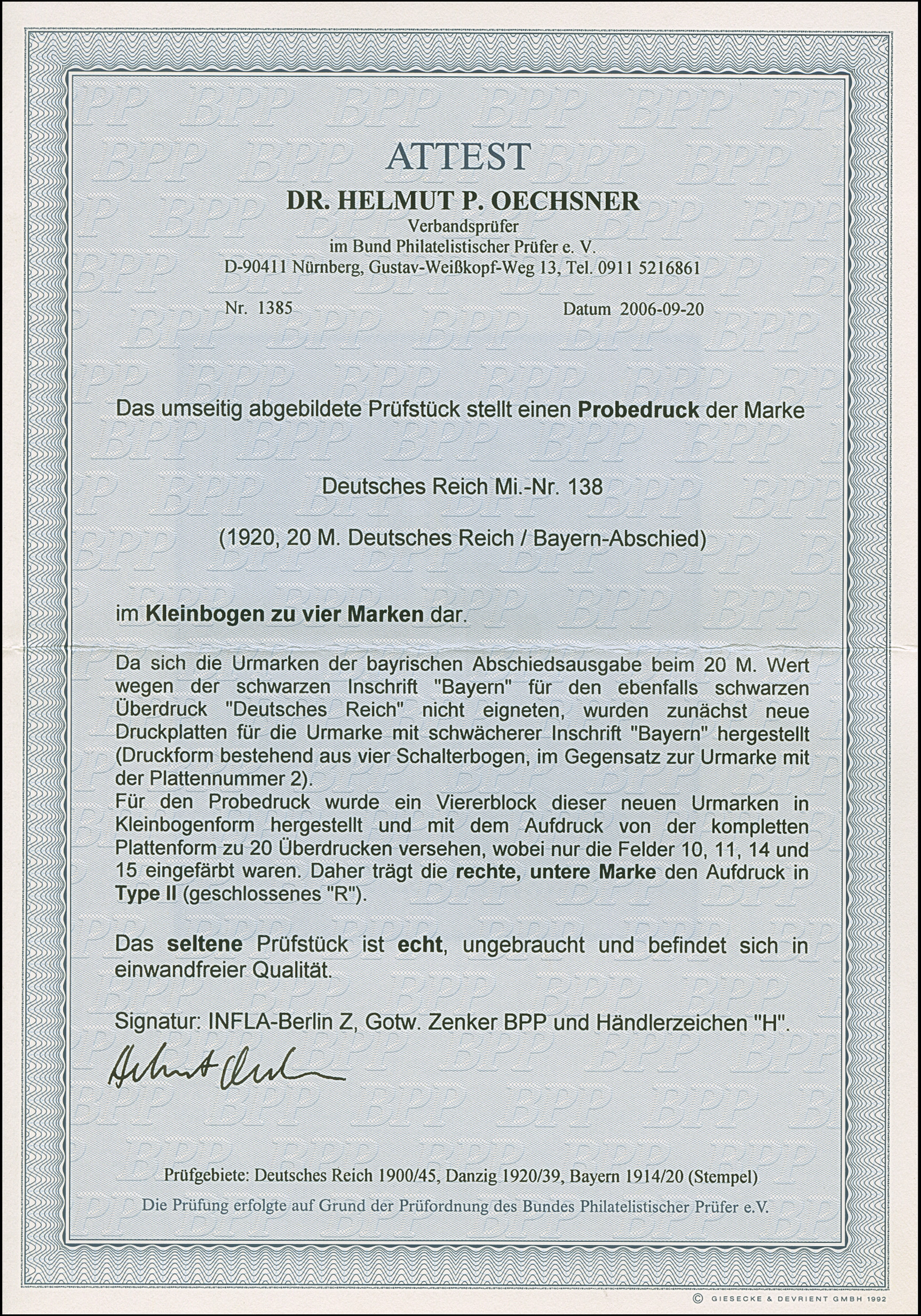 1920, Bayern-Abschied, 20 Mark schwarz, Probedruck von neuer Platte mit abgeschwächtem Schriftzug “BAYERN”, Viererblock im Kleinbogenformat mit allen Rändern, Aufdruckfelder 10, 11, 14 und 15, die rechte untere Marke daher mit Aufdrucktype II, sonst Aufdrucktype I, sauber ungebraucht, tadellos, sehr selten und attraktiv, u.a. sign. Infla sowie Fotoattest Oechsner BPP (2006)