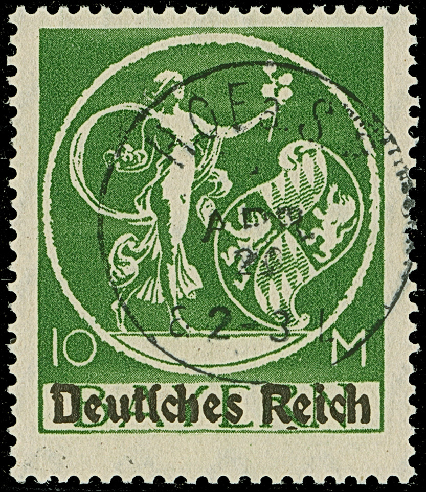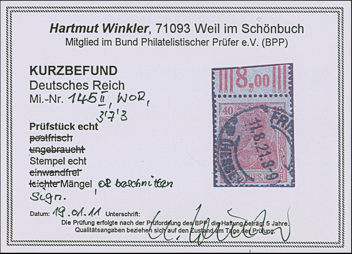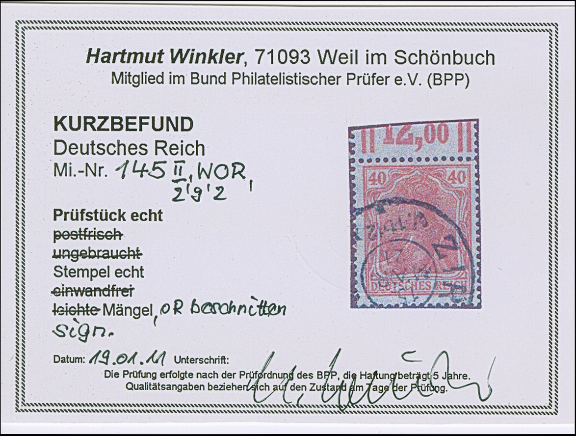 1920, Germania 40 Pfg. rot, Walzdruck-Oberrandstück mit Konfiguration “2'9'2”, sauber gestempelt, der Oberrand beschnitten, sonst tadellos, sign. Infla sowie Kurzbefund Winkler BPP (2011)