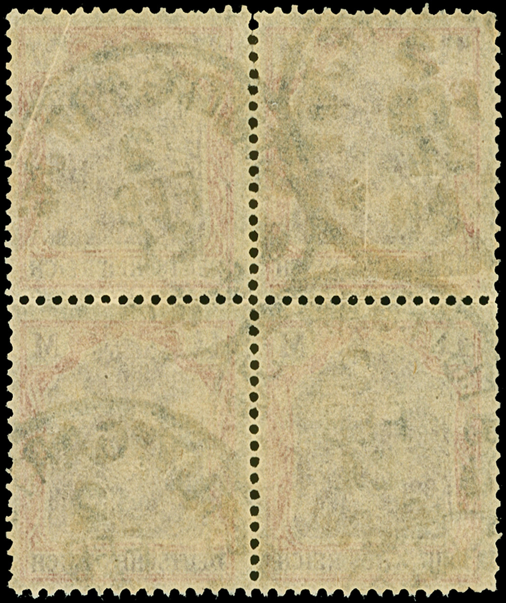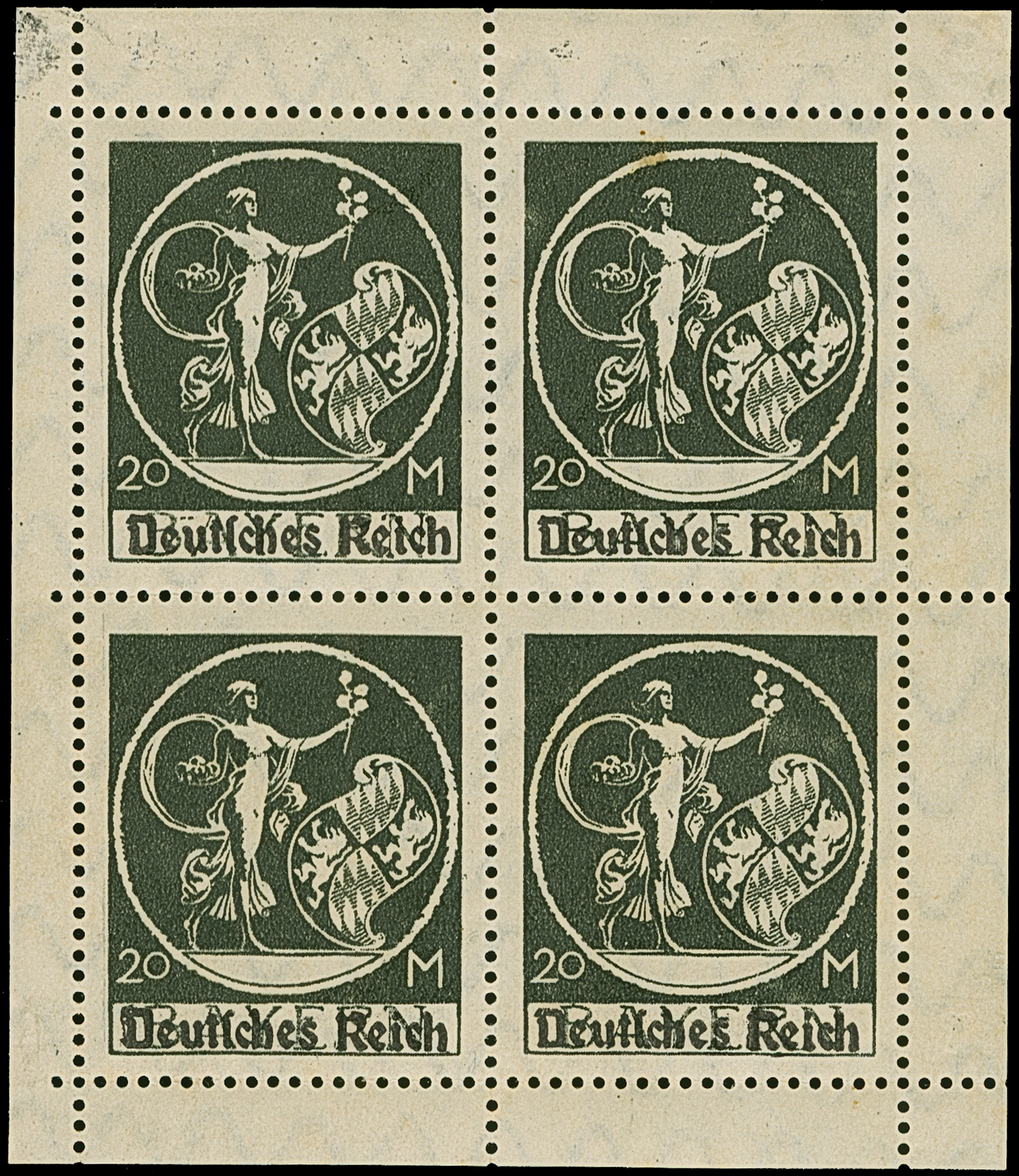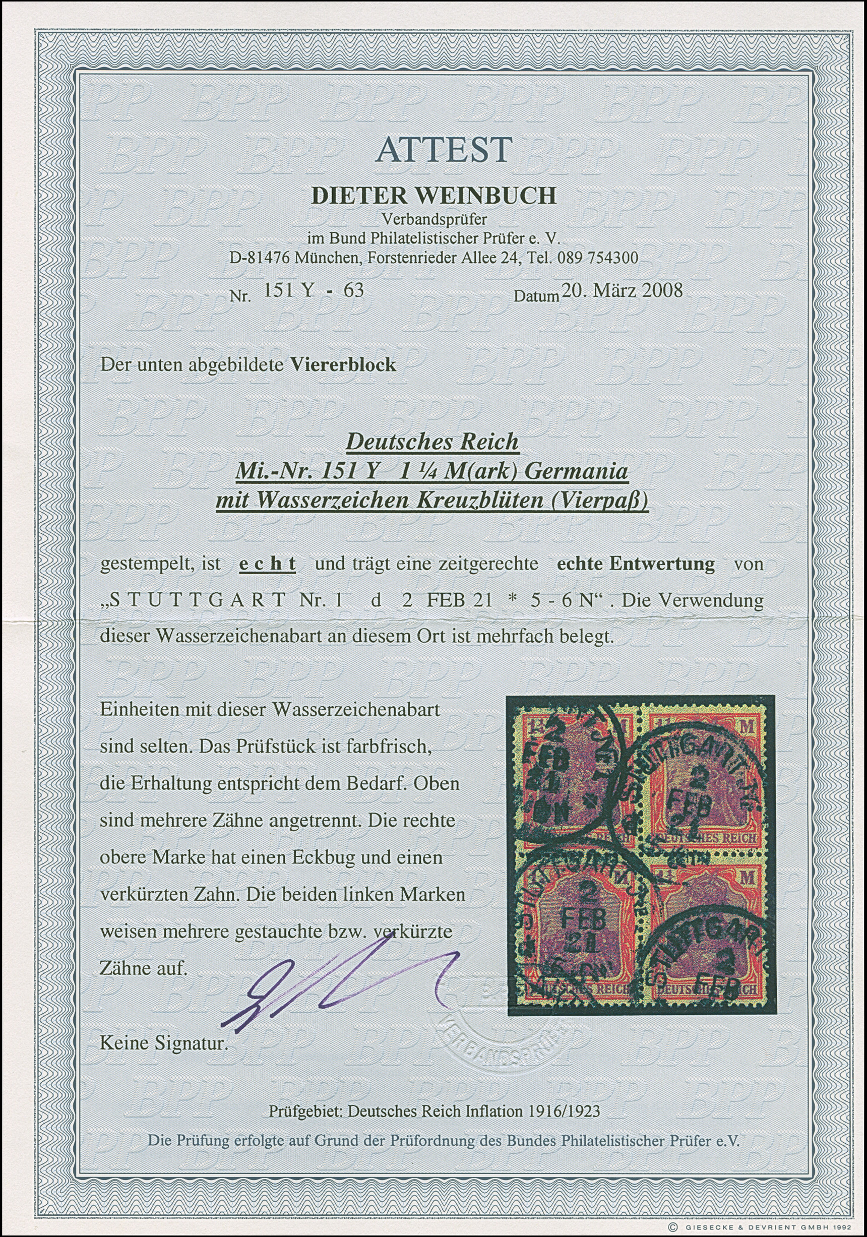 1920, Germania 1¼ M., Wasserzeichen Kreuzblüten (Vierpaß), im Viererblock, farbfrisch und meist gut gezähnt, sauber gestempelt “STUTTGART 2 FEB 21”, oben winzig angetrennt, leicht unregelmäßig gezähnt, leichter Eckbug, eine attraktive und sehr seltene Einheit, Fotoattest Weinbuch BPP (2008)