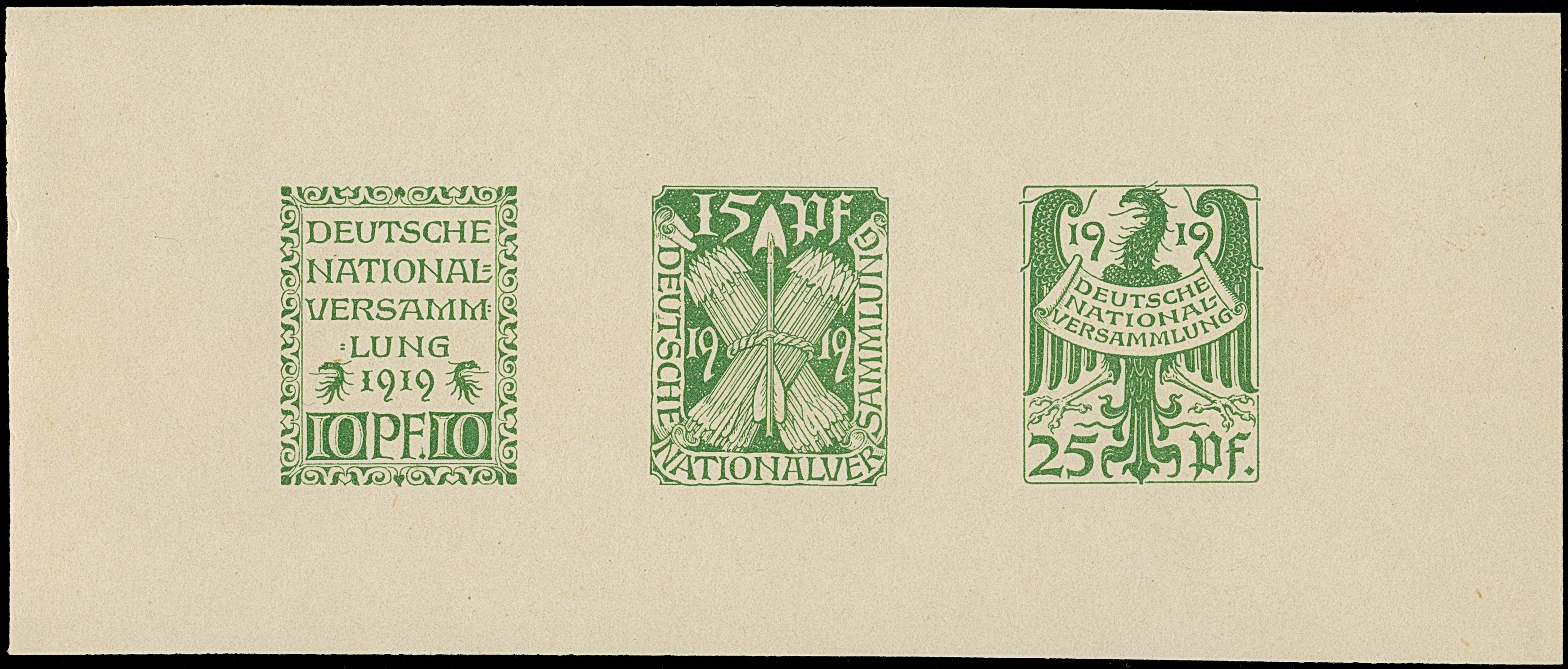 1919, Nationalsversammlung, Essais 10 Pfg.-25 Pfg., Einzelabzüge in Zusammendruck-3er-Streifen in grün (22x28mm) auf Kleinbogen (146x61mm), sehr gute Erhaltung, selten (Theuss Abb.15)