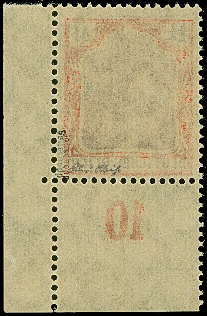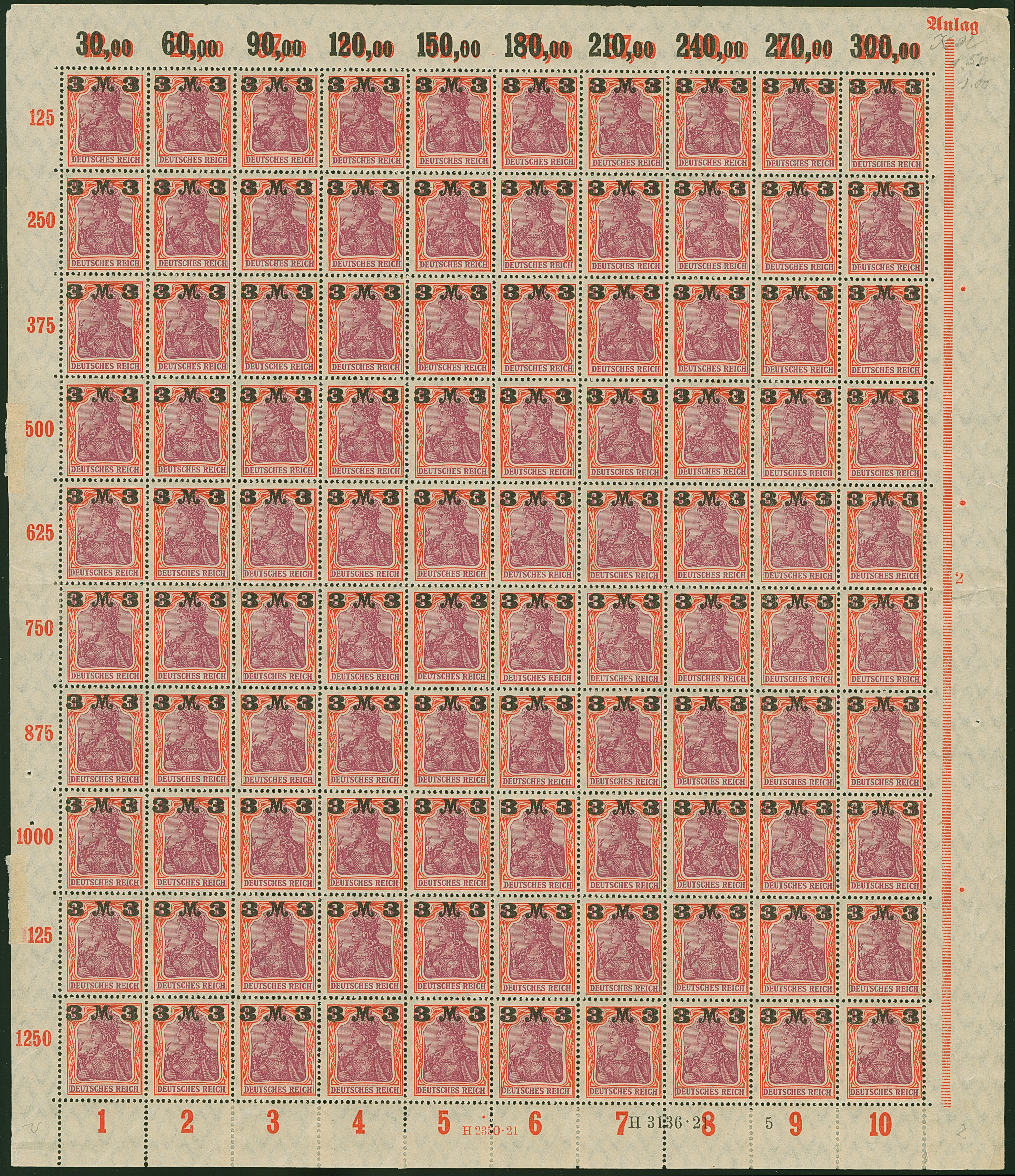1921, Germania mit neuem Aufdruck 1,60-10 M., je im kpl. Bogen mit Ur-HAN und Aufdruck-HAN, 10 M. mit rußigem Aufdruck, postfrisch, teils Falzreste bzw. Stützreparaturen (Mi. ohne HAN etc. 810,-)