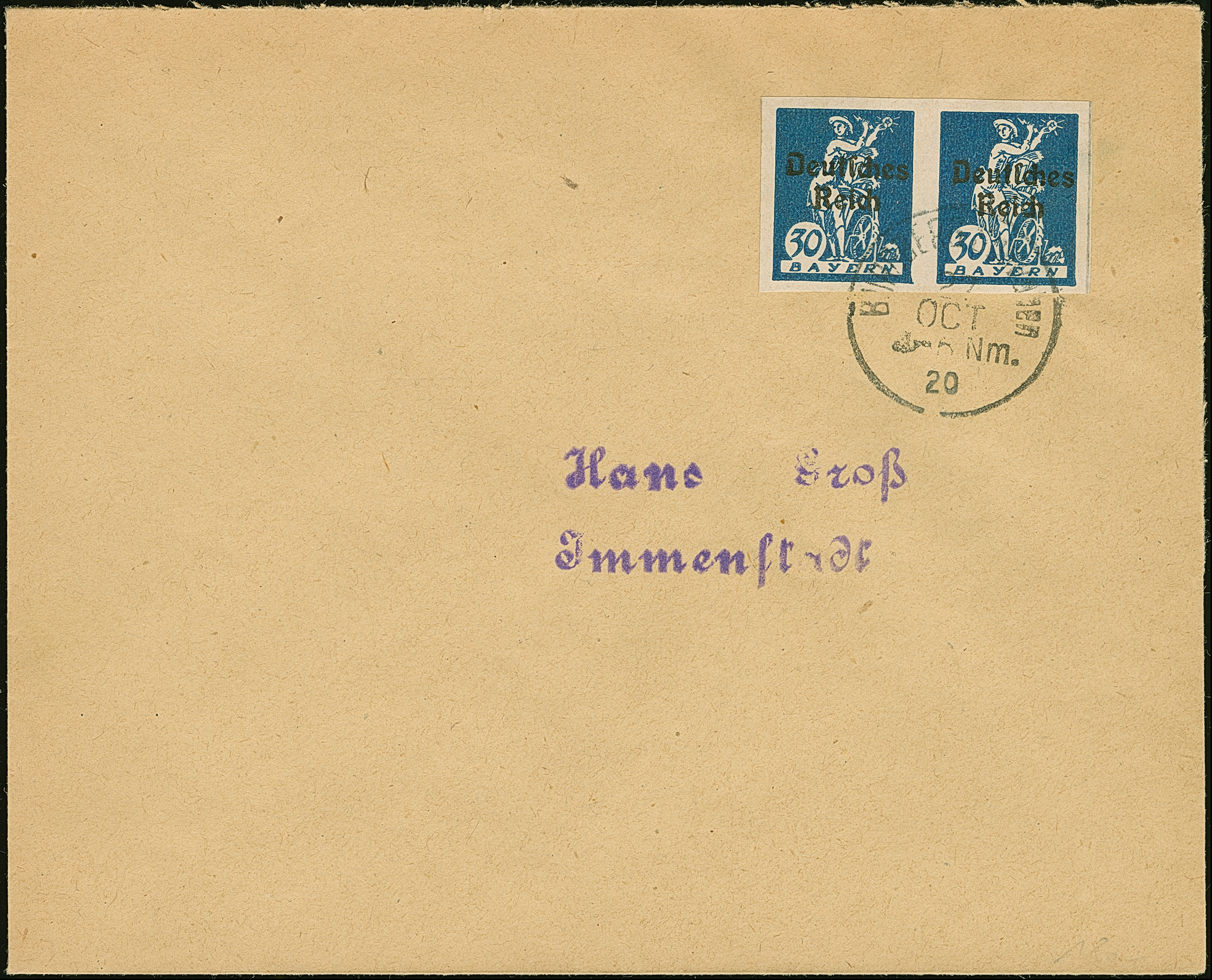 1920, Bayern-Abschied 30 Pfg., ungezähntes waagerechtes Paar, sauber mit Stempel auf Blanko-Brief, tadellos, inenn sign. Infla und Winkler BPP