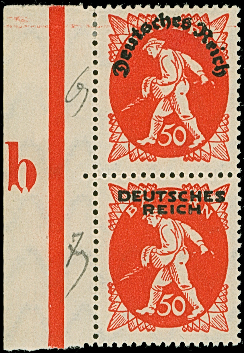 1920, Bayern-Abschied, 50 Pfennig, Aufdruck-Essay, senkrechtes Seitenrandpaar mit Druckerzeichen “b”, mit zwei verschiedenen Aufdruckvarianten “Deutsches Reich”, die obere Marke ungebraucht, die untere postfrisch, tadellos, in Verbindung mit dem Druckerzeichen eine sehr seltene Einheit, Befund Winkler BPP (2012)