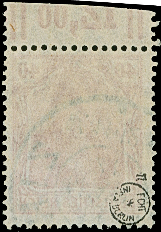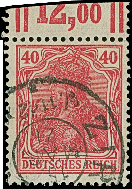 1920, Germania 40 Pfg. rot, Walzdruck-Oberrandstück mit Konfiguration “3'7'3”, sauber gestempelt, der Oberrand beschnitten, sonst tadellos, sign. Infla sowie Kurzbefund Winkler BPP (2011)