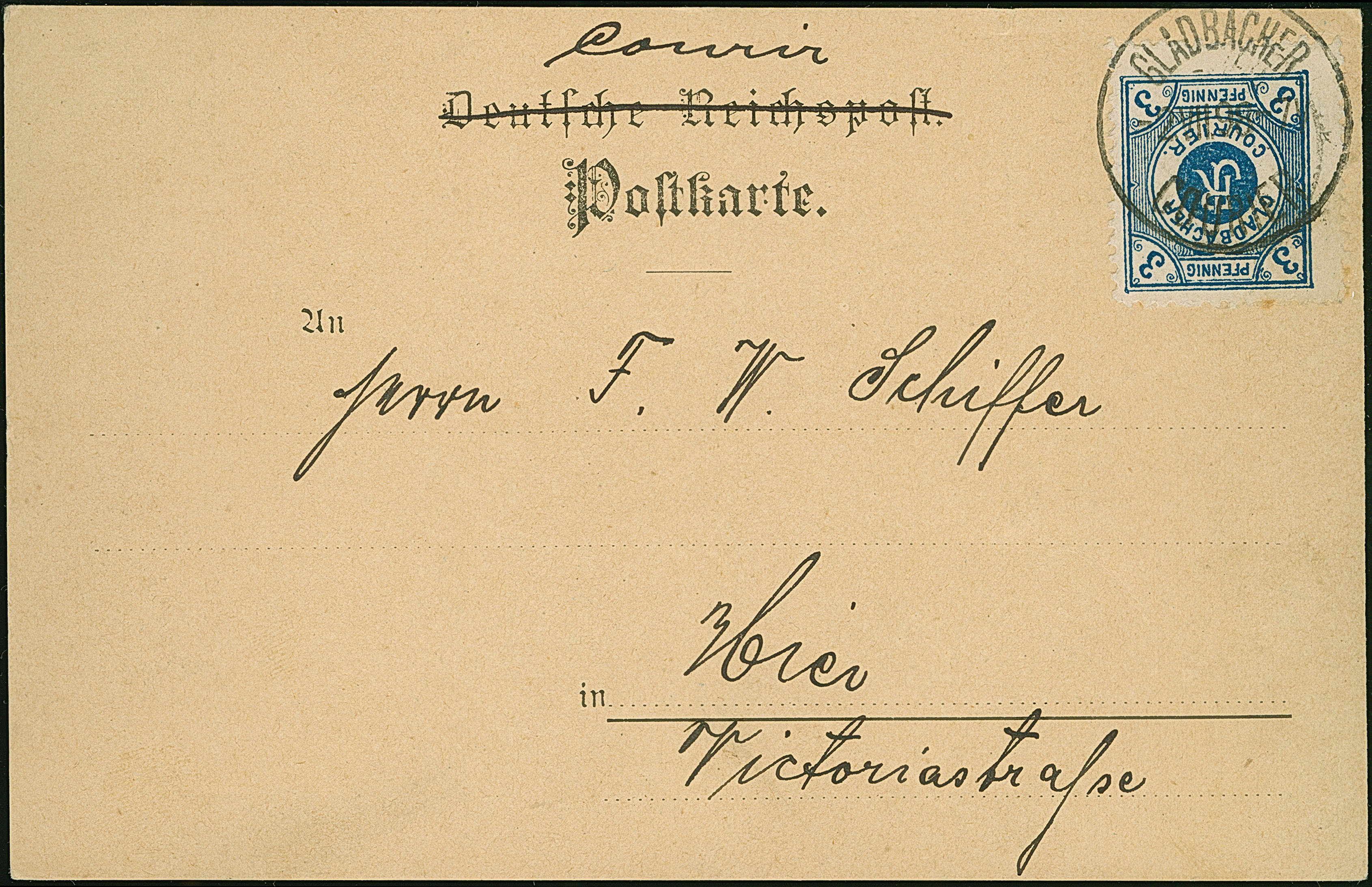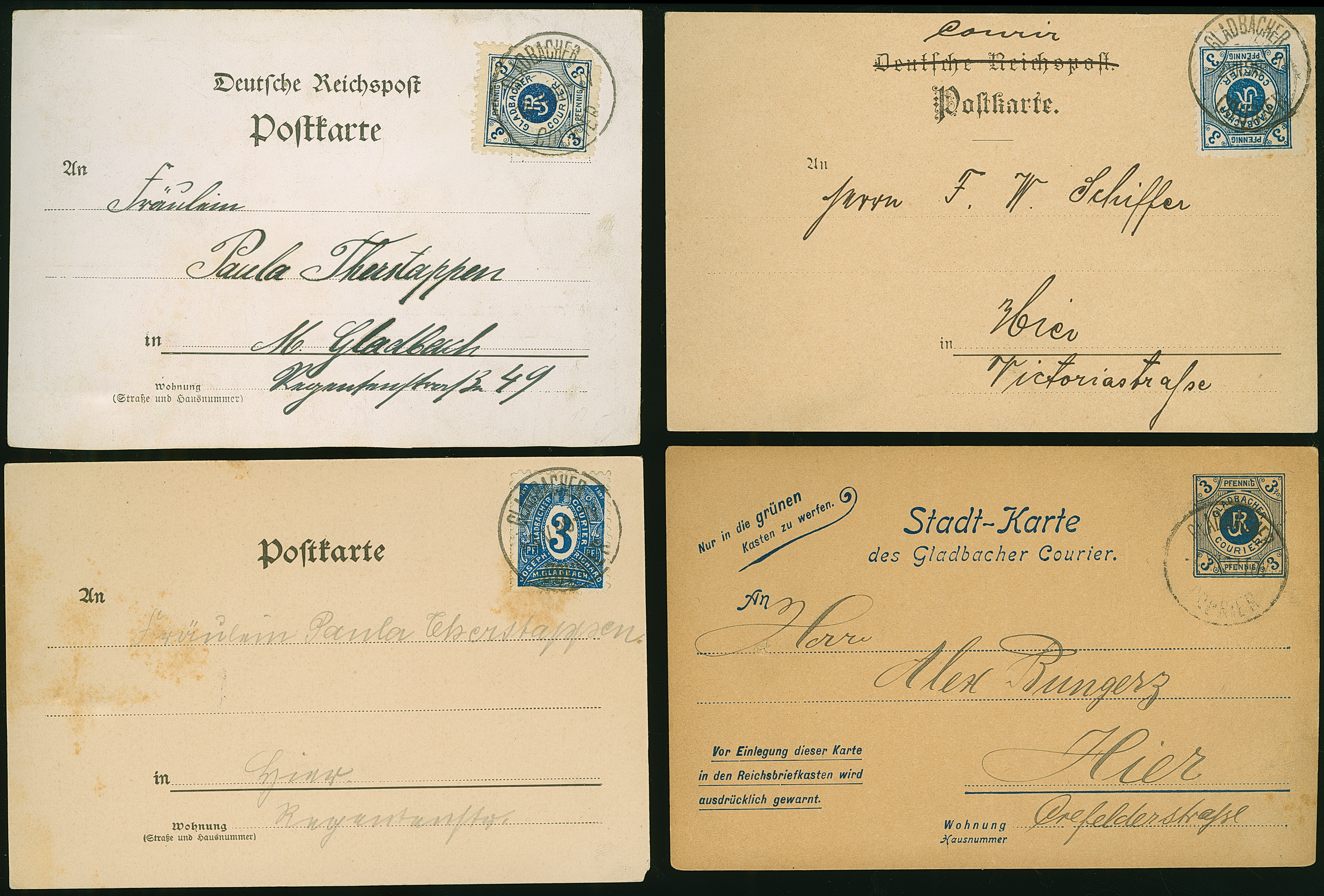 Gladbacher Courier: 1897/99, Ausgabe 1897 3 Pfg. blau, zwei Einzelmarken auf zwei Postkarten, dazu weitere Postkarte mit Ausgabe 1899 3 Pfg. dunkelblau und Ganzsachenkarte 3 Pfg. blau gebraucht mit viel Text. Eine Karte mit Altersflecken, ansonsten in guter Erhaltung (Mi.-Nr. 2,7b,P1)