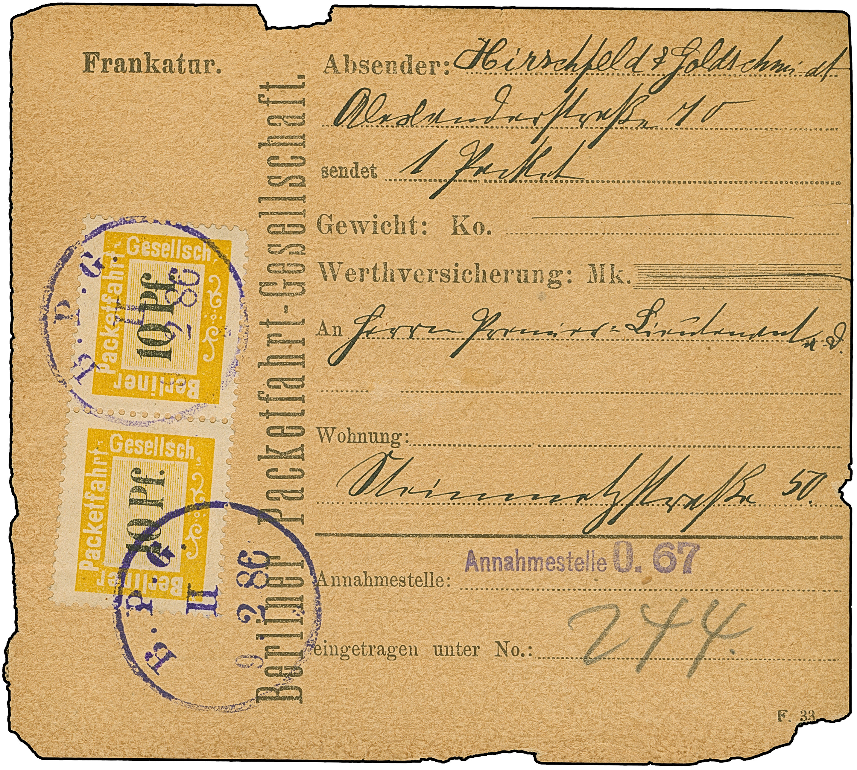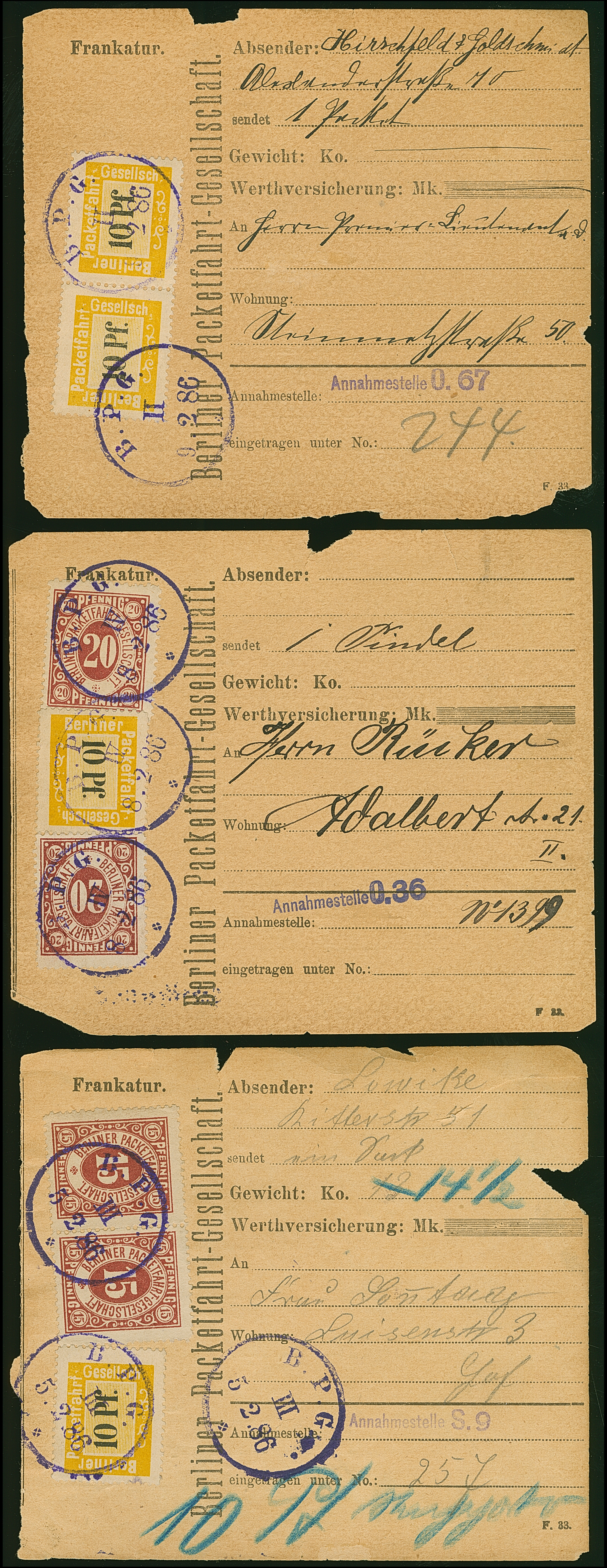 Berliner Packetfahrt Gesellschaft: 1884/86, drei frankierte Paketkarten aus 1886 mit waagerechtem Paar Ausgabe 1884 10 Pfg. gelb als Mehrfachfrankatur, 2. Paketkarte mit waagerechtem Paar Ausgabe 1885/86 15 Pfg. lilabraun und Einzelwert 10 Pfg. gelb und 3. Paketkarte mit zwei Einzelwerten 20 Pfg. rotbraun und Einzelwert 10 Pfg. gelb. Alle drei Paketkarten haben Randfehler, die Marken sind in einwandfreier Erhaltung (Mi.-Nr. ex3-11)