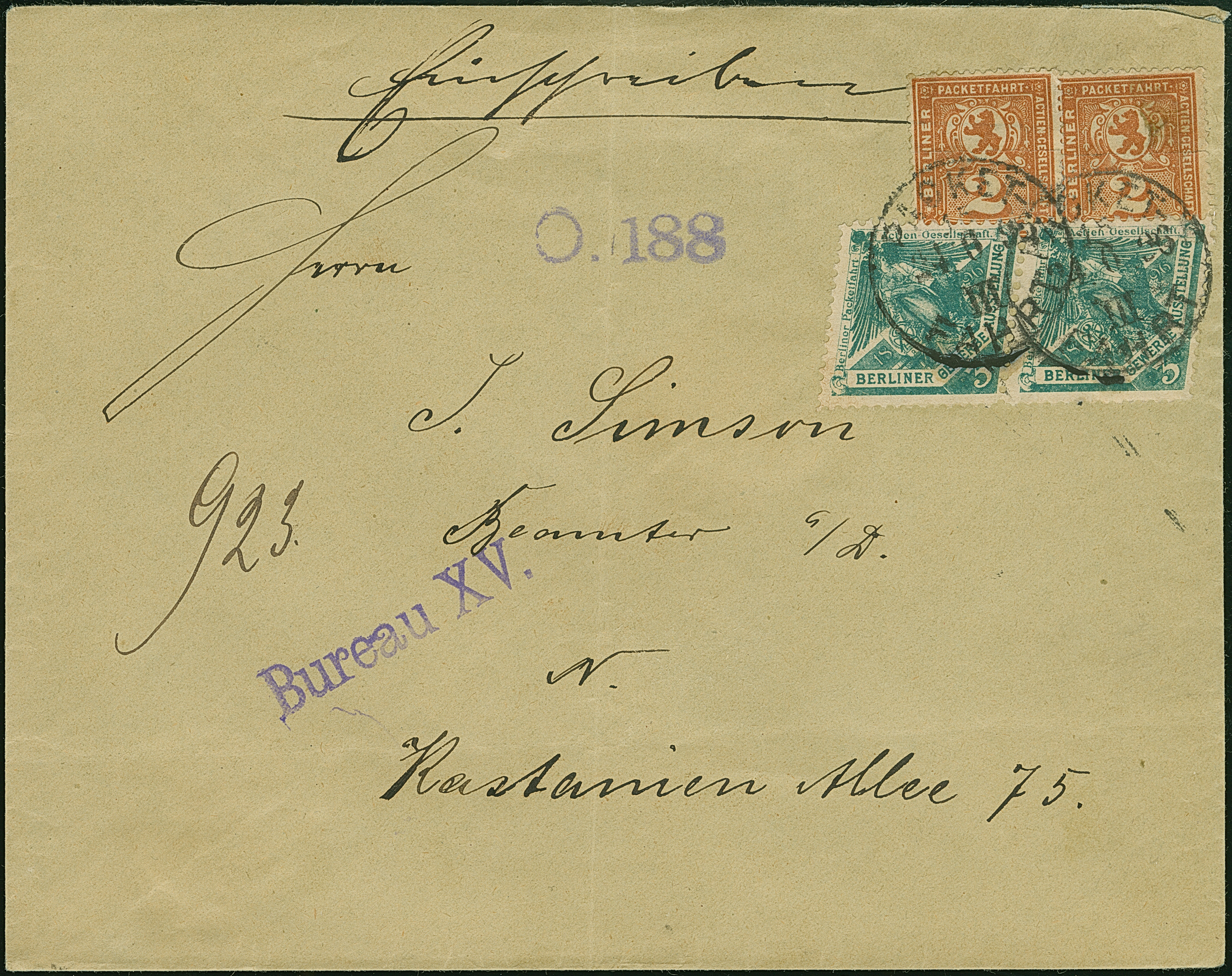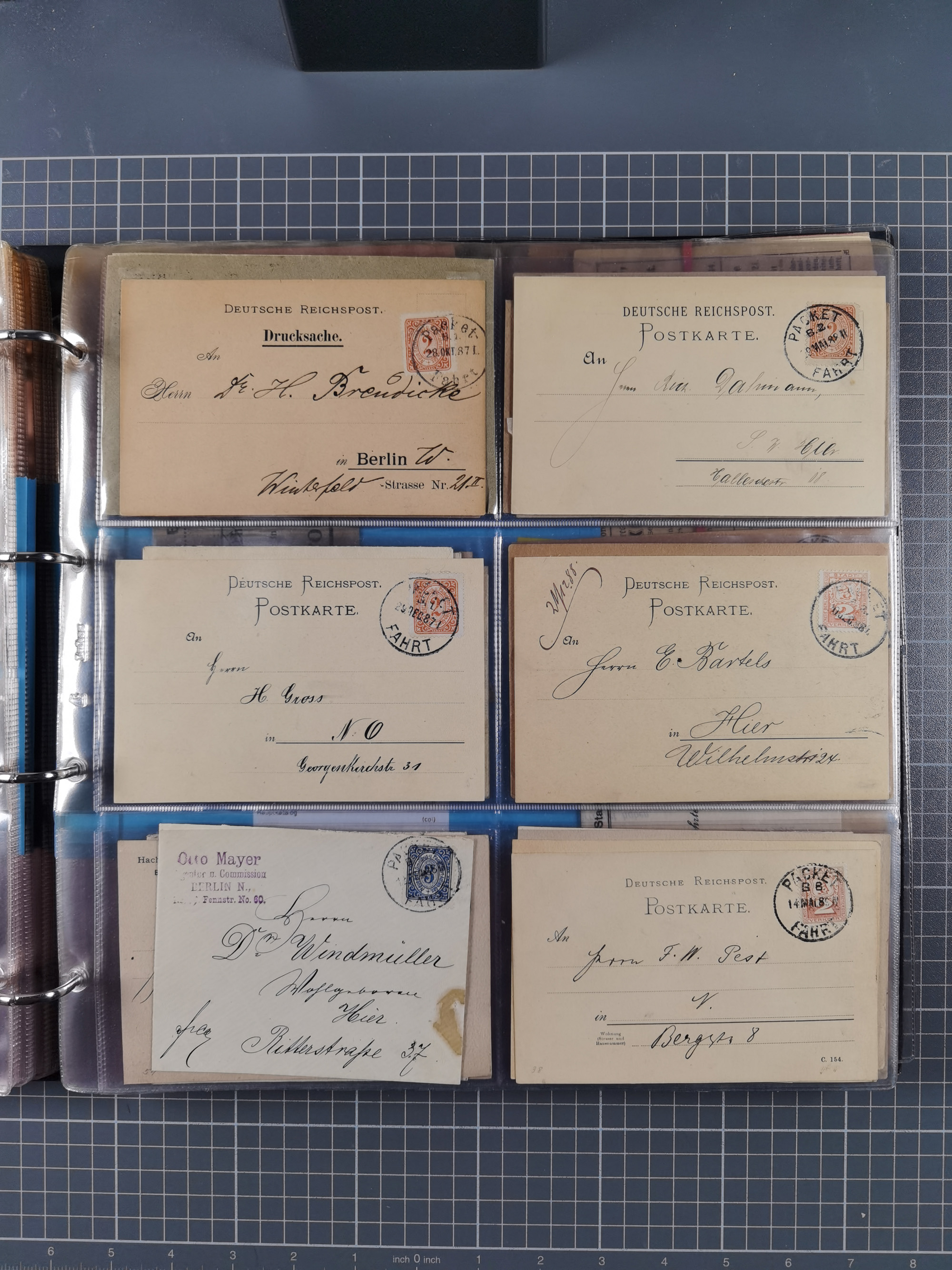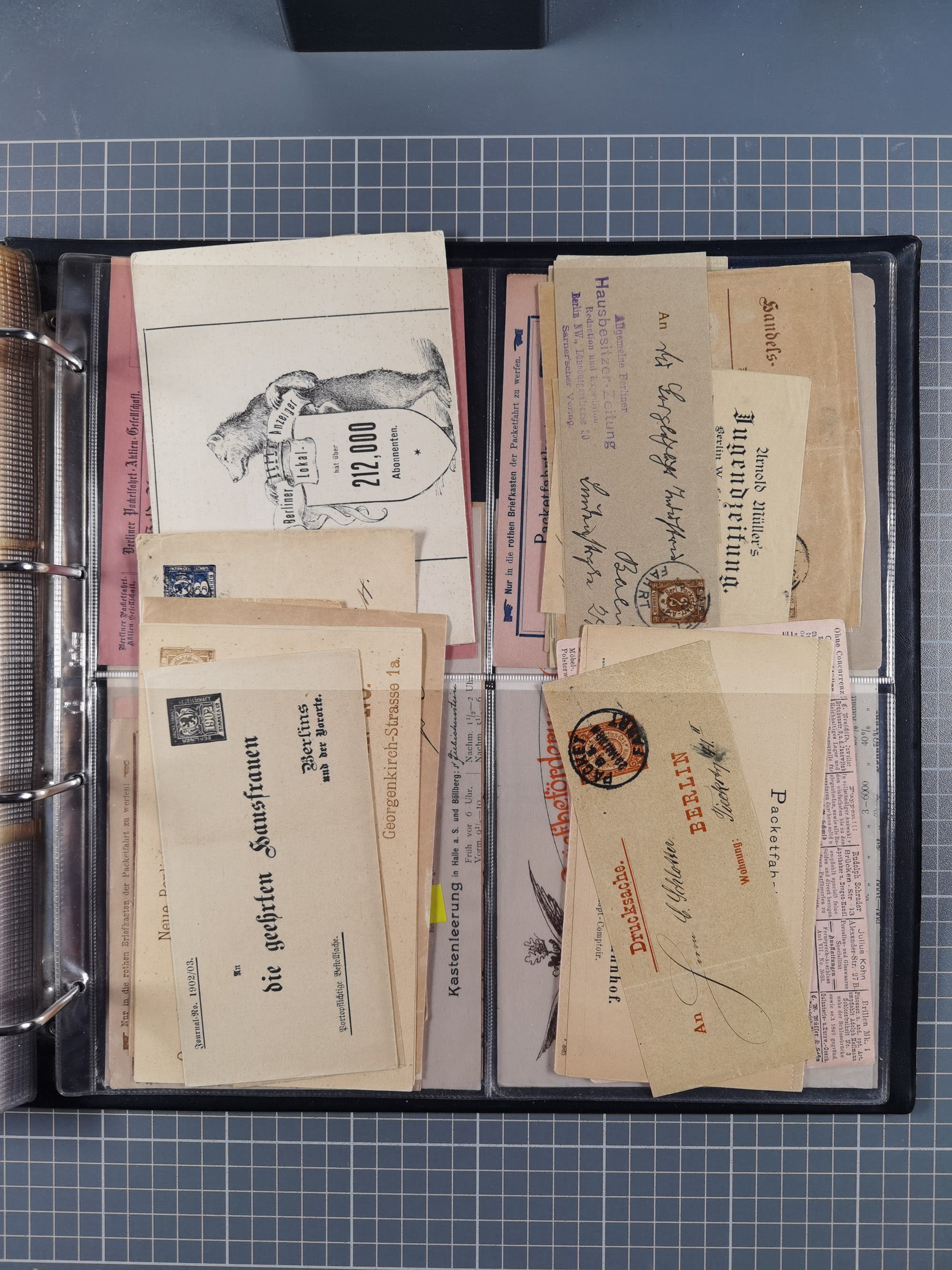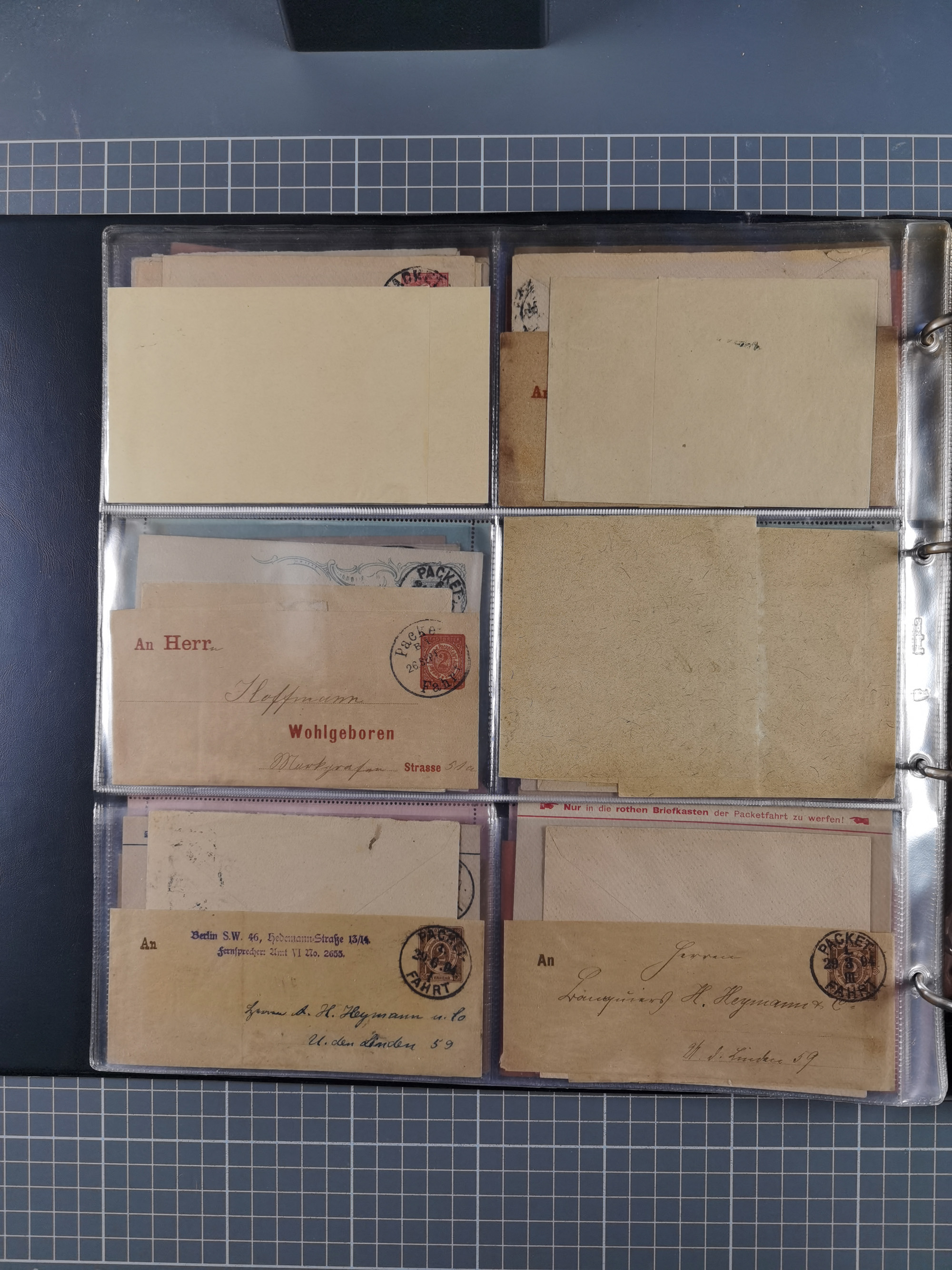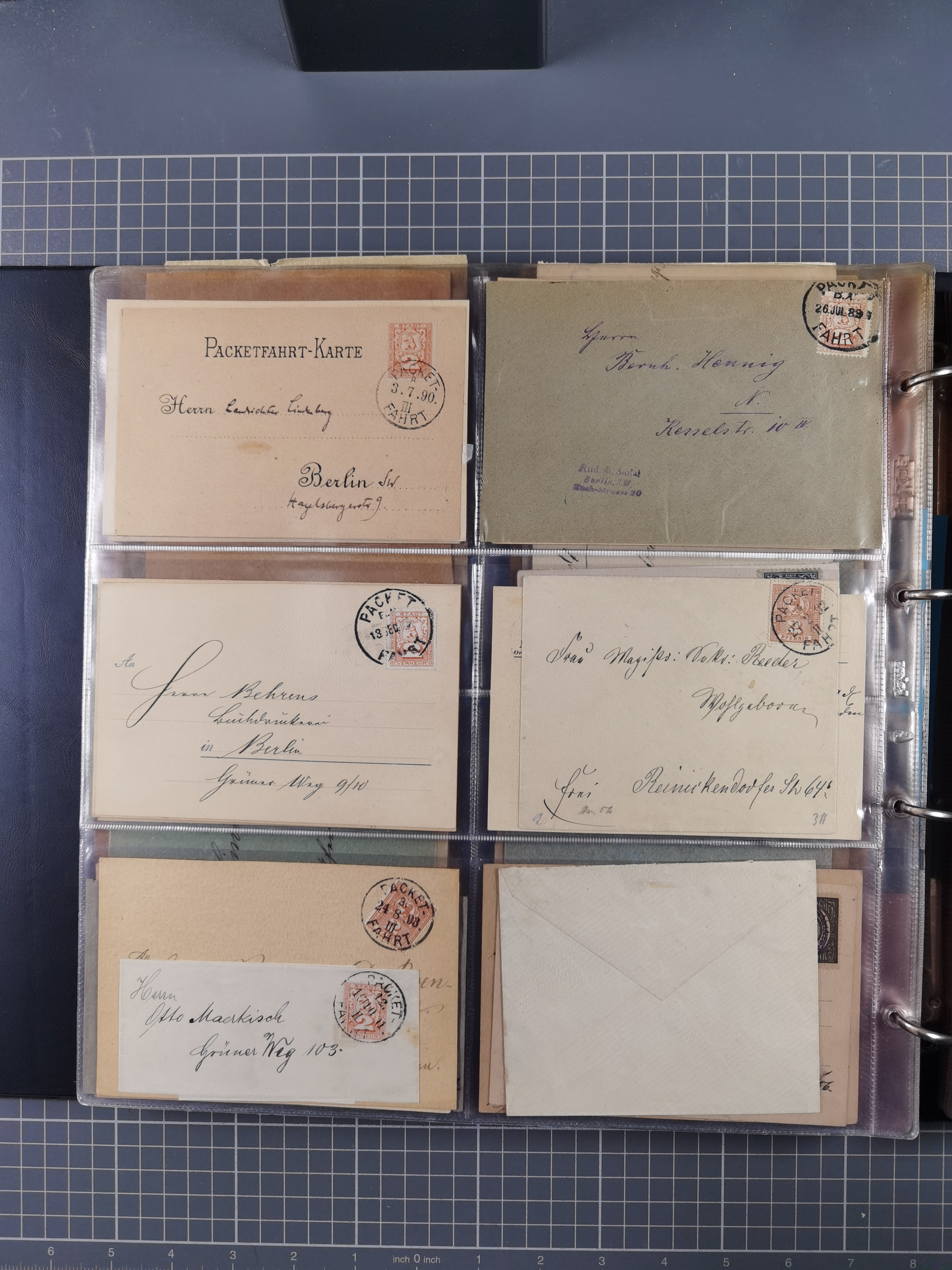Berlin-Berliner Packetfahrt-Gesellschaft: 1886/1915, frankierte Post mit ca. 90 Briefen, Karten und Drucksachen mit diversen Frankaturen und 2 Belge nur mit Aufgabestempel (1x mit L2 für Eilboten-Versand). Dabei u.a. neun R-Briefe (meist mit Einzelfrankatur 10 Pfg.), ein Brief 1887 mit GAA 3 Pfg., Ausgabe 1886 2 Pfg. gelbbraun auf Drucksachen-Streifband “Der Sammler”, Mi.-Nr. 40 auf Brief, 5x Mi.-Nr. 63 auf R-Briefteil und Mi.-Nr. 89 auf Vordruckbrief mit Maschinenstempel “PACKETFAHRT BERLIN 1.5.15”