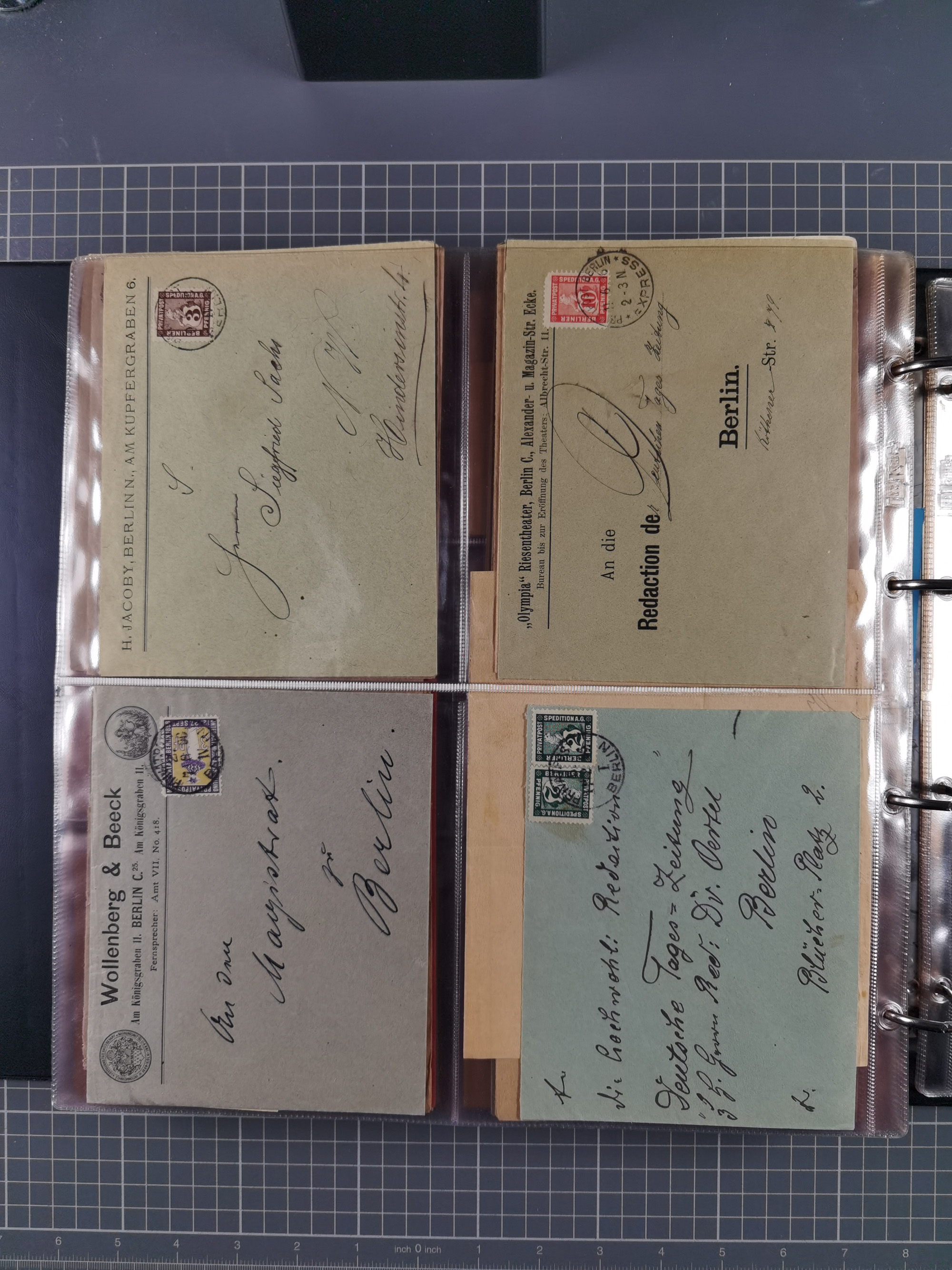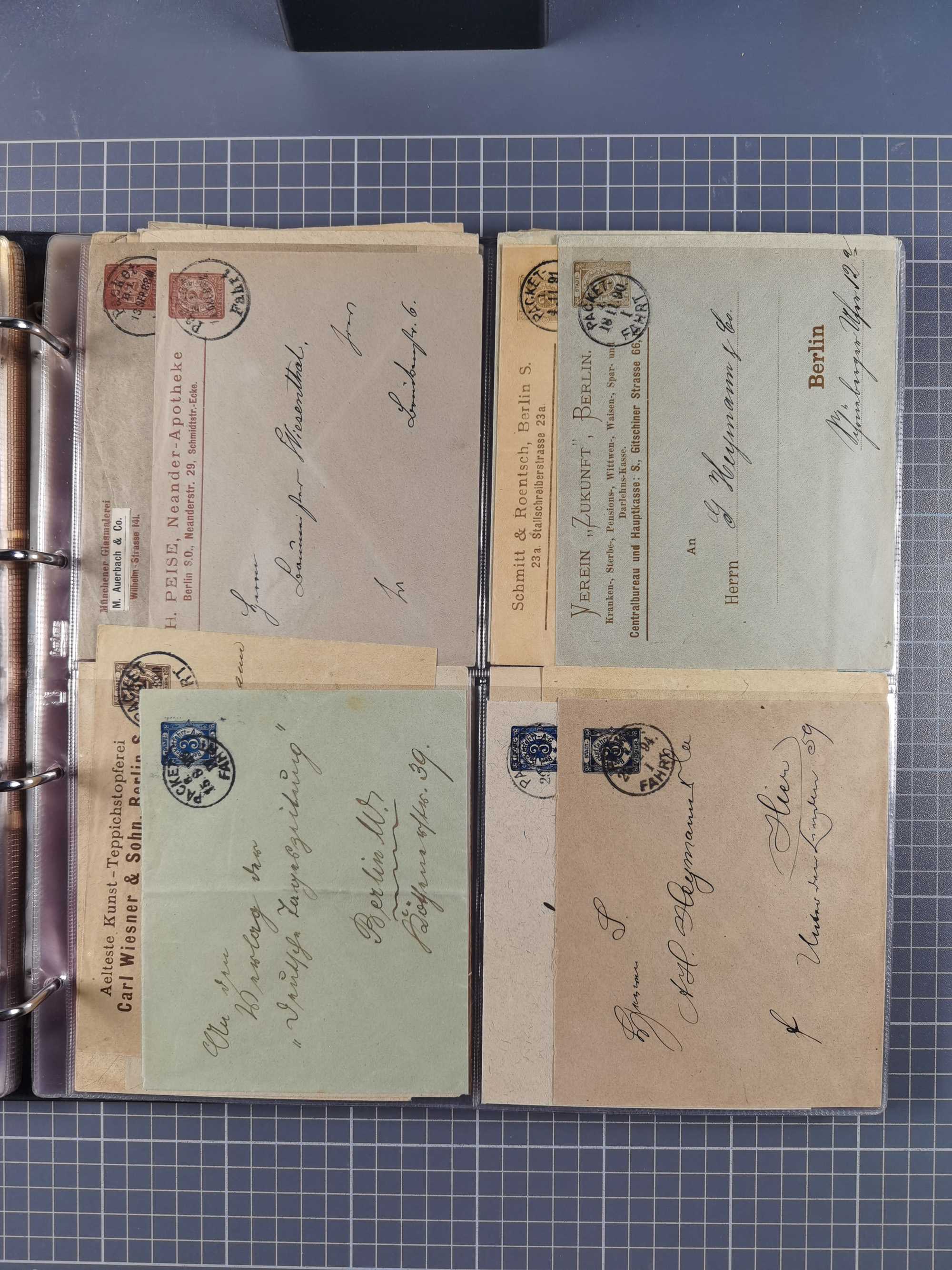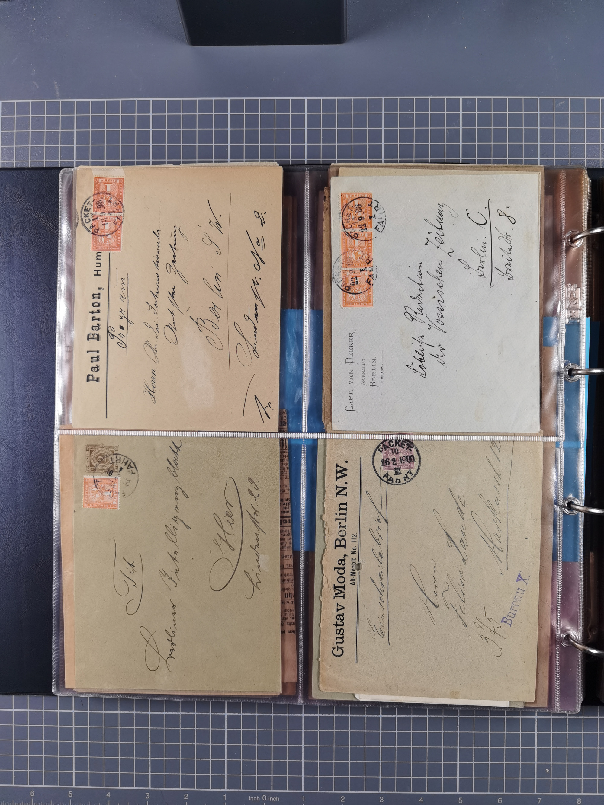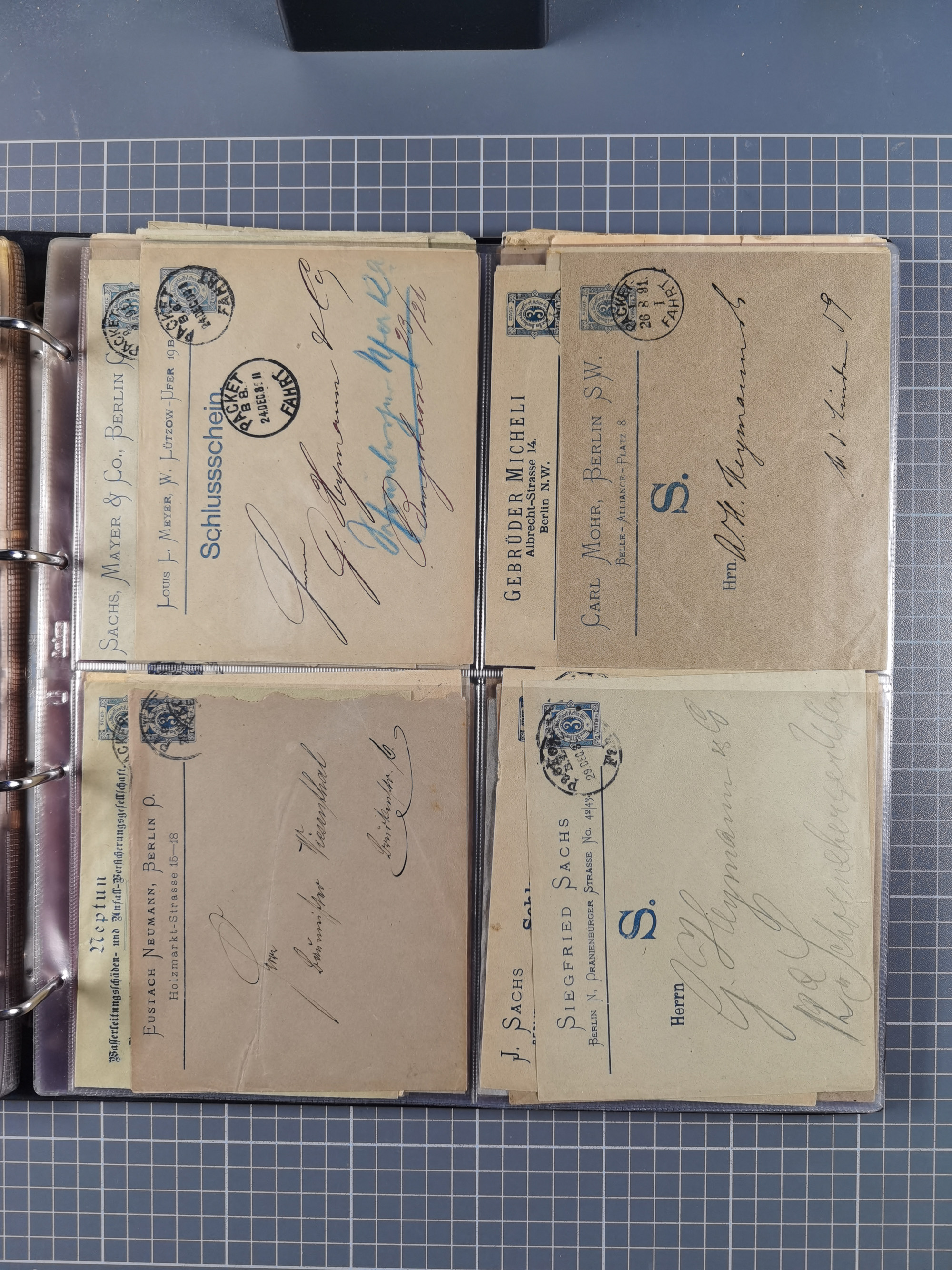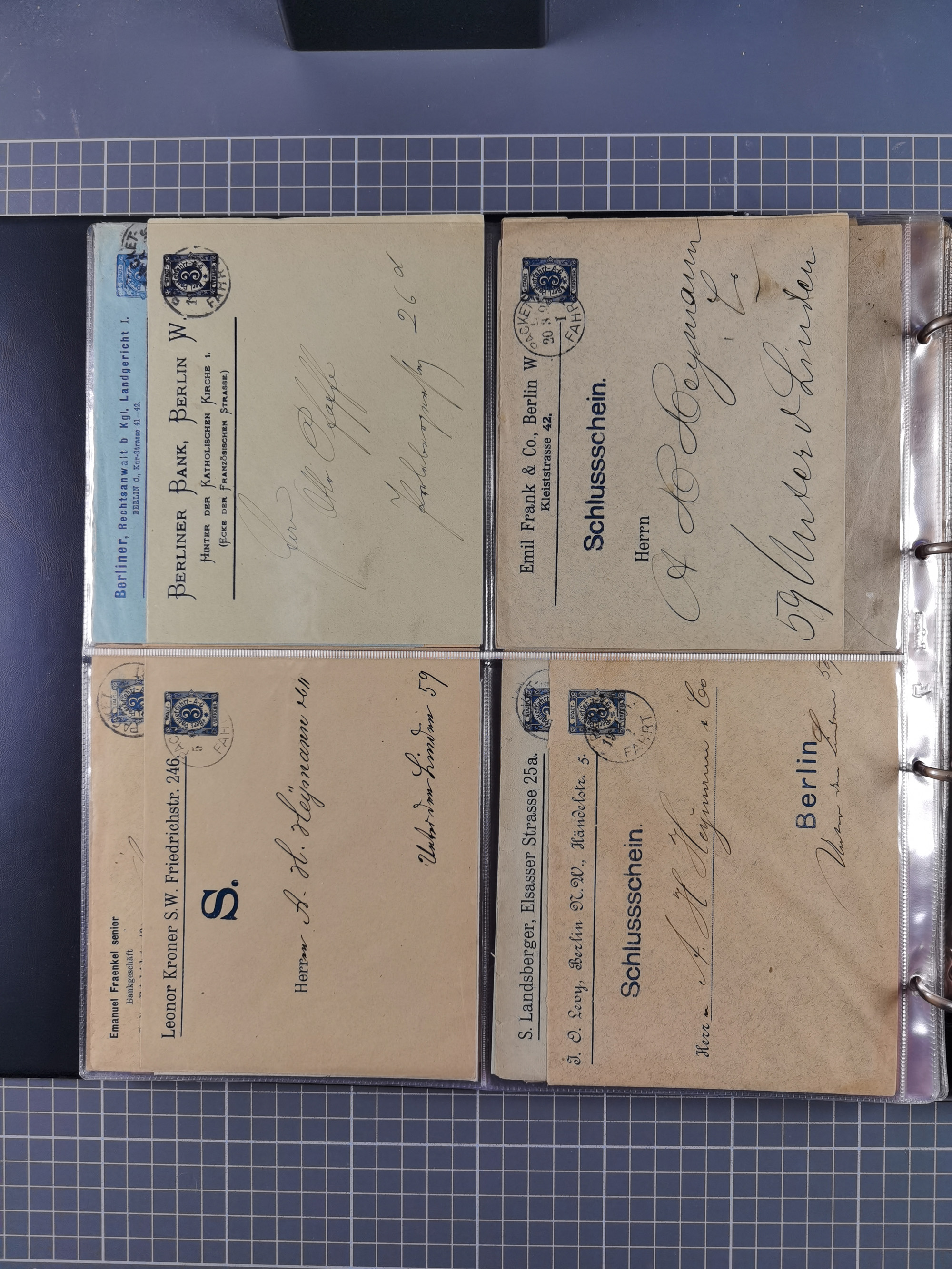 Berlin-Berliner Packetfahrt-Gesellschaft: 1886/1915, frankierte Post mit ca. 90 Briefen, Karten und Drucksachen mit diversen Frankaturen und 2 Belge nur mit Aufgabestempel (1x mit L2 für Eilboten-Versand). Dabei u.a. neun R-Briefe (meist mit Einzelfrankatur 10 Pfg.), ein Brief 1887 mit GAA 3 Pfg., Ausgabe 1886 2 Pfg. gelbbraun auf Drucksachen-Streifband “Der Sammler”, Mi.-Nr. 40 auf Brief, 5x Mi.-Nr. 63 auf R-Briefteil und Mi.-Nr. 89 auf Vordruckbrief mit Maschinenstempel “PACKETFAHRT BERLIN 1.5.15”
