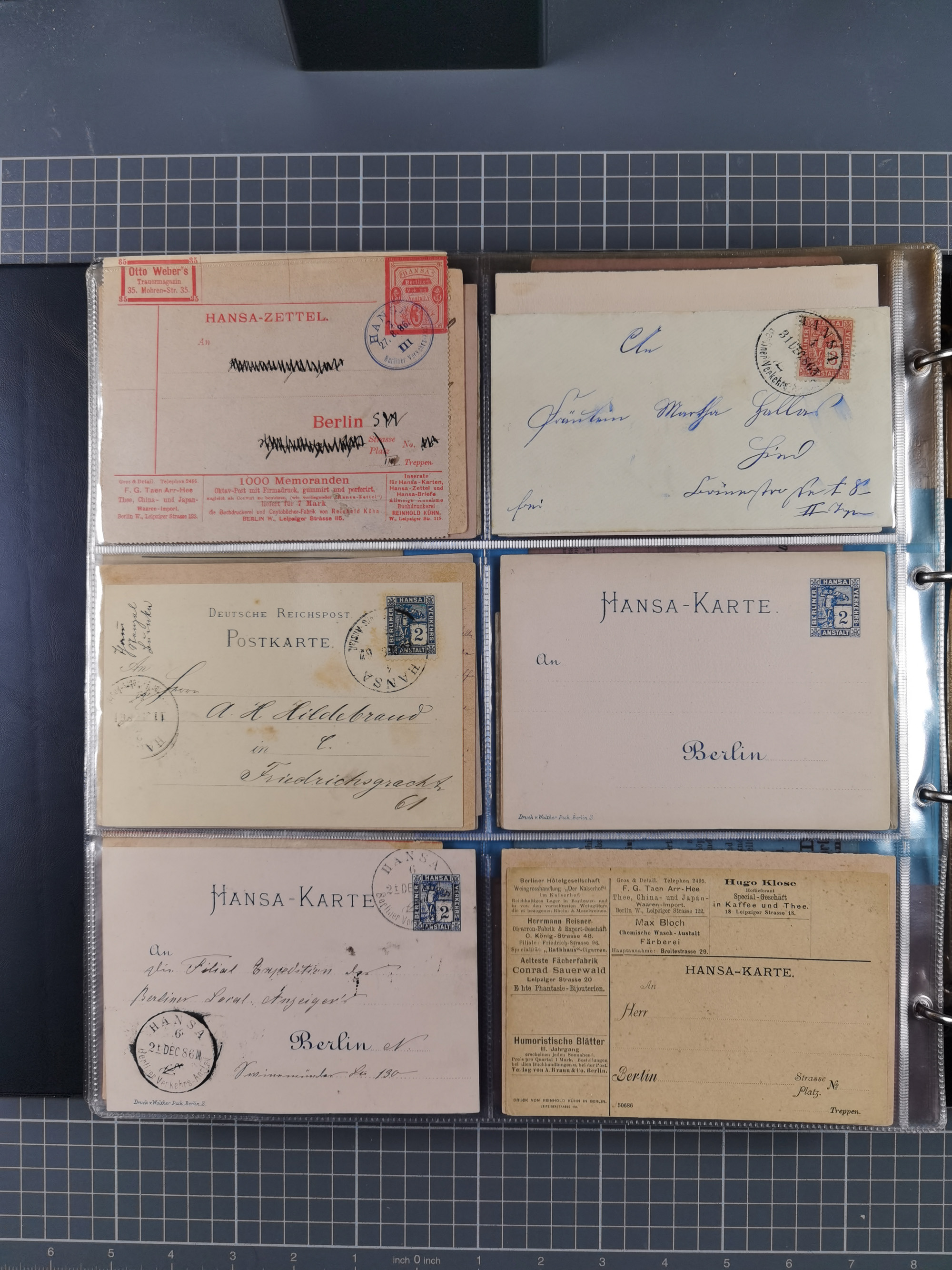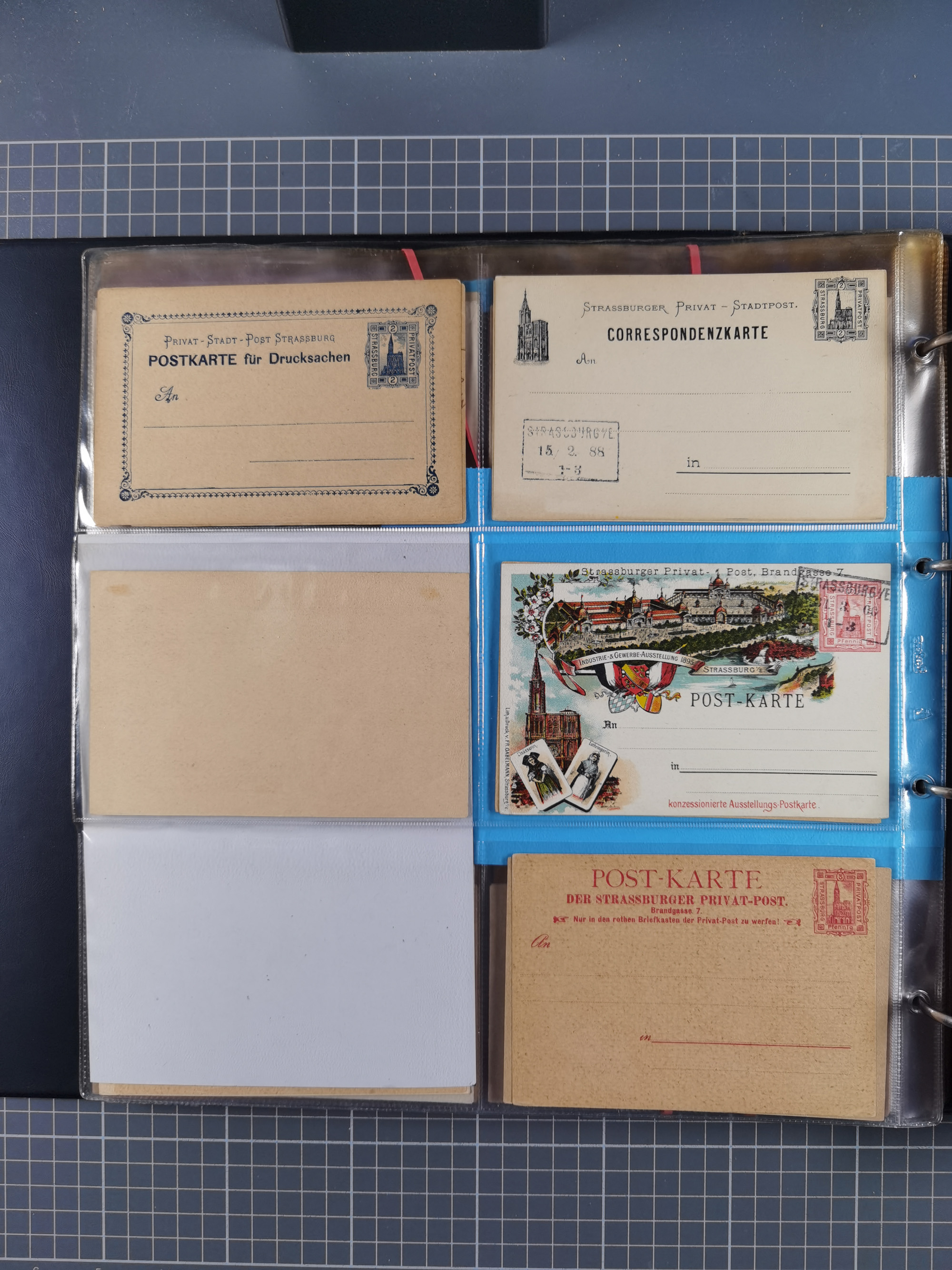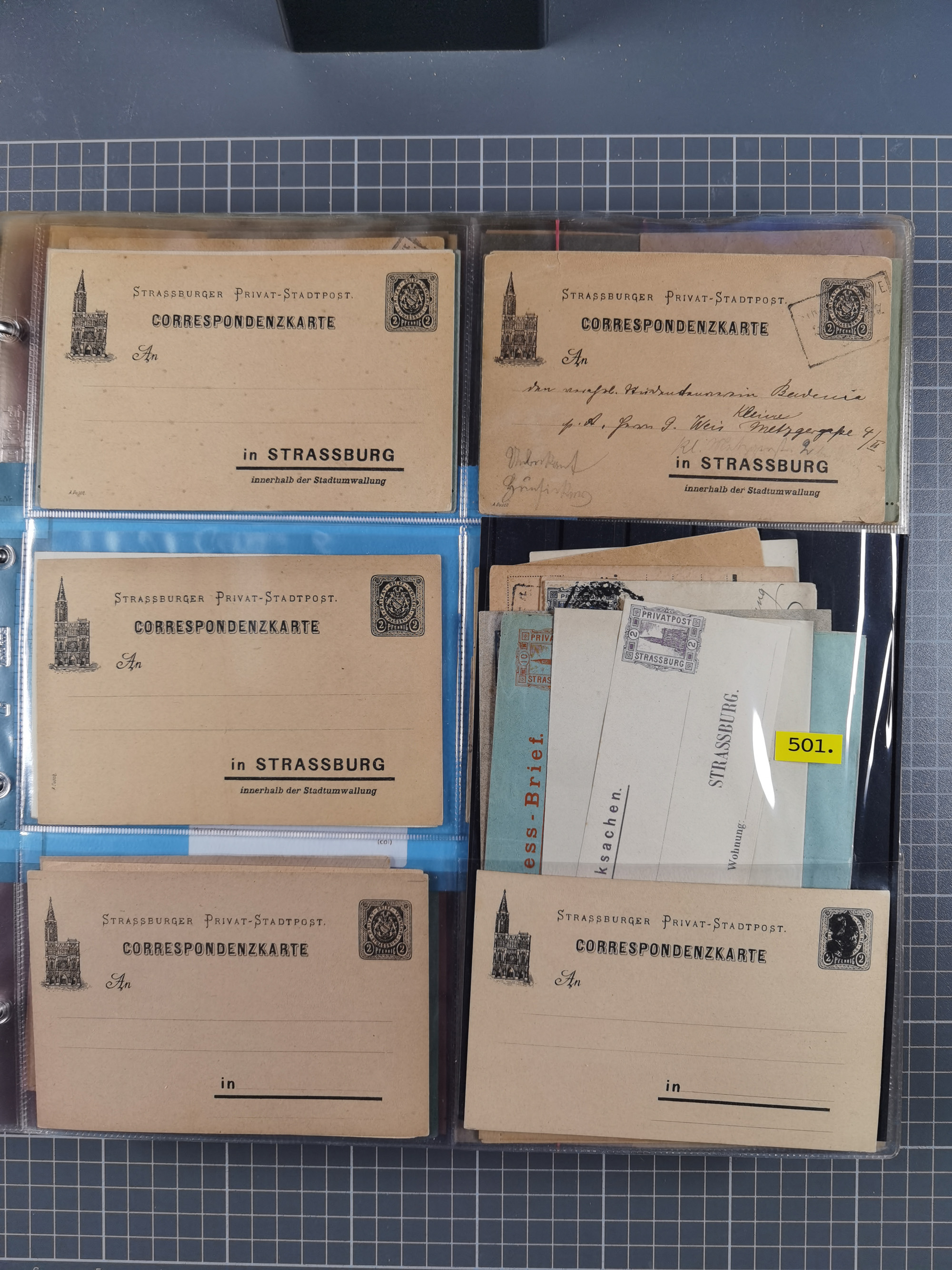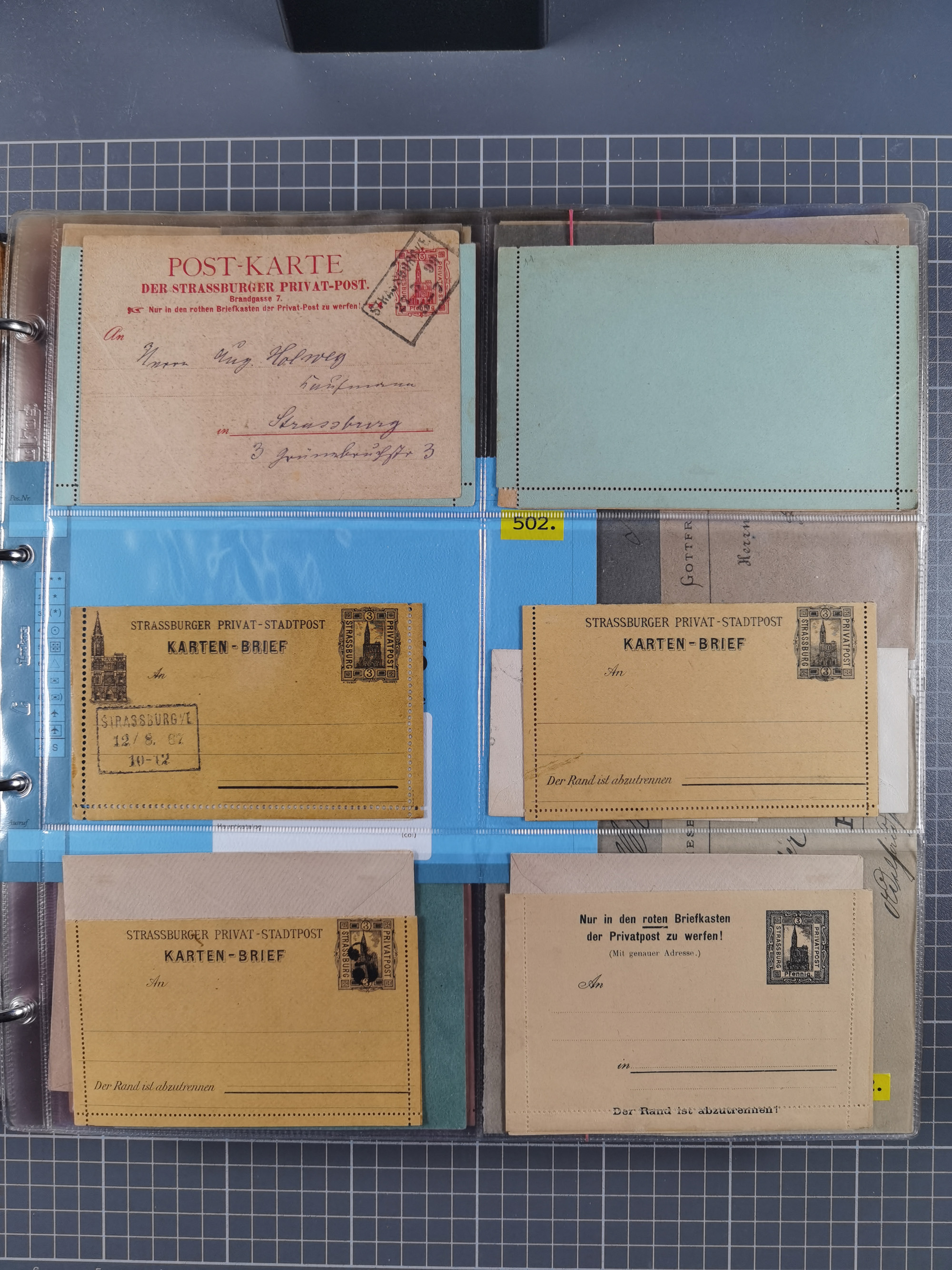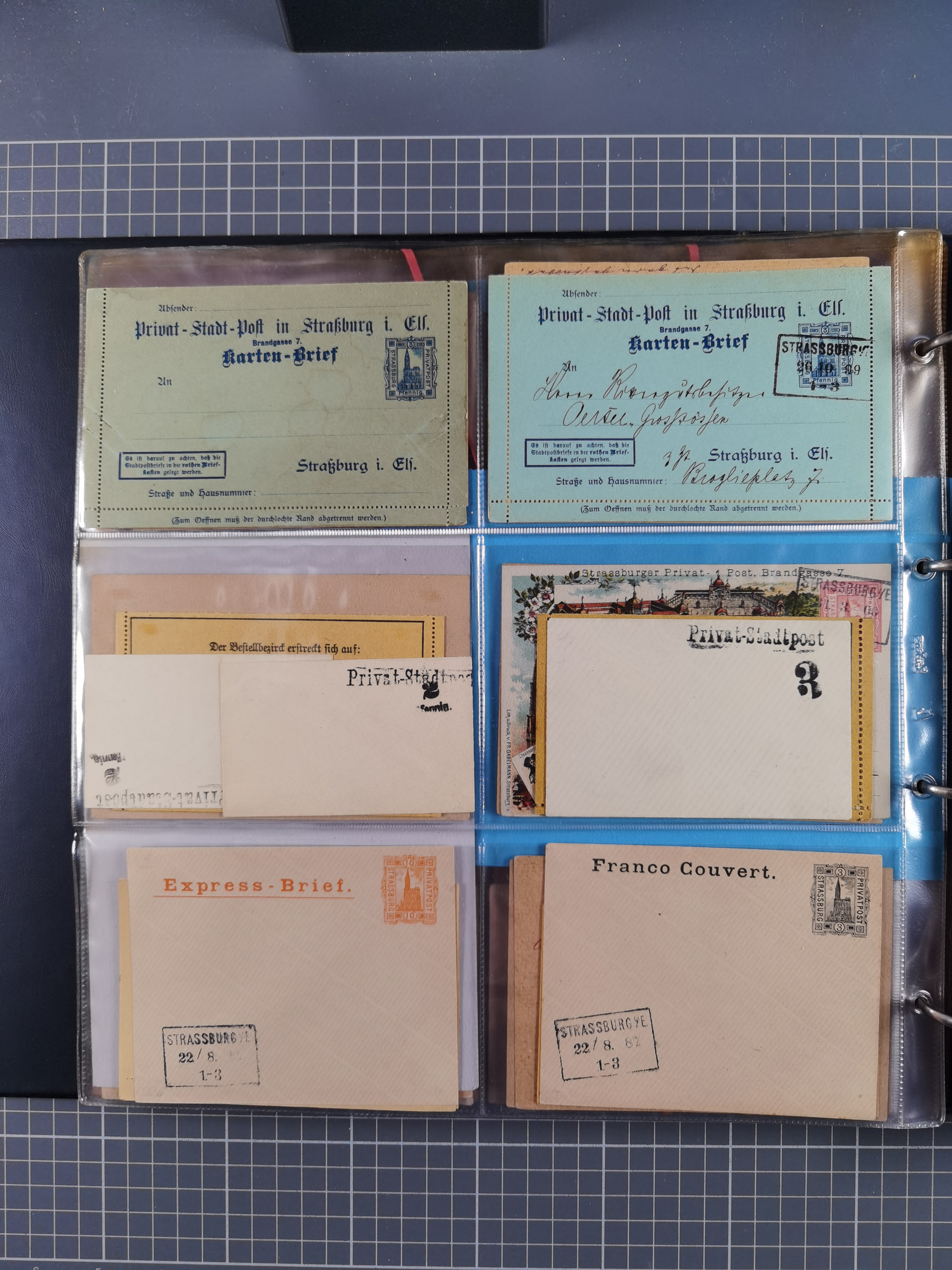 Straßburg-Privat-Brief-Verkehr: 1886/1900, kleine Sammlung mit 35 Briefen, Karten und Ganzsachen inkl. Postkarte mit Hansa Mi.-Nr. 5 ohne Text. Dabei u.a. Mi.-Nr. 2 auf Postkarte mit Grußtext, zwei Briefe mit Mi.-Nr. 34, bedargsgebrauchte Ganzsachen und P18 ungebraucht