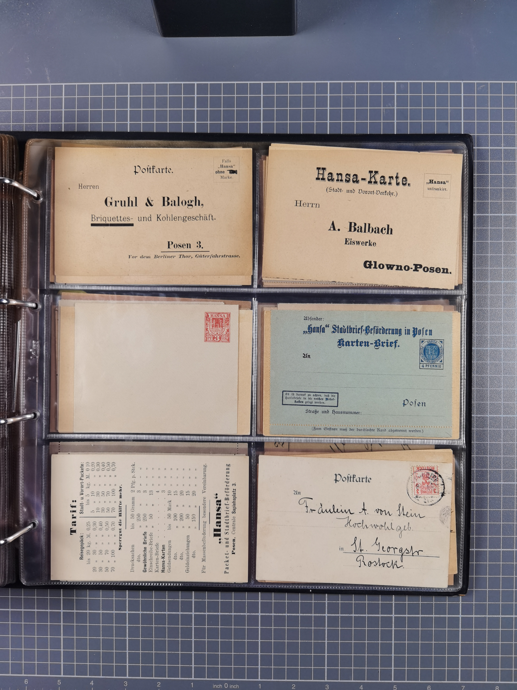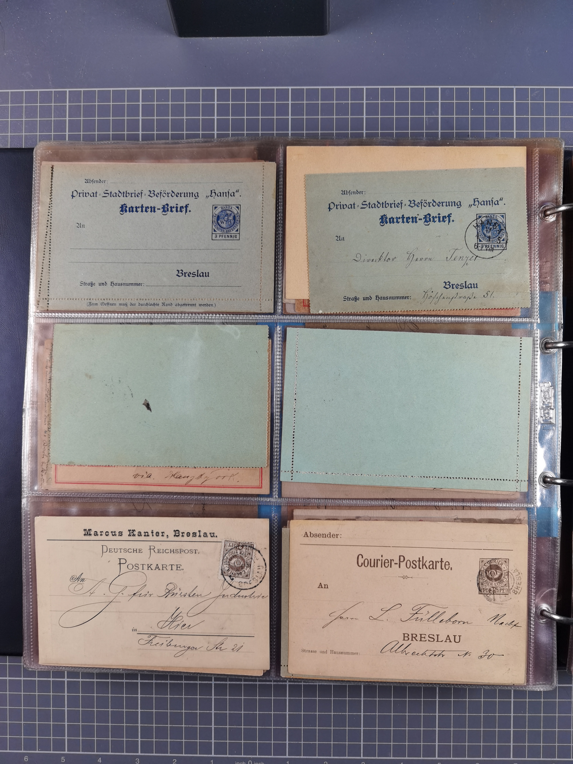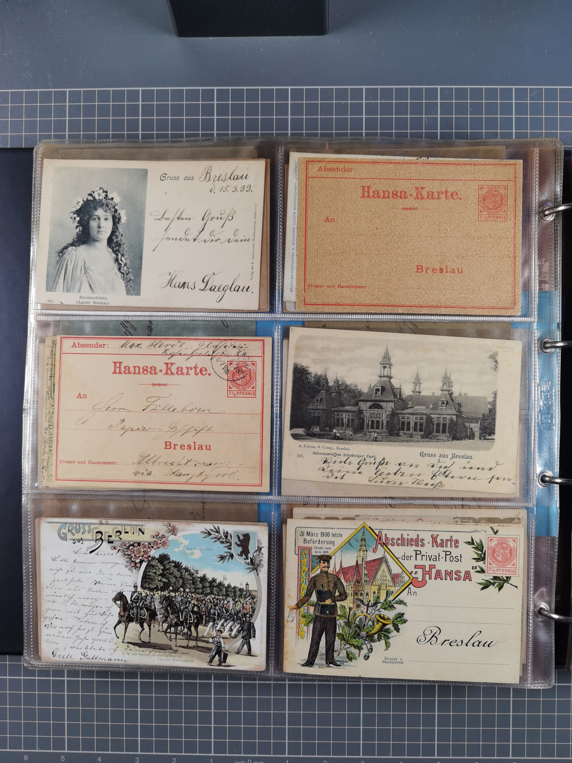 Breslau-HANSA: 1893/1900, fast 50 Briefe, Karten, ungebrauchte und gebraucht Ganzsachen und Formulare. Dabei u.a. zwei Briefe mit Mi.-Nr. 12 und P7I ungebraucht. Dazu Stadtpost Courier mit Mi.-Nr. 8 auf Firmenkarte und P1, K1 und K2 gebraucht