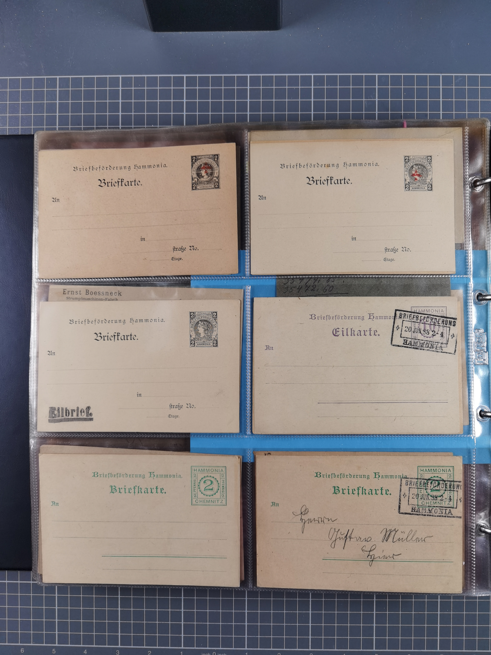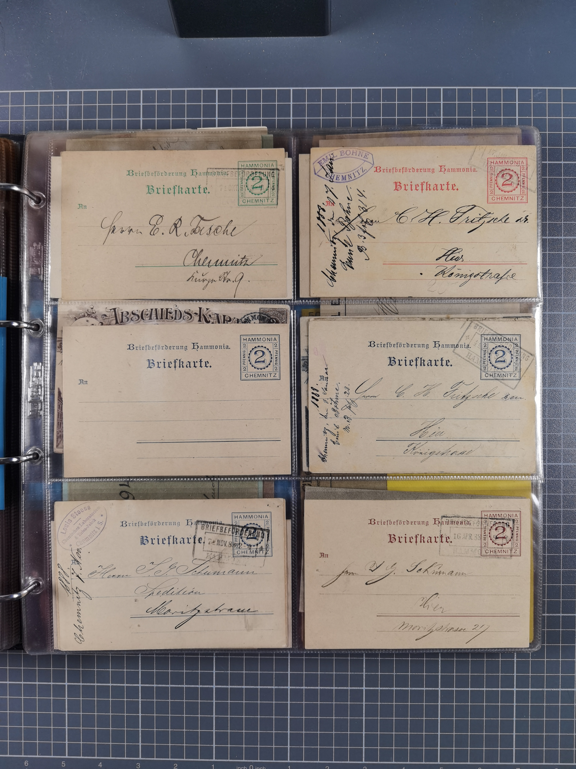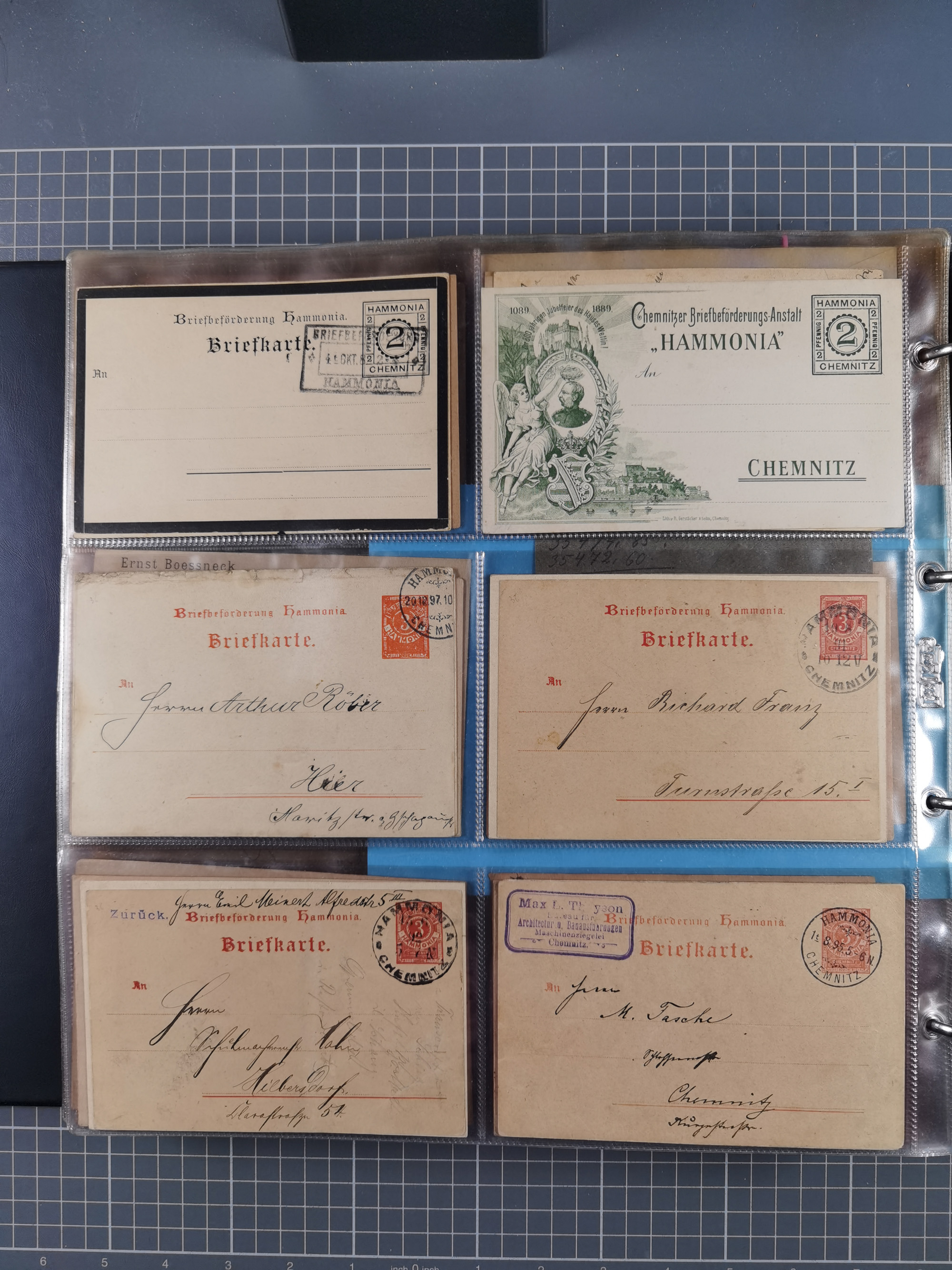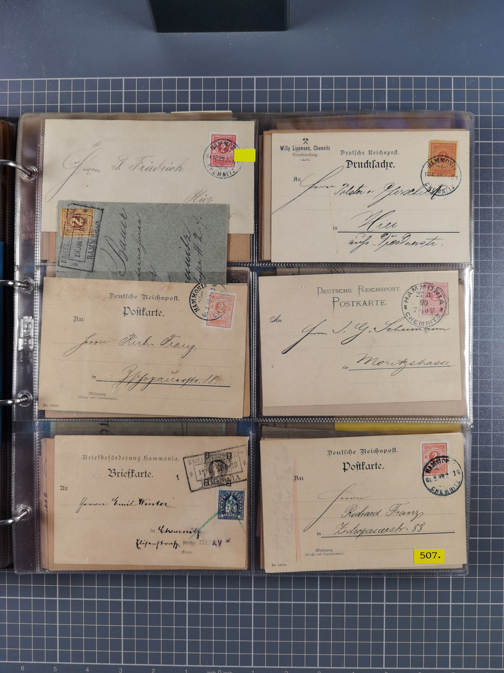 Chemnitz-HAMMONIA: 1897/1900, fast 60 Briefe, Karten und ungebrauchte/gestempelte Ganzsachen. Dabei u.a. Mi.-Nr. 28 auf Brief, PII gebraucht, P22 ungebrauch und P38 gebraucht