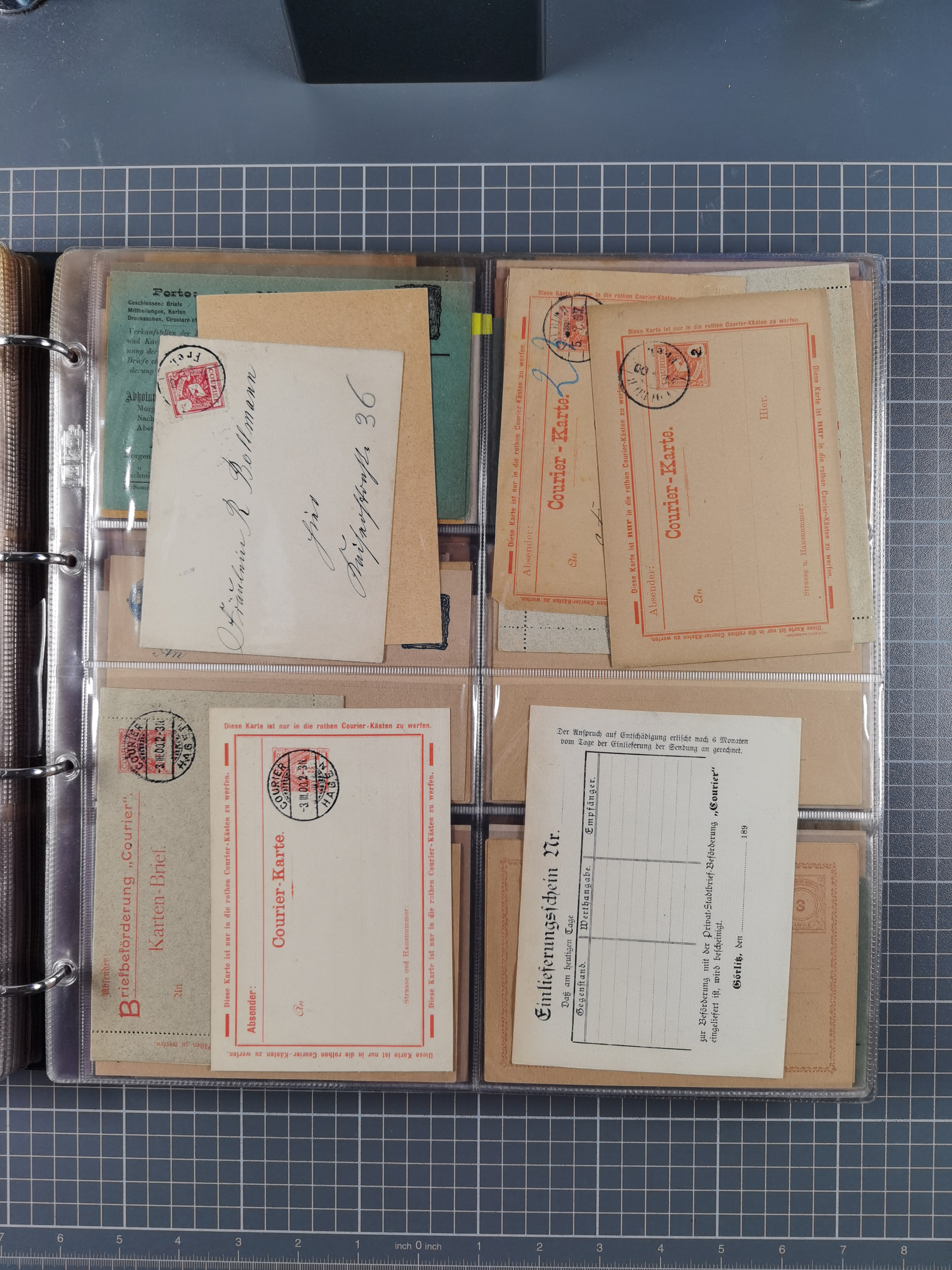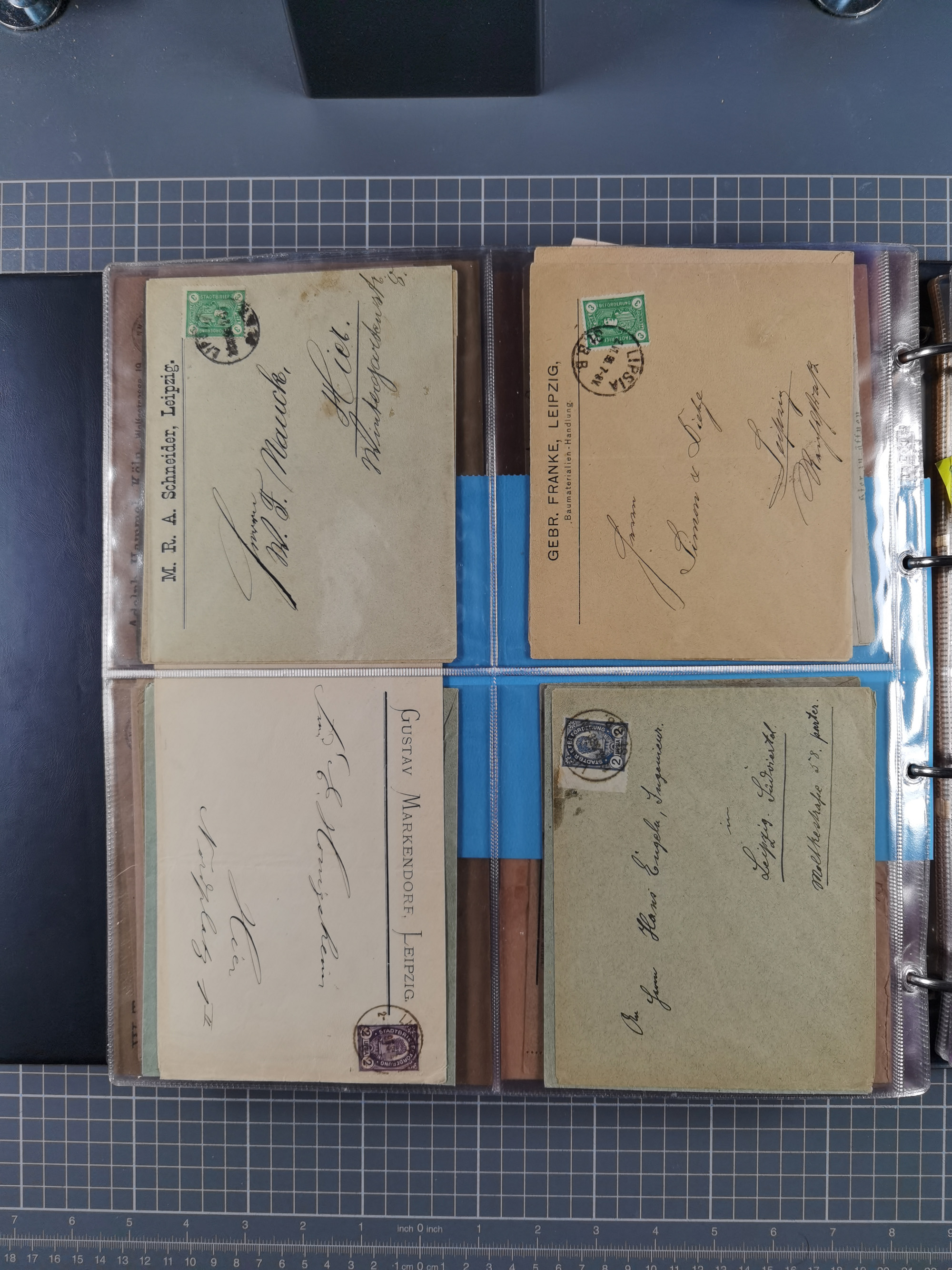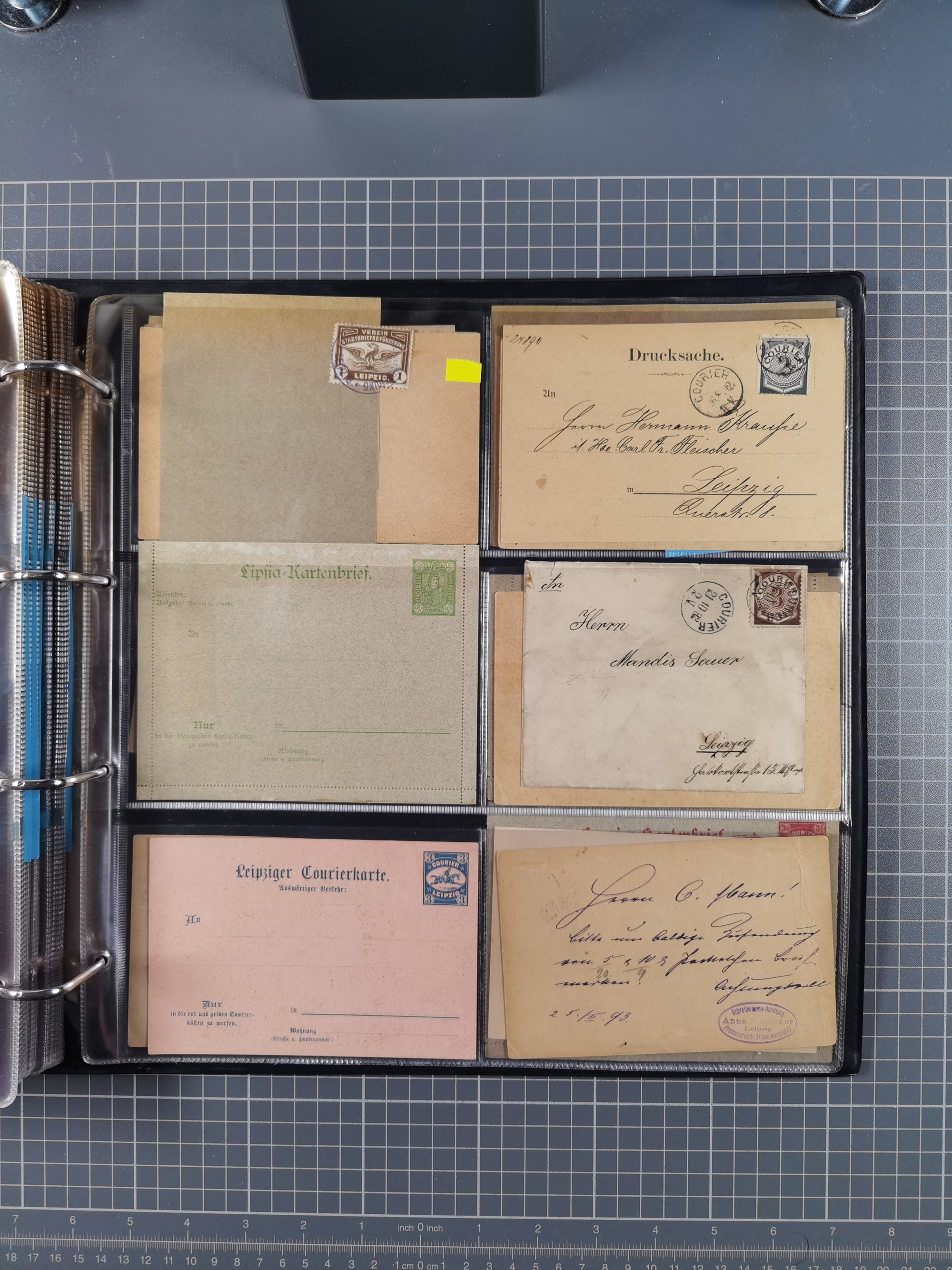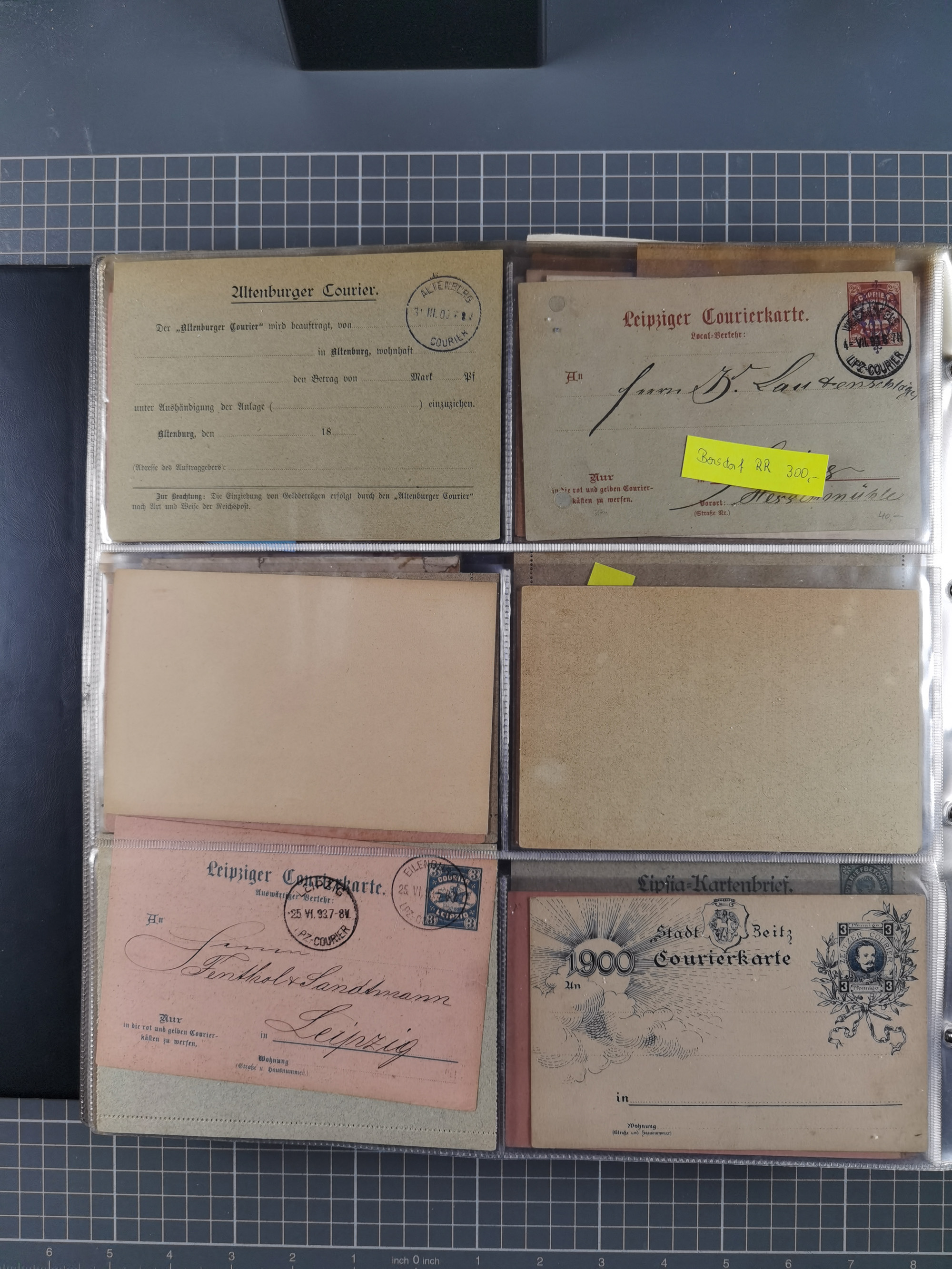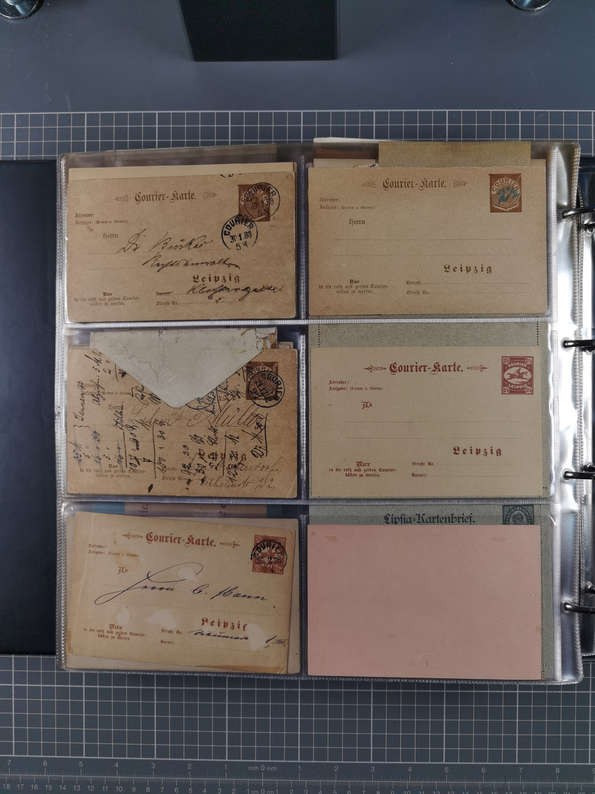 Leipzig: 1892/1900, über 100 Briefe, Karten und ungebrauchte und gebrauchte Ganzsachenkarten von fast allen Anstalten mit Schwerpunkt “Courier” und “Lipsia”. Dabei u.a. Courier Mi.-Nr. 1 und 2 mehrfach auf Briefen/Karten, P10 mit Stempel “EILENBURG” nach Leipzig und P19 mit Stempel “WEISSENFELS” (Aktenlochung links), LIPSIA mit Mi.-Nr. 11 auf Brief, vier Retour-Briefe mit Mi.-Nr. 19, K4 gebraucht und PU2 gebraucht und Leipziger Verkehrsanstalt mit u.a. Mi.-Nr. 6 auf Brief,