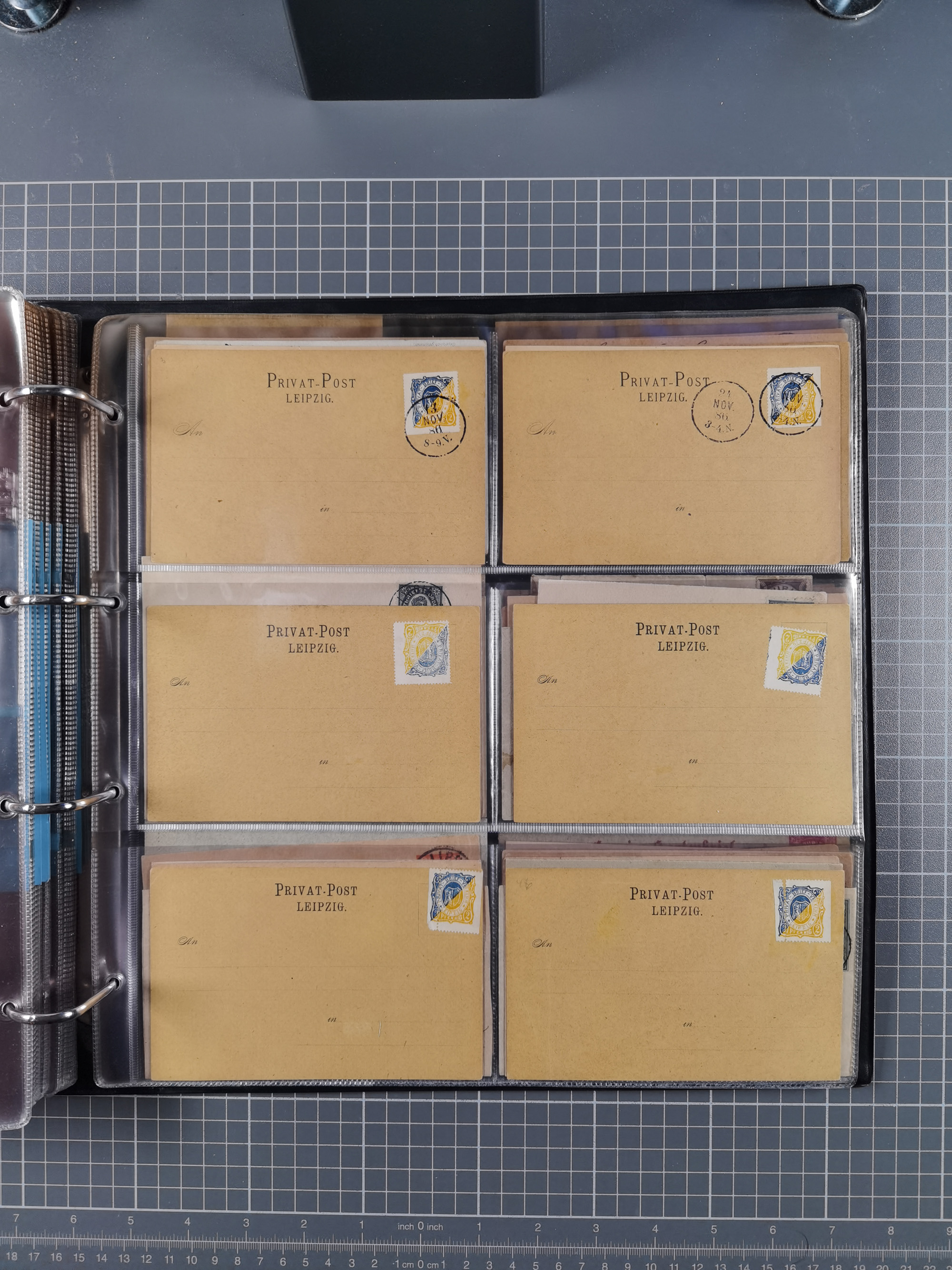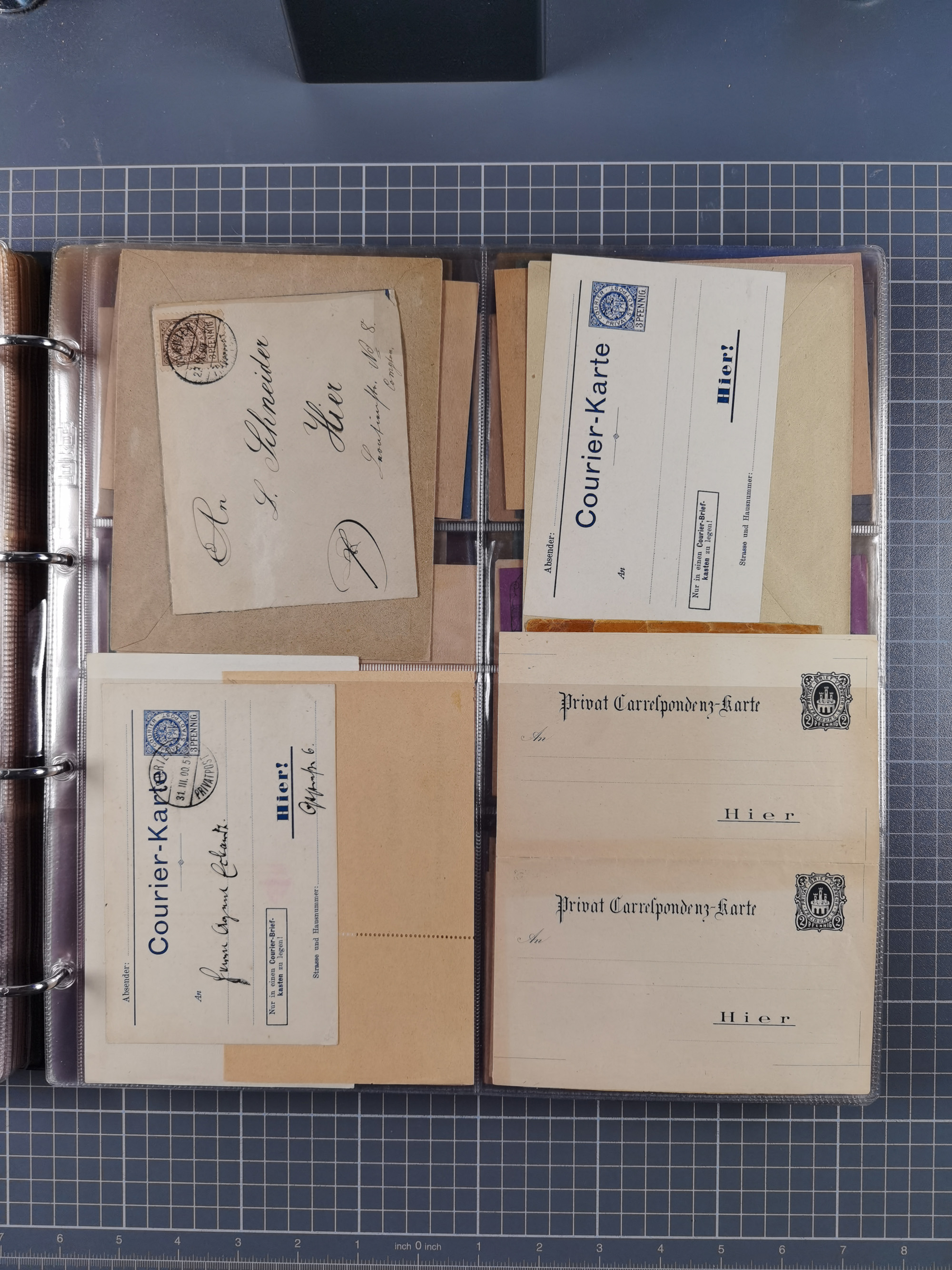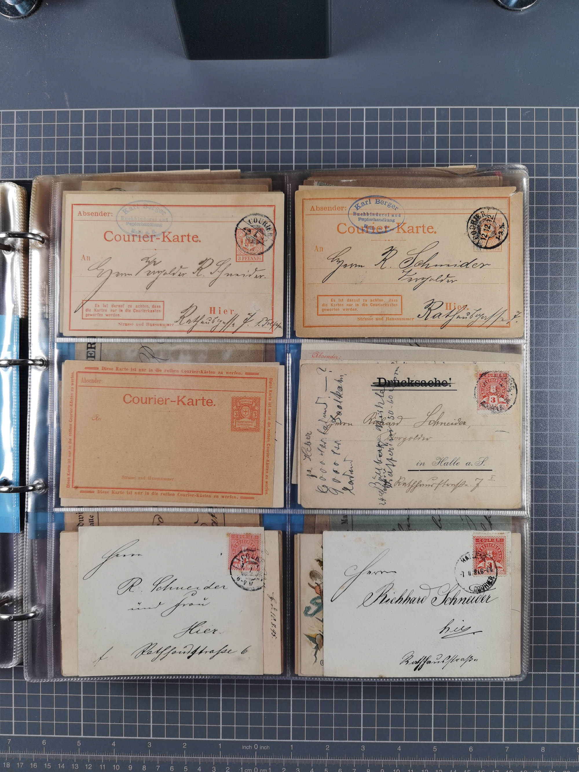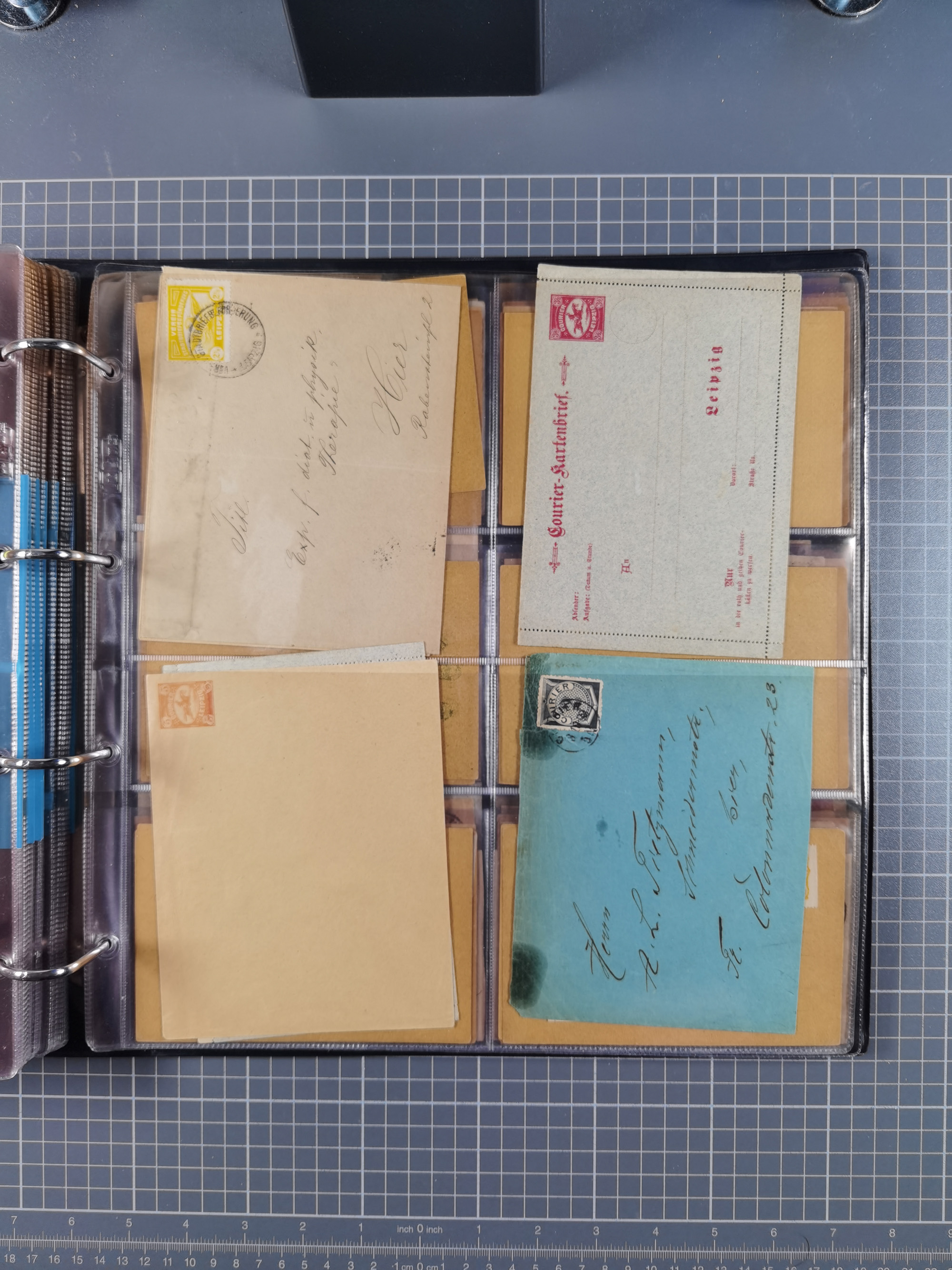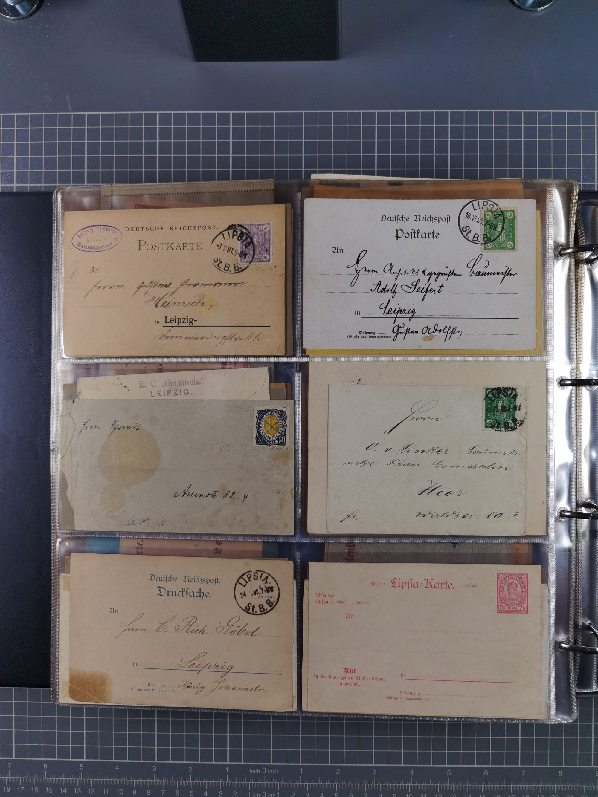 Leipzig: 1892/1900, über 100 Briefe, Karten und ungebrauchte und gebrauchte Ganzsachenkarten von fast allen Anstalten mit Schwerpunkt “Courier” und “Lipsia”. Dabei u.a. Courier Mi.-Nr. 1 und 2 mehrfach auf Briefen/Karten, P10 mit Stempel “EILENBURG” nach Leipzig und P19 mit Stempel “WEISSENFELS” (Aktenlochung links), LIPSIA mit Mi.-Nr. 11 auf Brief, vier Retour-Briefe mit Mi.-Nr. 19, K4 gebraucht und PU2 gebraucht und Leipziger Verkehrsanstalt mit u.a. Mi.-Nr. 6 auf Brief,