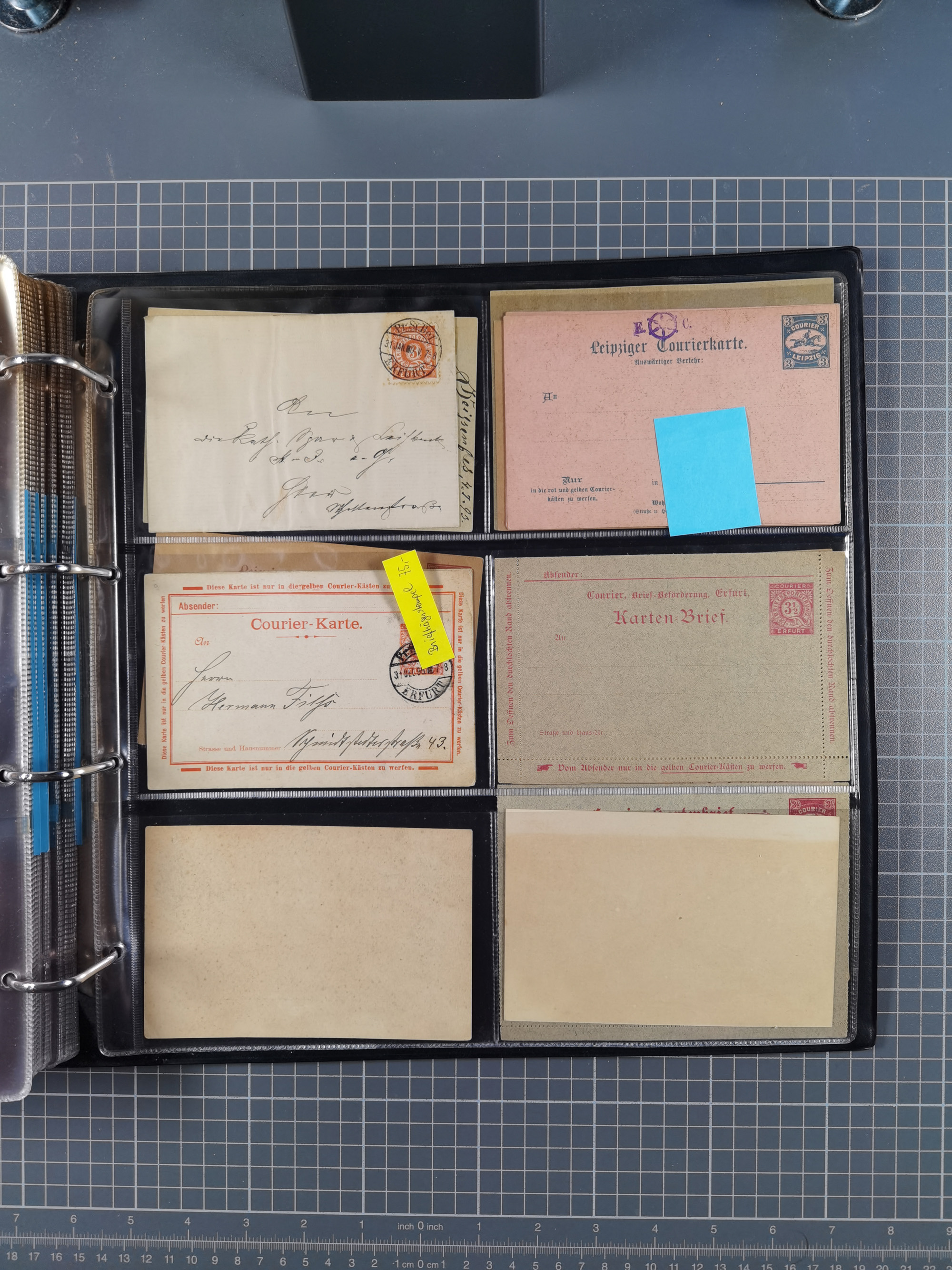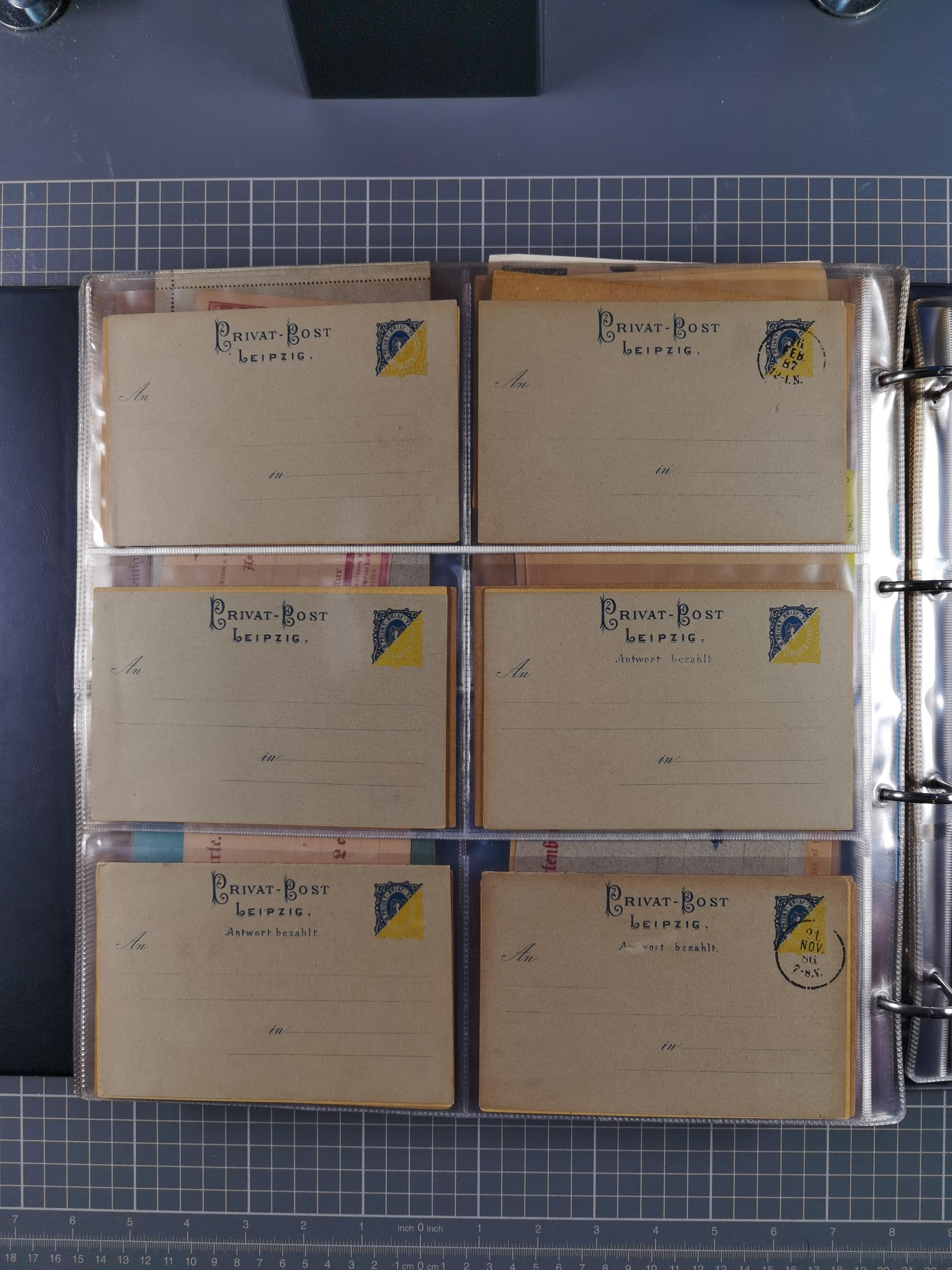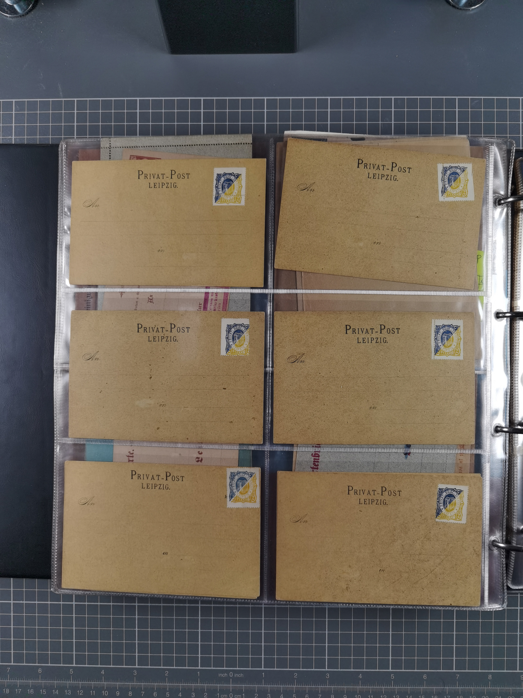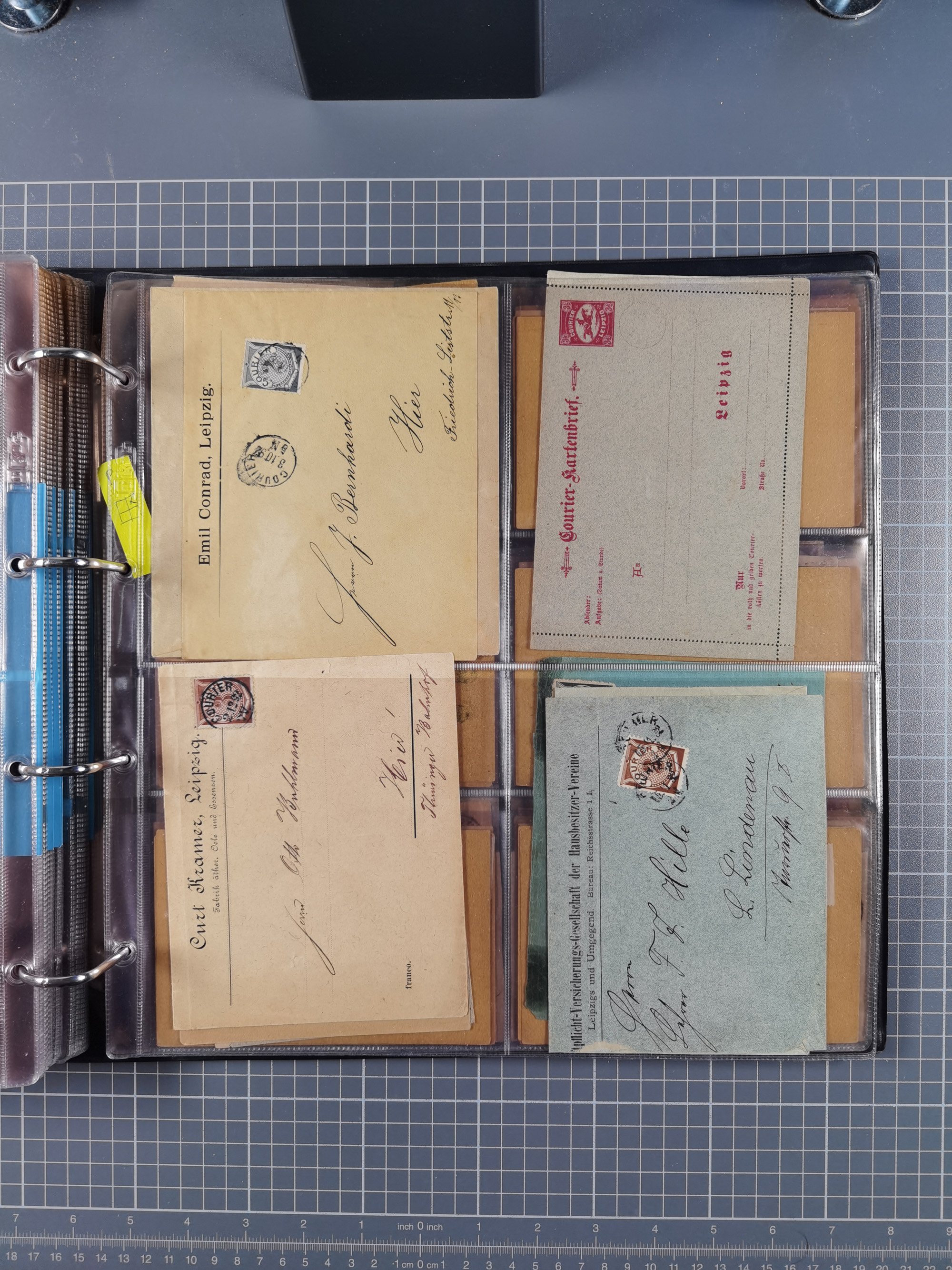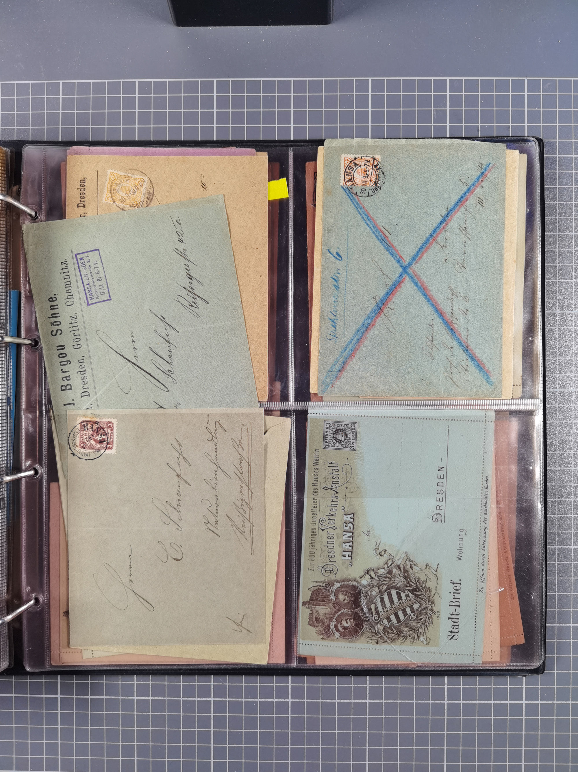 Leipzig: 1892/1900, über 100 Briefe, Karten und ungebrauchte und gebrauchte Ganzsachenkarten von fast allen Anstalten mit Schwerpunkt “Courier” und “Lipsia”. Dabei u.a. Courier Mi.-Nr. 1 und 2 mehrfach auf Briefen/Karten, P10 mit Stempel “EILENBURG” nach Leipzig und P19 mit Stempel “WEISSENFELS” (Aktenlochung links), LIPSIA mit Mi.-Nr. 11 auf Brief, vier Retour-Briefe mit Mi.-Nr. 19, K4 gebraucht und PU2 gebraucht und Leipziger Verkehrsanstalt mit u.a. Mi.-Nr. 6 auf Brief,