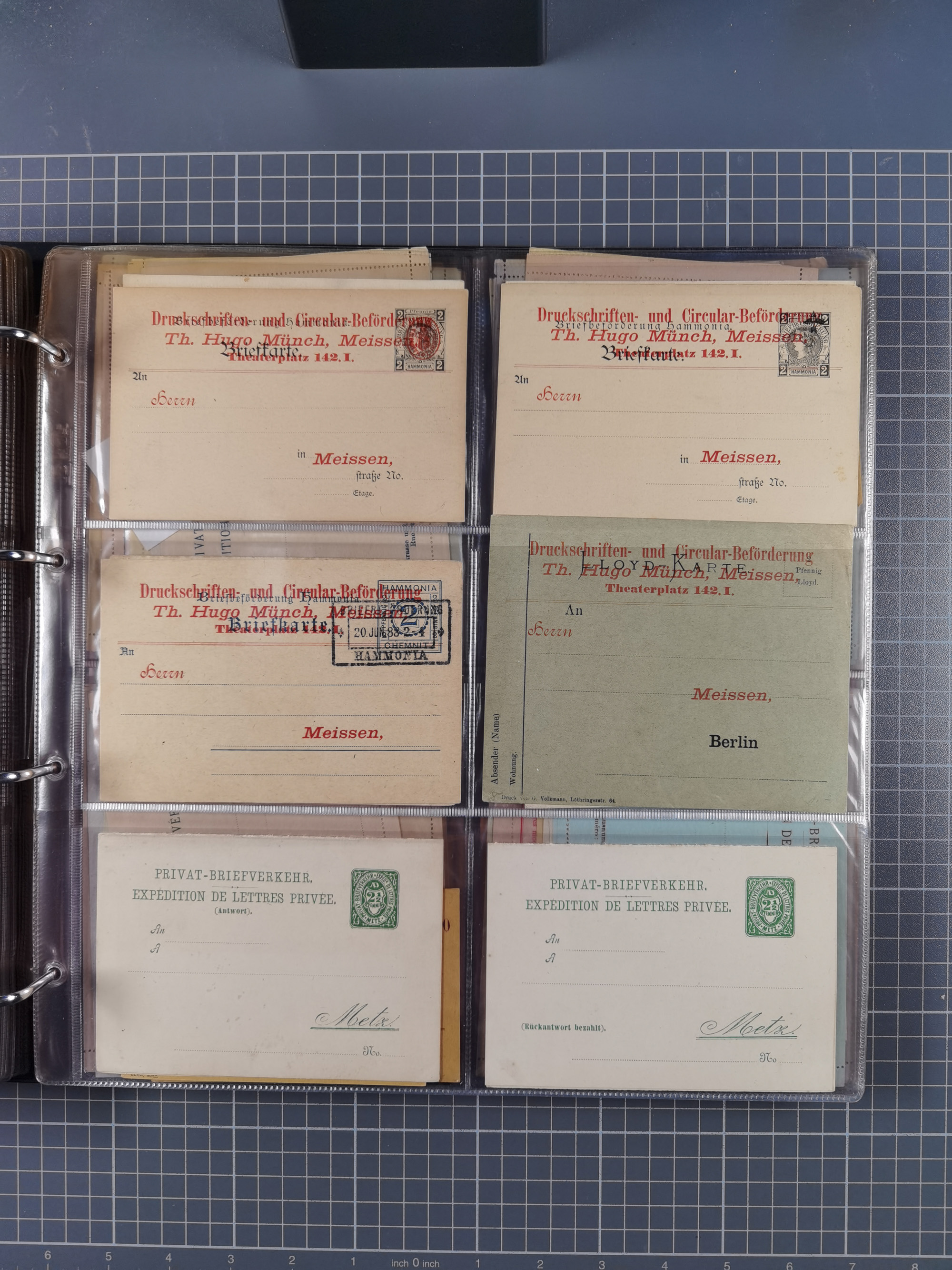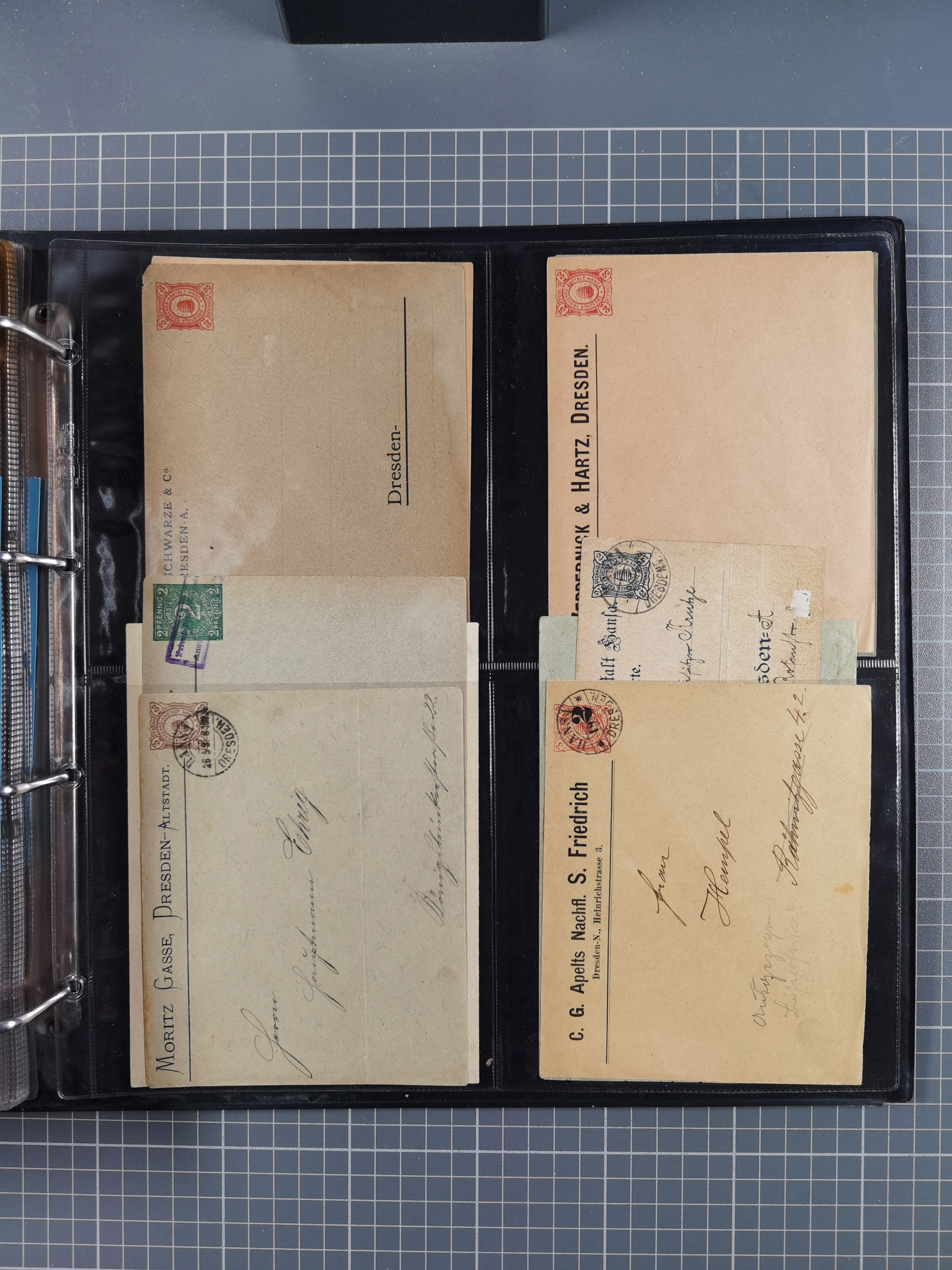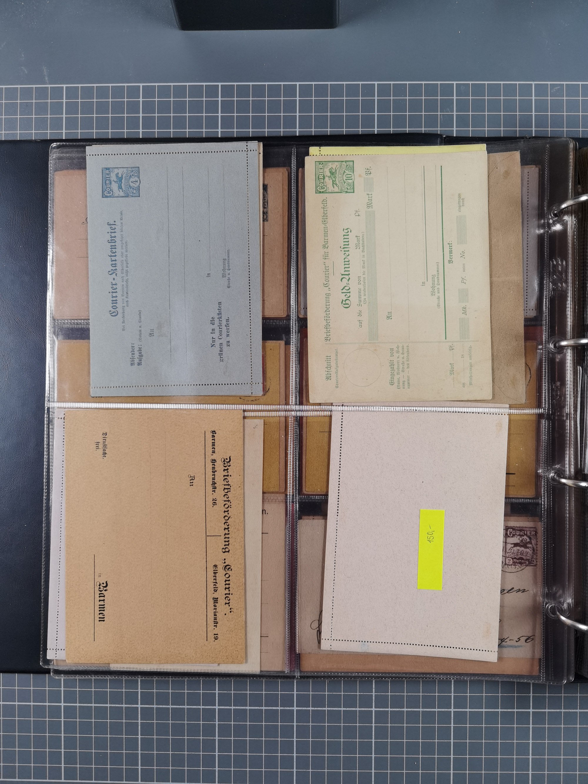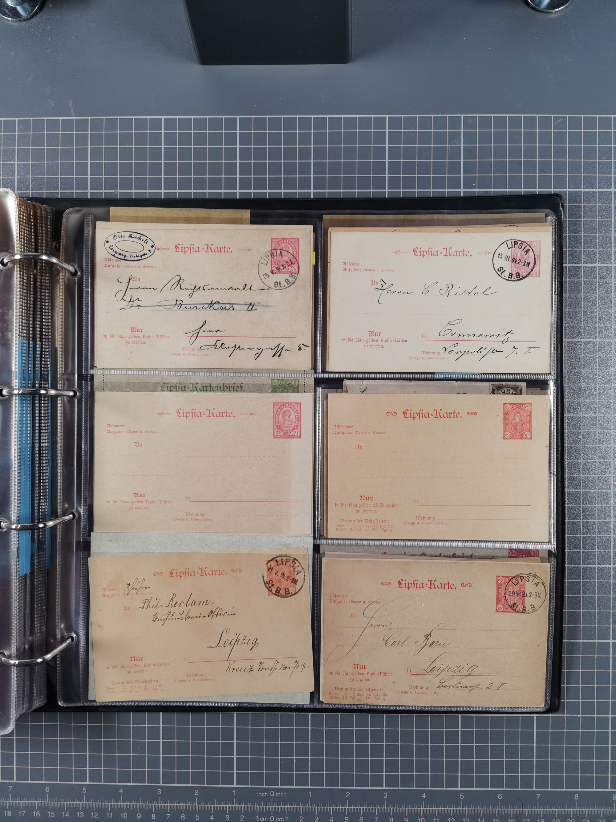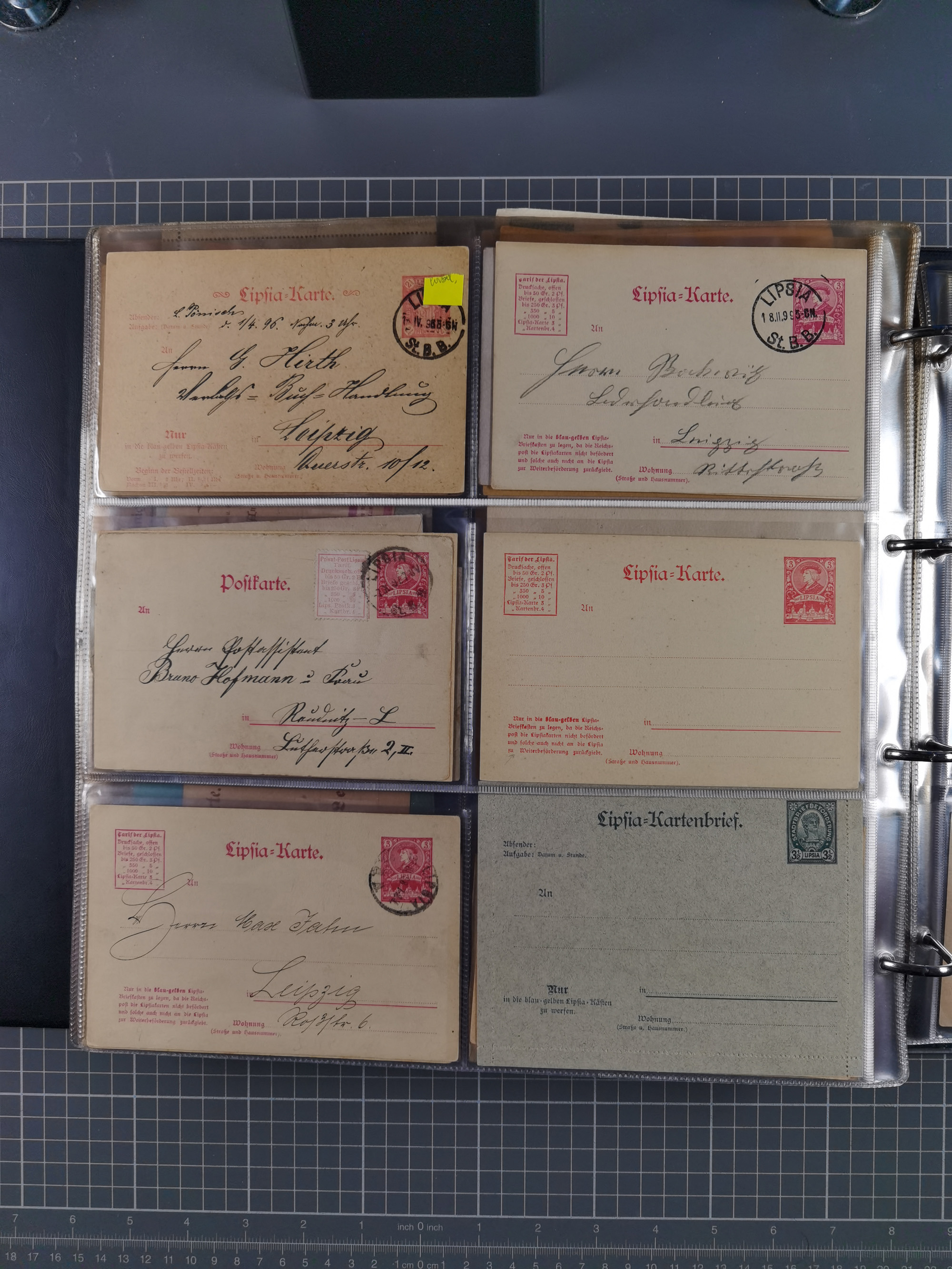 Leipzig: 1892/1900, über 100 Briefe, Karten und ungebrauchte und gebrauchte Ganzsachenkarten von fast allen Anstalten mit Schwerpunkt “Courier” und “Lipsia”. Dabei u.a. Courier Mi.-Nr. 1 und 2 mehrfach auf Briefen/Karten, P10 mit Stempel “EILENBURG” nach Leipzig und P19 mit Stempel “WEISSENFELS” (Aktenlochung links), LIPSIA mit Mi.-Nr. 11 auf Brief, vier Retour-Briefe mit Mi.-Nr. 19, K4 gebraucht und PU2 gebraucht und Leipziger Verkehrsanstalt mit u.a. Mi.-Nr. 6 auf Brief,