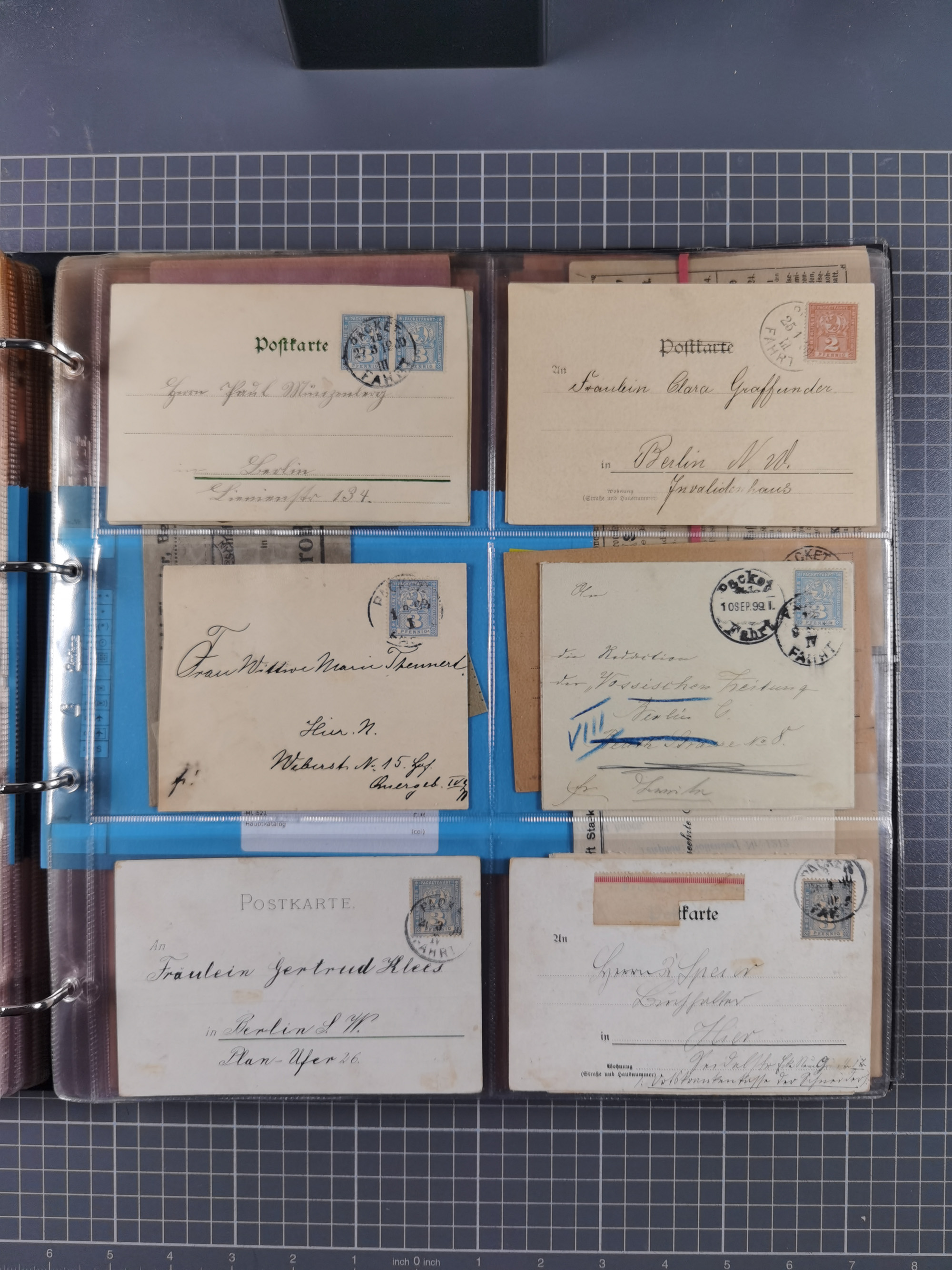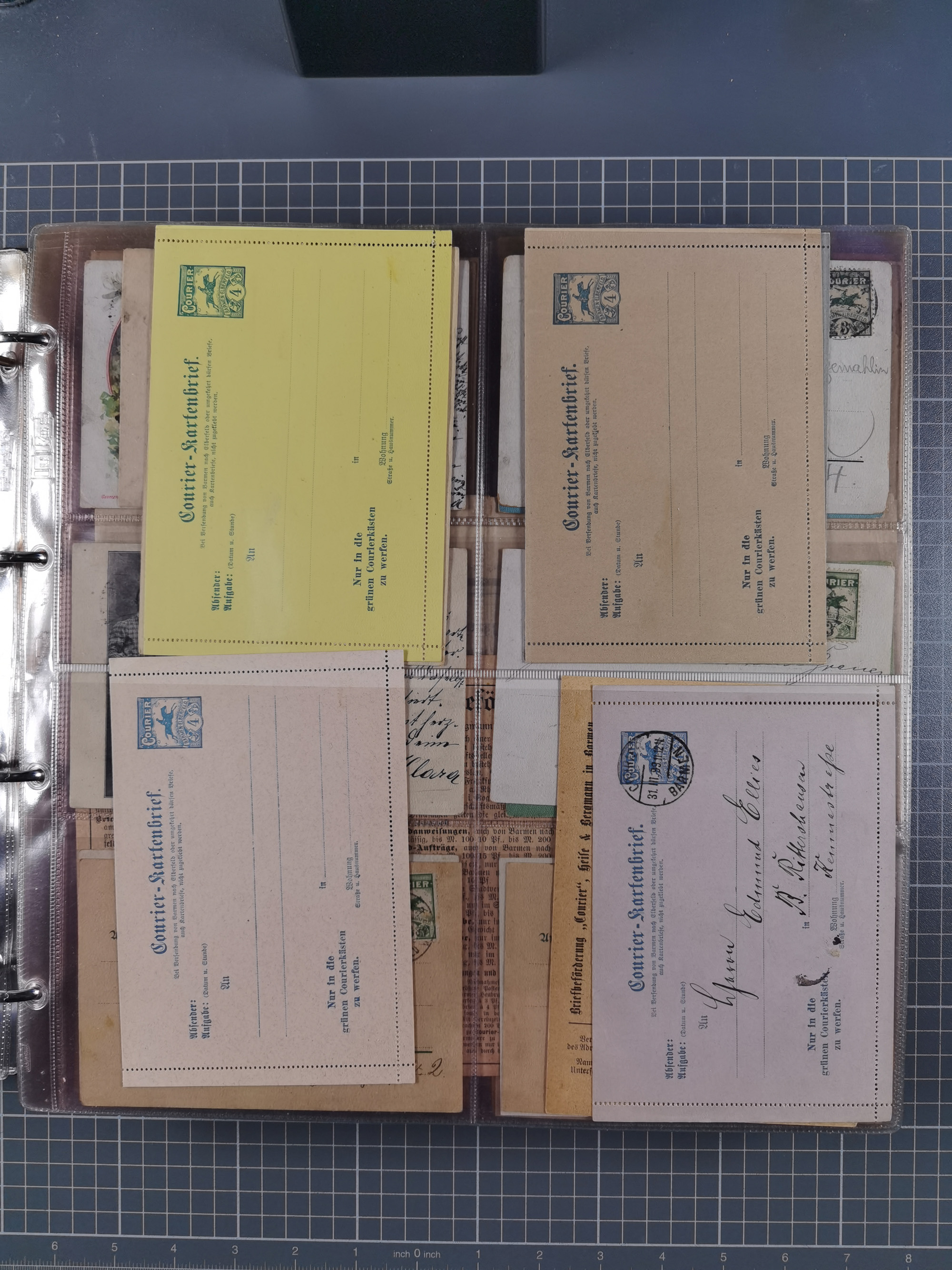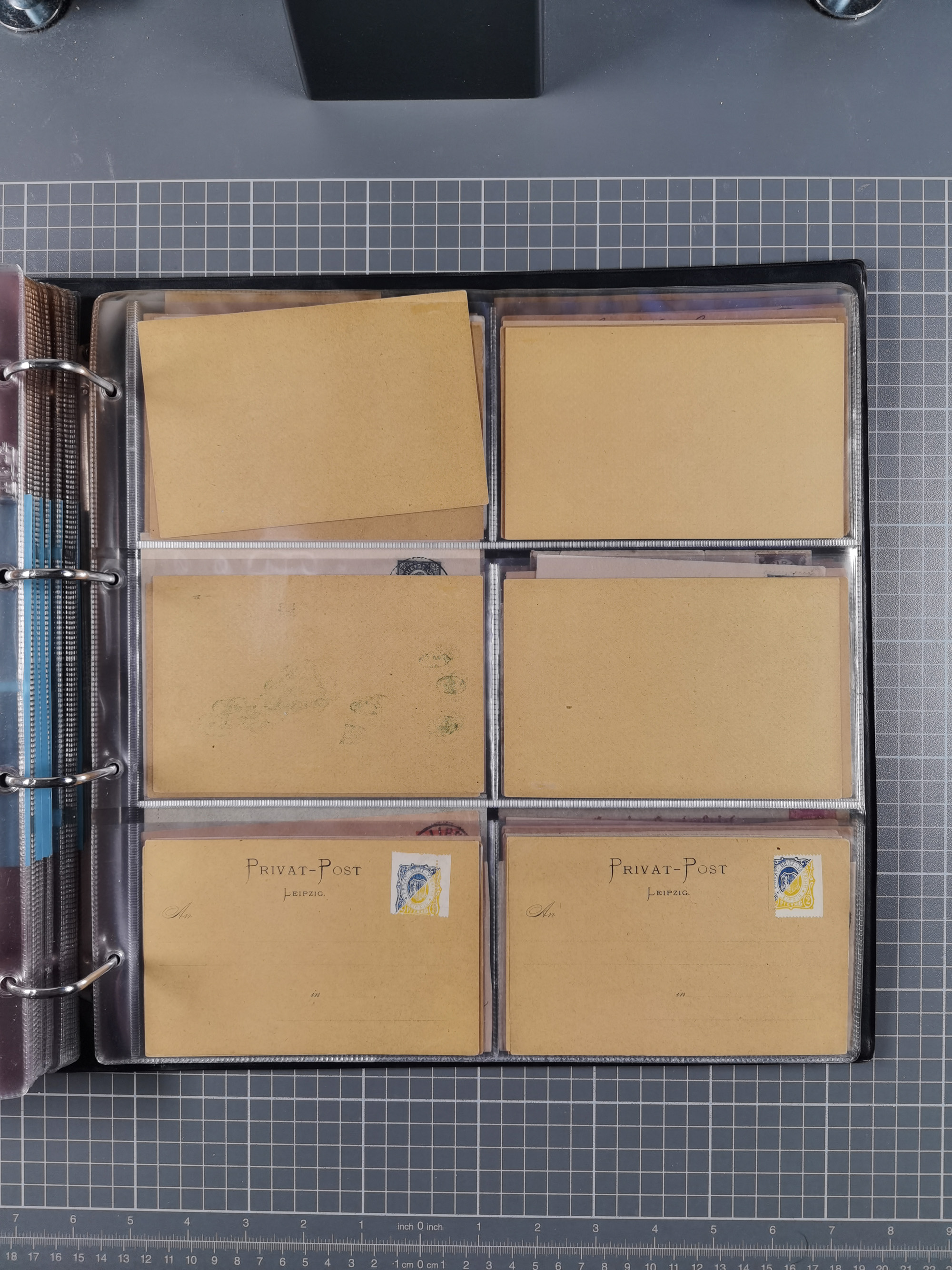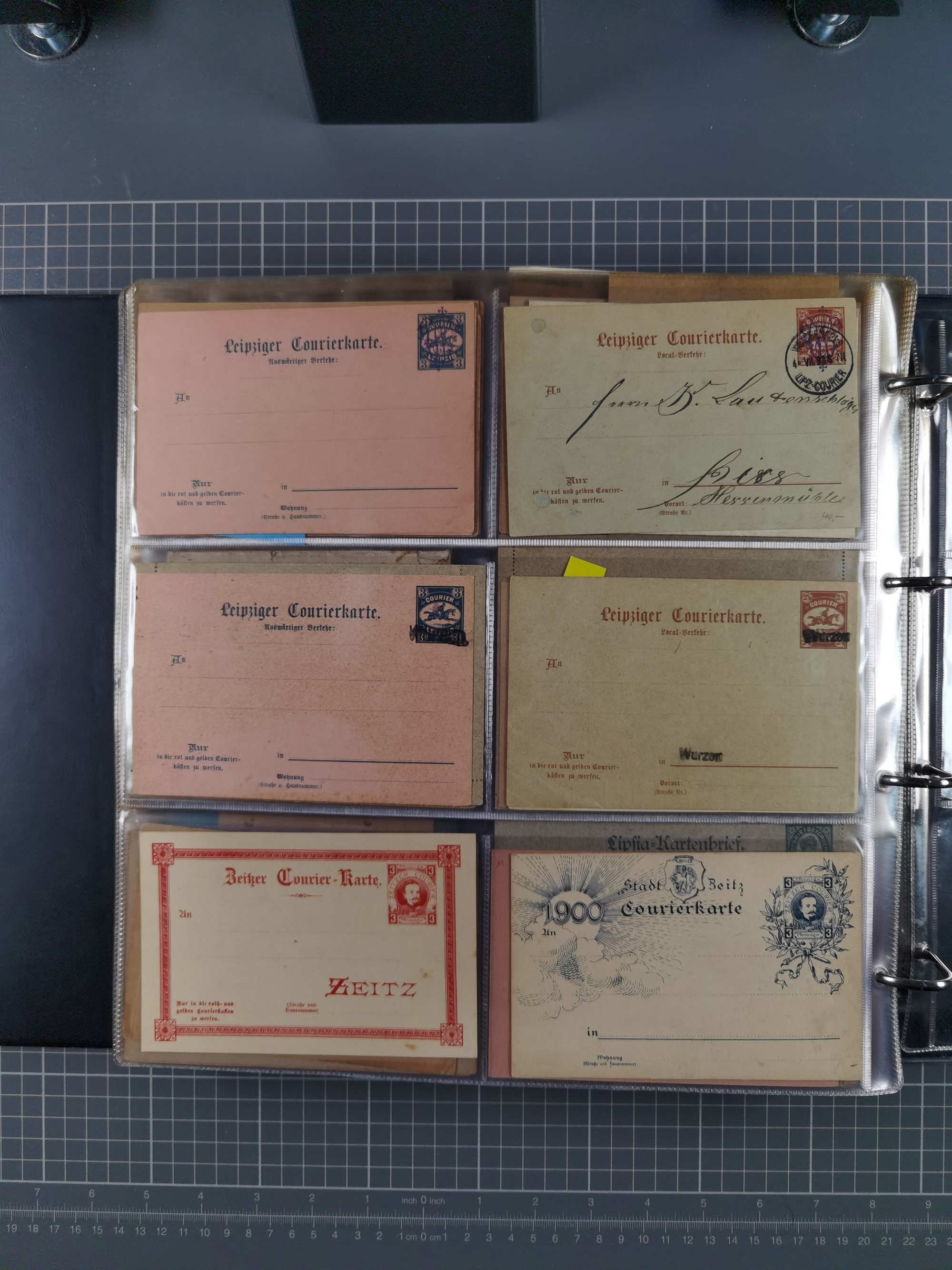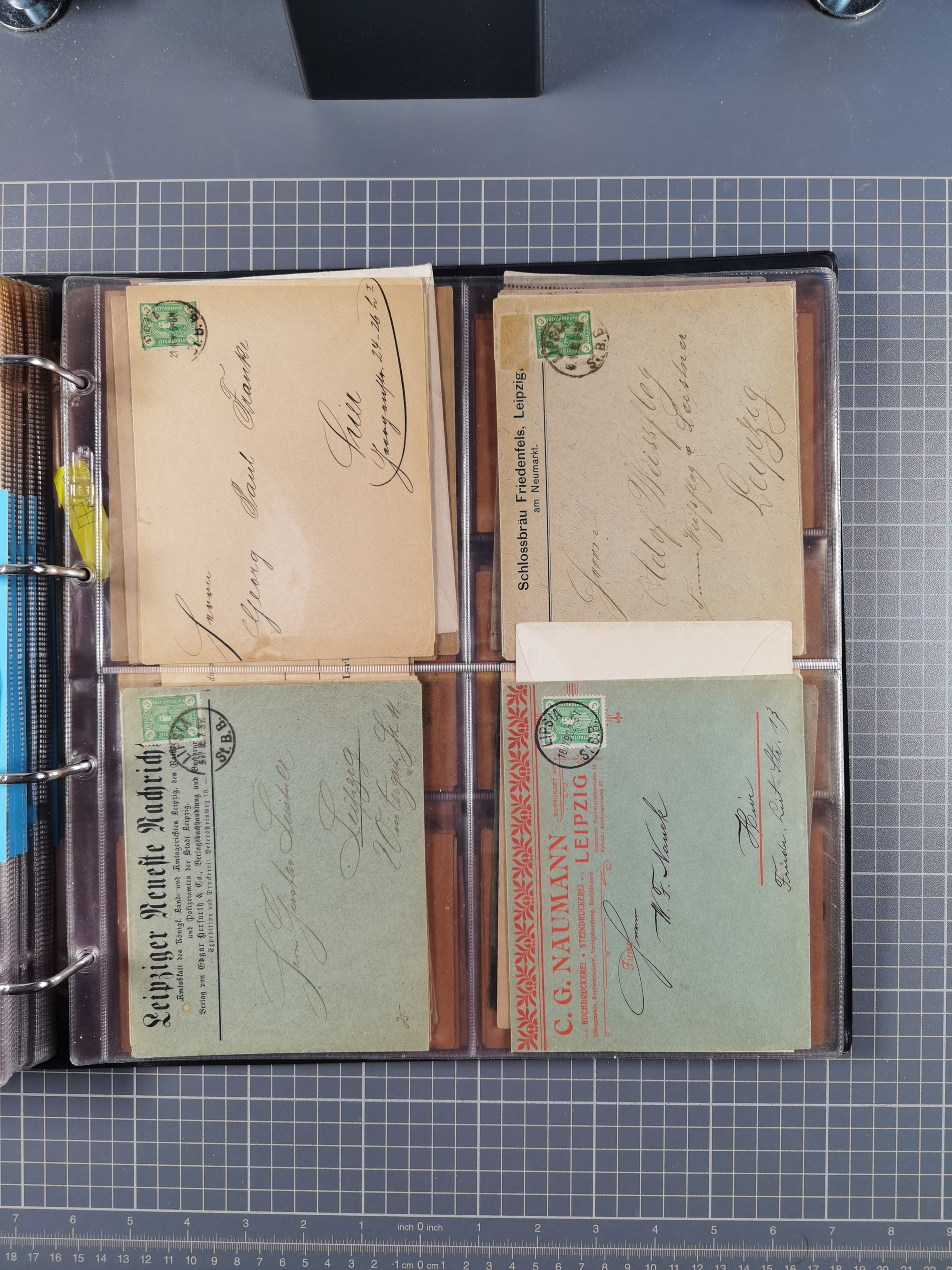 Leipzig: 1892/1900, über 100 Briefe, Karten und ungebrauchte und gebrauchte Ganzsachenkarten von fast allen Anstalten mit Schwerpunkt “Courier” und “Lipsia”. Dabei u.a. Courier Mi.-Nr. 1 und 2 mehrfach auf Briefen/Karten, P10 mit Stempel “EILENBURG” nach Leipzig und P19 mit Stempel “WEISSENFELS” (Aktenlochung links), LIPSIA mit Mi.-Nr. 11 auf Brief, vier Retour-Briefe mit Mi.-Nr. 19, K4 gebraucht und PU2 gebraucht und Leipziger Verkehrsanstalt mit u.a. Mi.-Nr. 6 auf Brief,