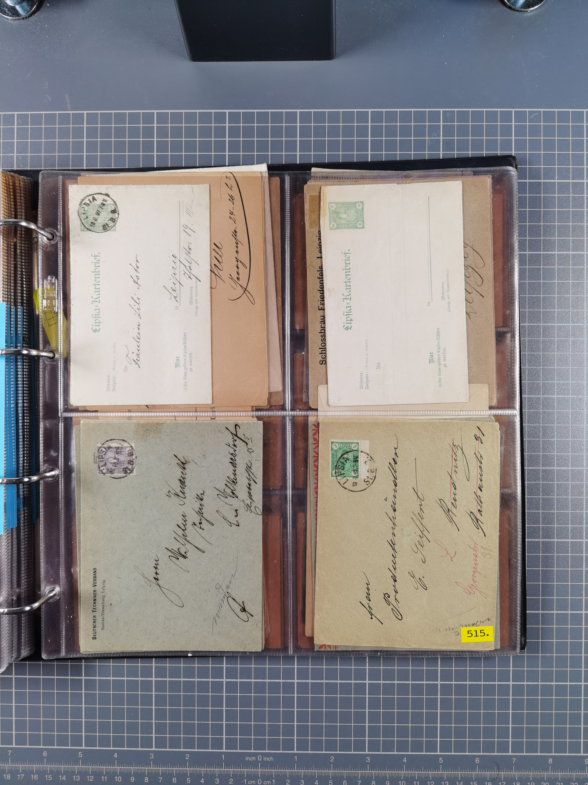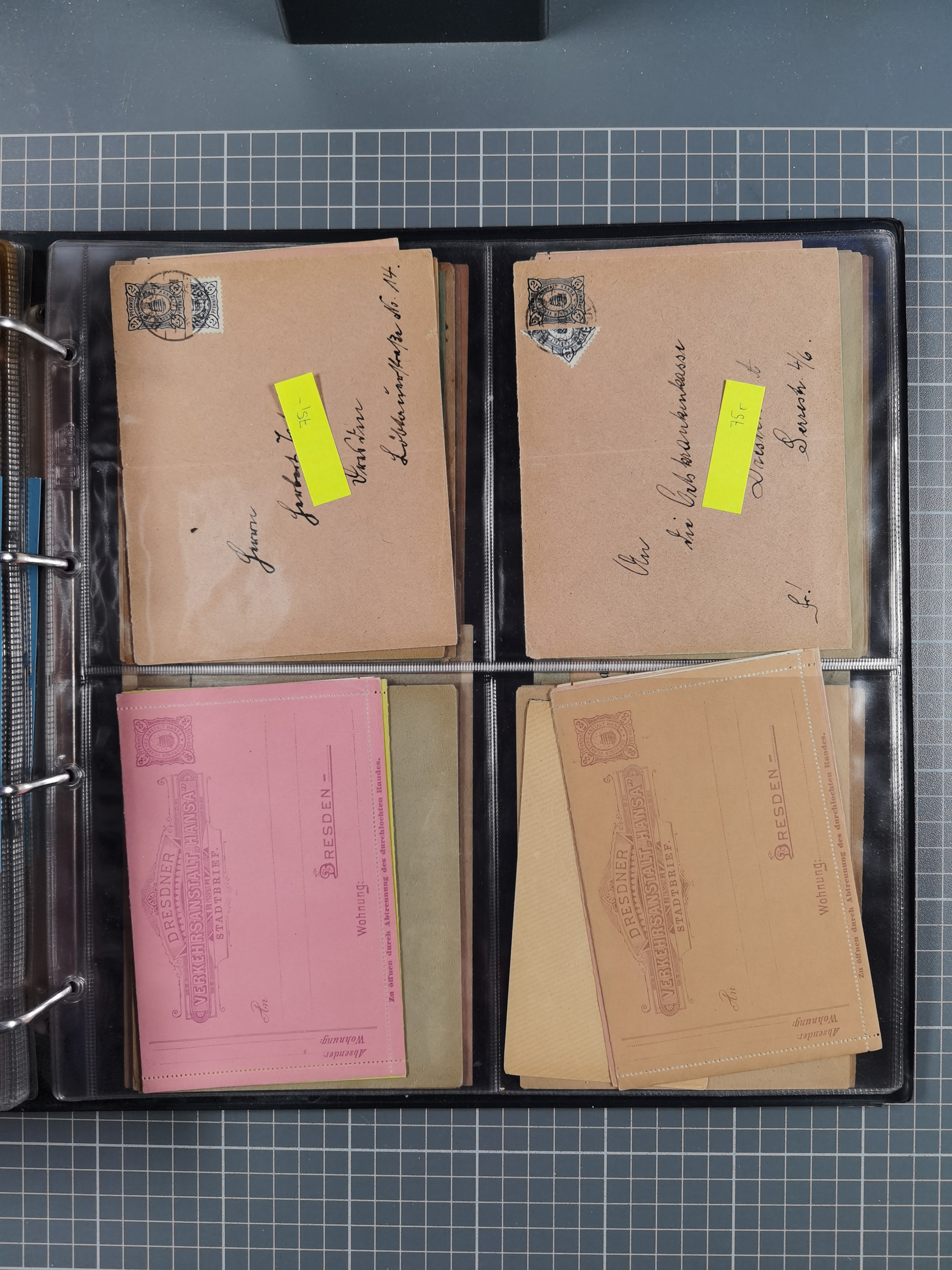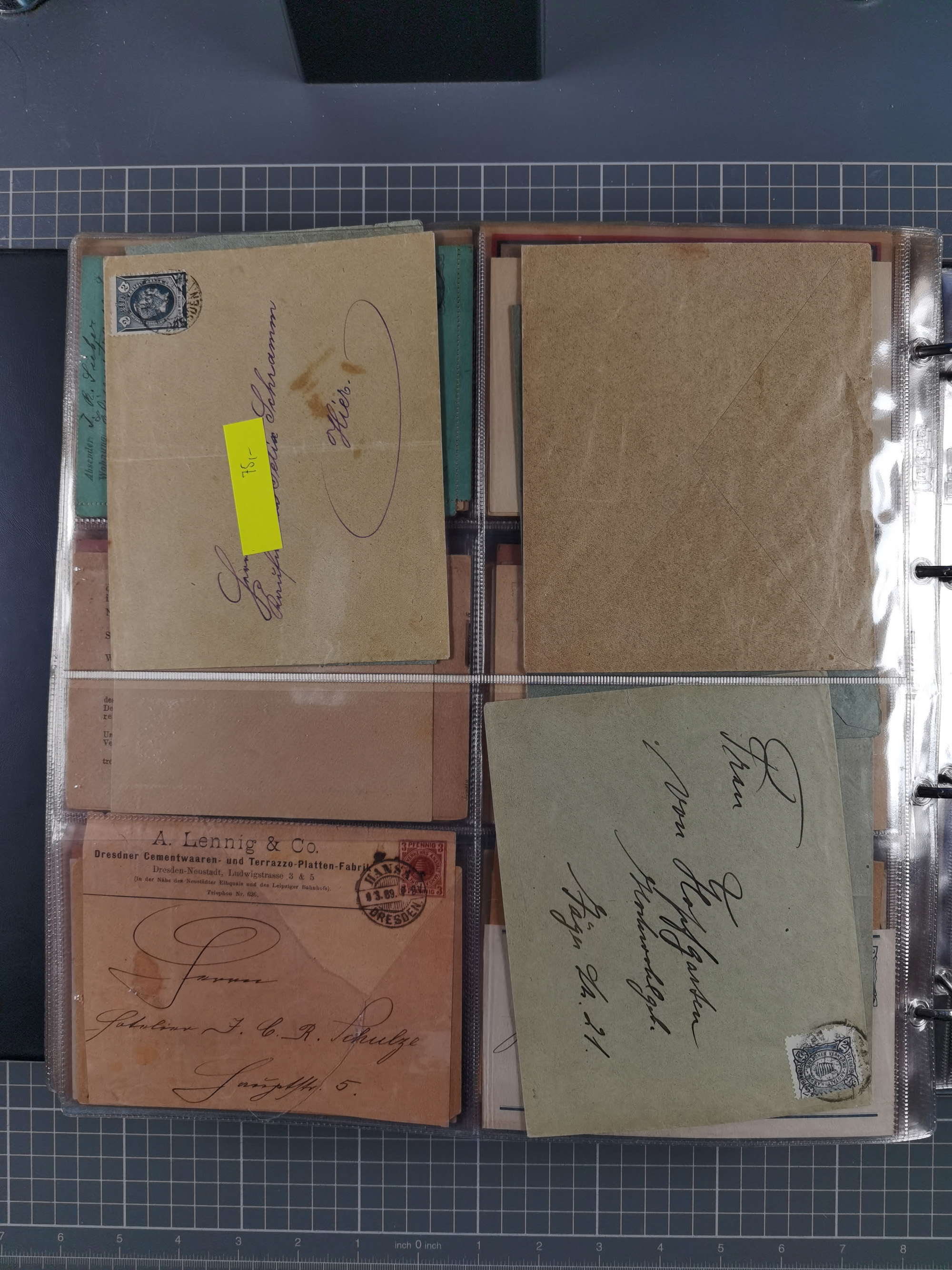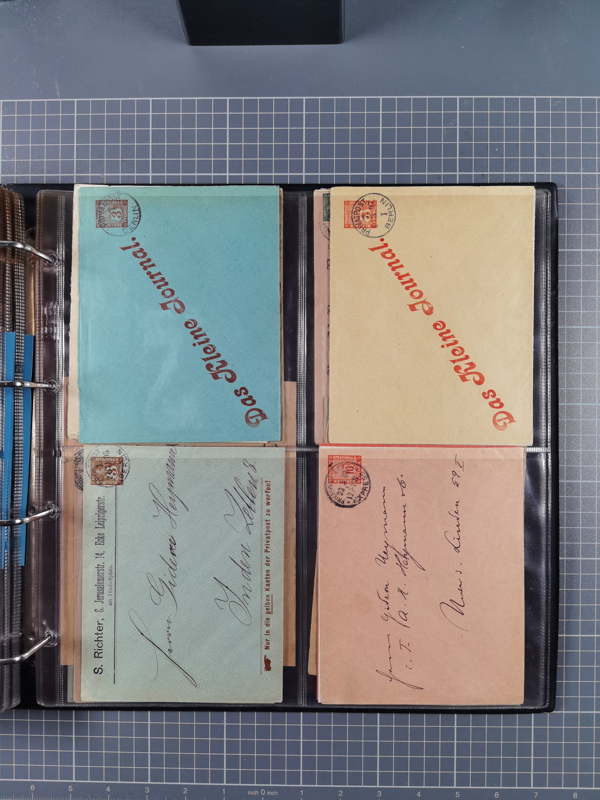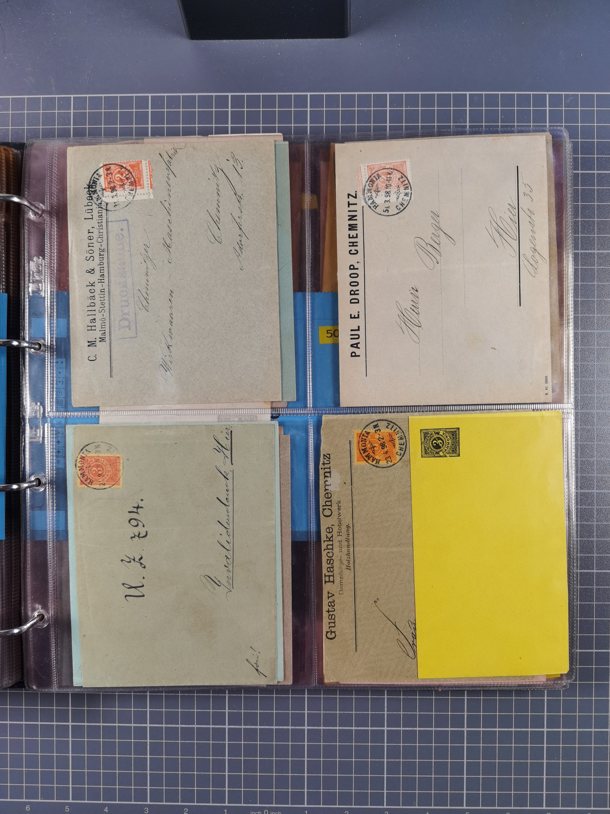 Leipzig: 1892/1900, über 100 Briefe, Karten und ungebrauchte und gebrauchte Ganzsachenkarten von fast allen Anstalten mit Schwerpunkt “Courier” und “Lipsia”. Dabei u.a. Courier Mi.-Nr. 1 und 2 mehrfach auf Briefen/Karten, P10 mit Stempel “EILENBURG” nach Leipzig und P19 mit Stempel “WEISSENFELS” (Aktenlochung links), LIPSIA mit Mi.-Nr. 11 auf Brief, vier Retour-Briefe mit Mi.-Nr. 19, K4 gebraucht und PU2 gebraucht und Leipziger Verkehrsanstalt mit u.a. Mi.-Nr. 6 auf Brief,