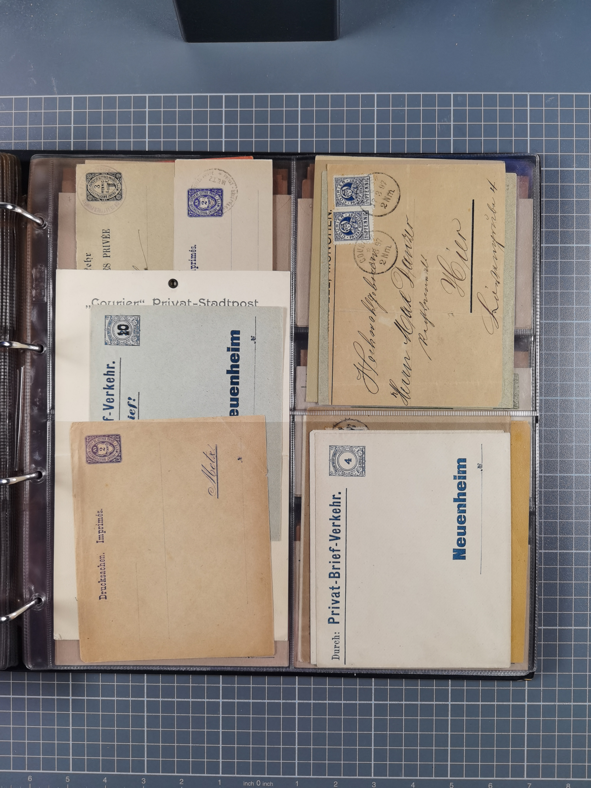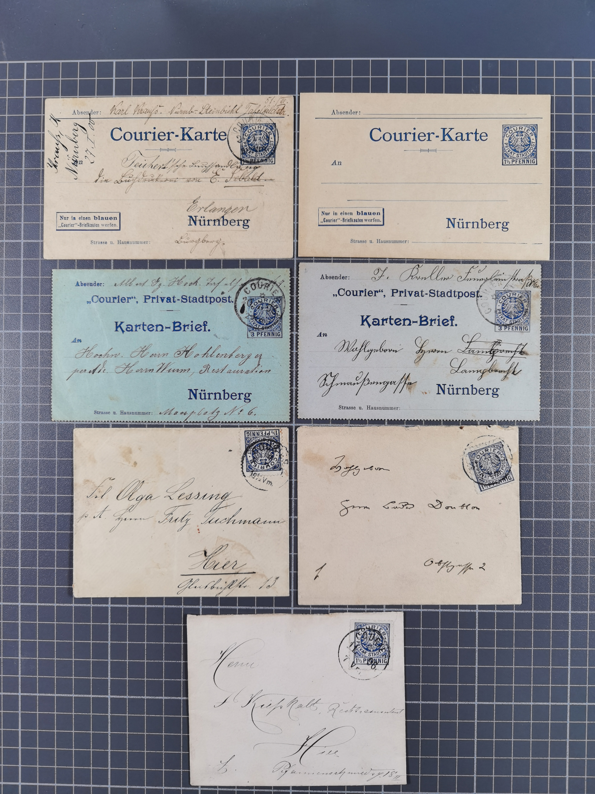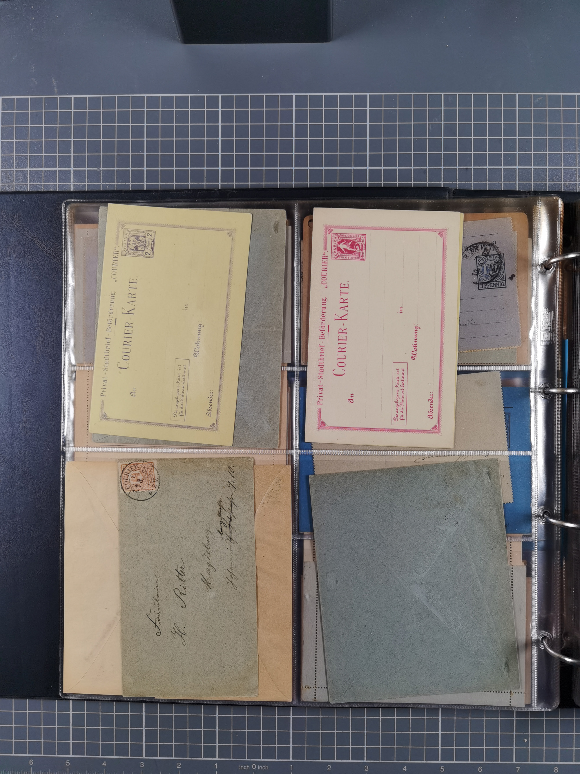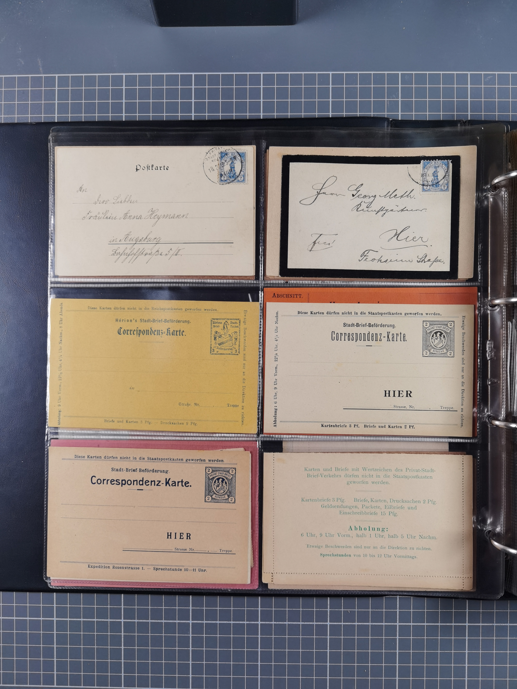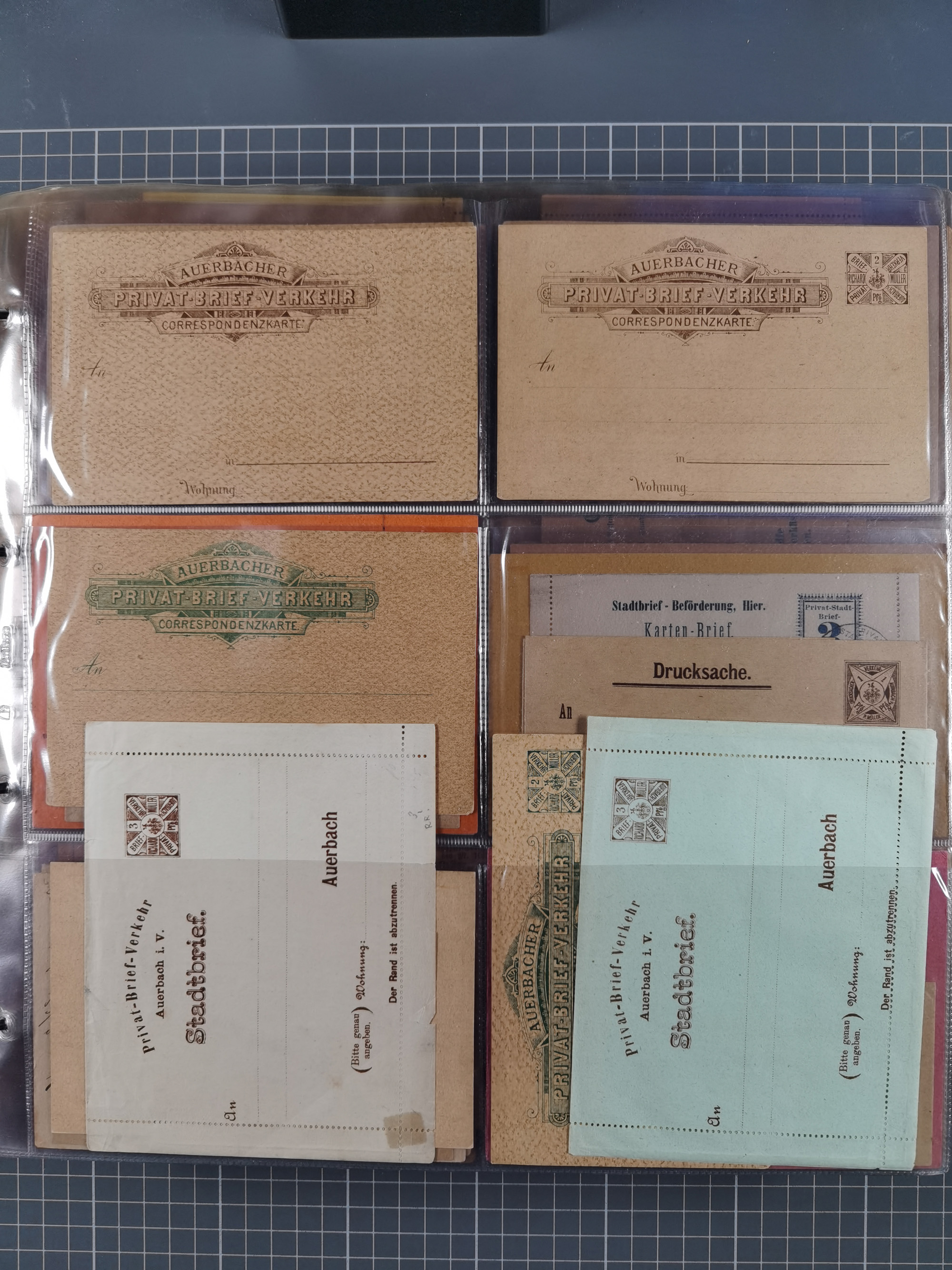 Auerbach bis Zittau: 1886/1900, umfangreiche Sammlung mit über 550 Briefen, Karten sowie ungebrauchten und gebrauchten Ganzsachen und einigen Formularen. Dabei u.a. Augsburg mit K3 gebraucht, Bamberg mit Mi.-Nr. 4 auf drei Briefen/Postkarten, Bonn mit Ganzsachen mit Firmen-Absendern, Dortmund mit P1 gebraucht (kleine Randfehler), Duisburg mit etwas fehlerhafter P2 gebraucht, Kassel Mi.-Nr. 14 auf Postkarte, Krefeld-Express-Beförderung Mi.-Nr. 5 auf Briefvorderseite, Mönchengladbach Courier Mi.-Nr. 4 auf Brief, Offenbach Privat-Post-Verkehr P1 gebraucht, Rostock K1 gebraucht, Worms K1 als Vorderseite gebraucht und Zittau P3 gebraucht mit Text. Die Erhaltung ist zum Teil leicht fehlerhaft, meist aber einwandfrei